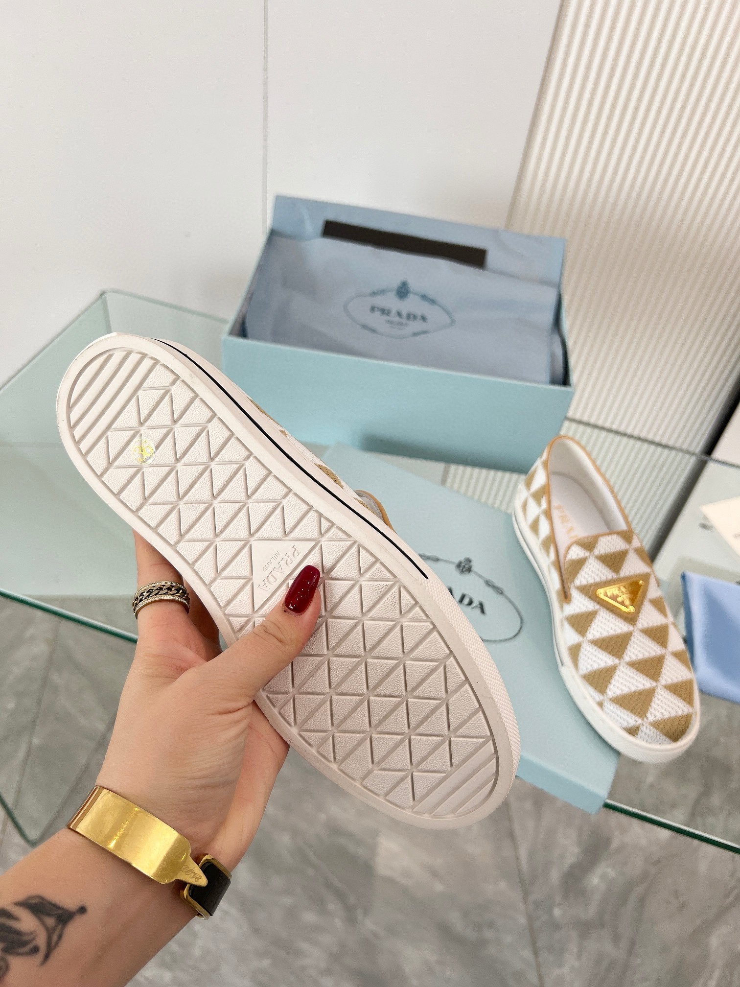 The graphic design concept that has always characterized Prada collections is reflected in these sporty slip-on shoes. The shoe is embellished with a reinterpretation of the iconic triangle, reinvented as a graphic pattern through the embroidered fabric.