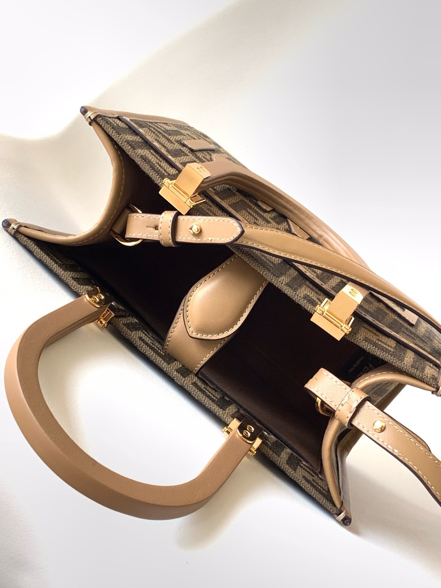 The Small Sunshine shopper bag made of fabric with jacquard FF motif and sand-colored leather FENDI ROMA lettering. Sand-colored plexiglass stiff handles.Features a spacious lined internal compartment, edges in sand-colored leather and gold-finish metalware. Can be carried by hand or worn on the shoulder thanks to the two handles and detachable shoulder strap.