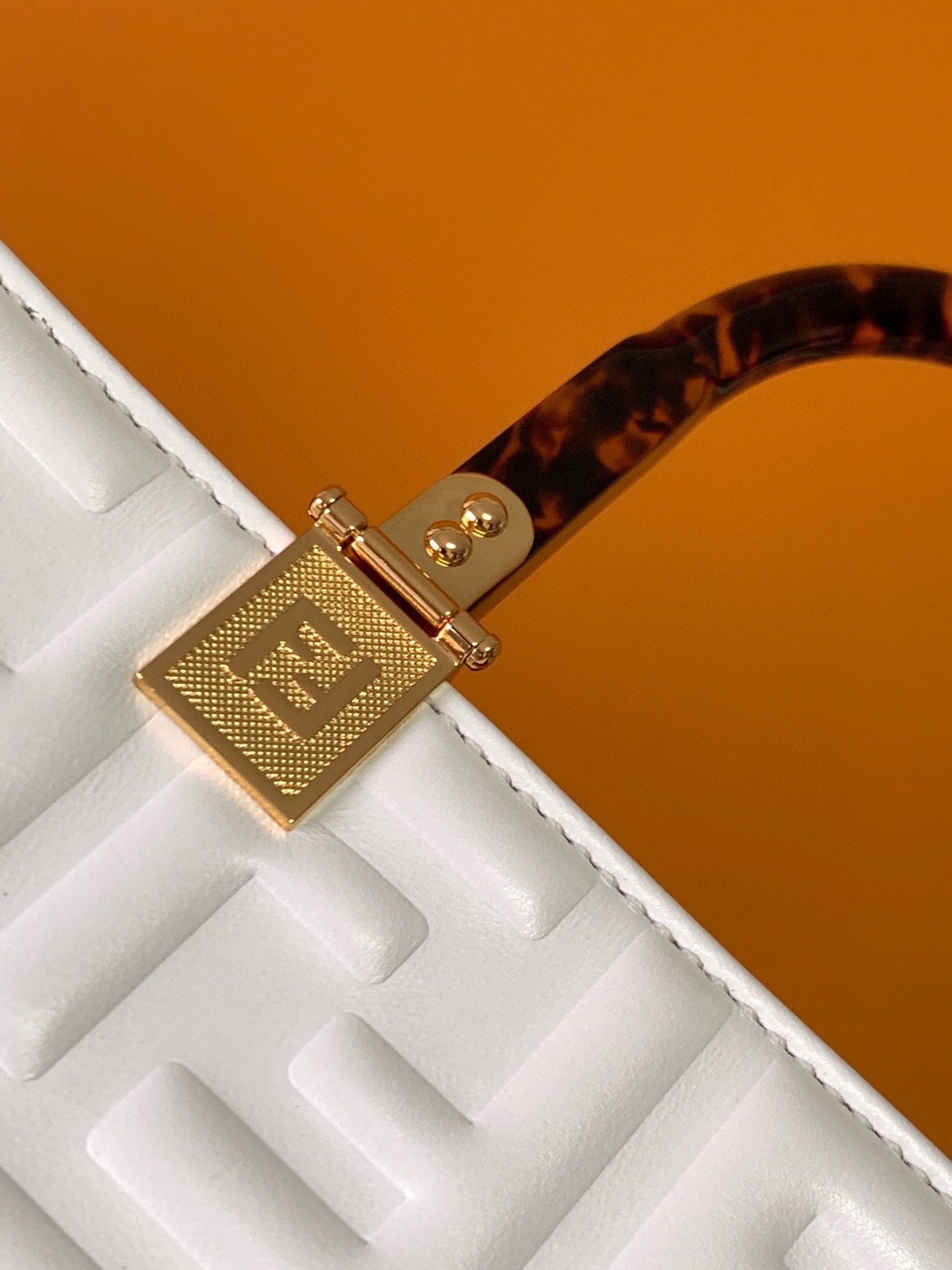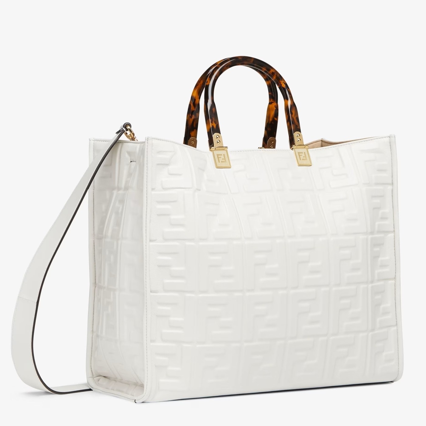 Medium Sunshine Shopper bag made of calf leather with raised 3D-texture FF motif and rigid tortoiseshell-effect plexiglass handles. Features a spacious lined internal compartment, edges in tone on tone leather, and gold-finish metalware. Can be carried by hand or worn on the shoulder thanks to the two handles and detachable shoulder strap.