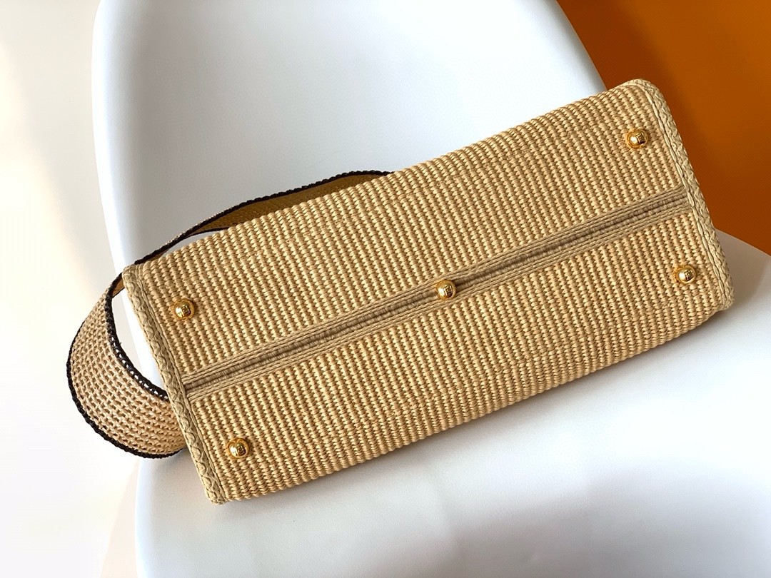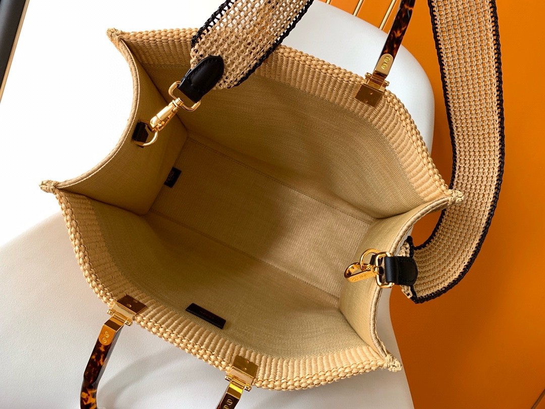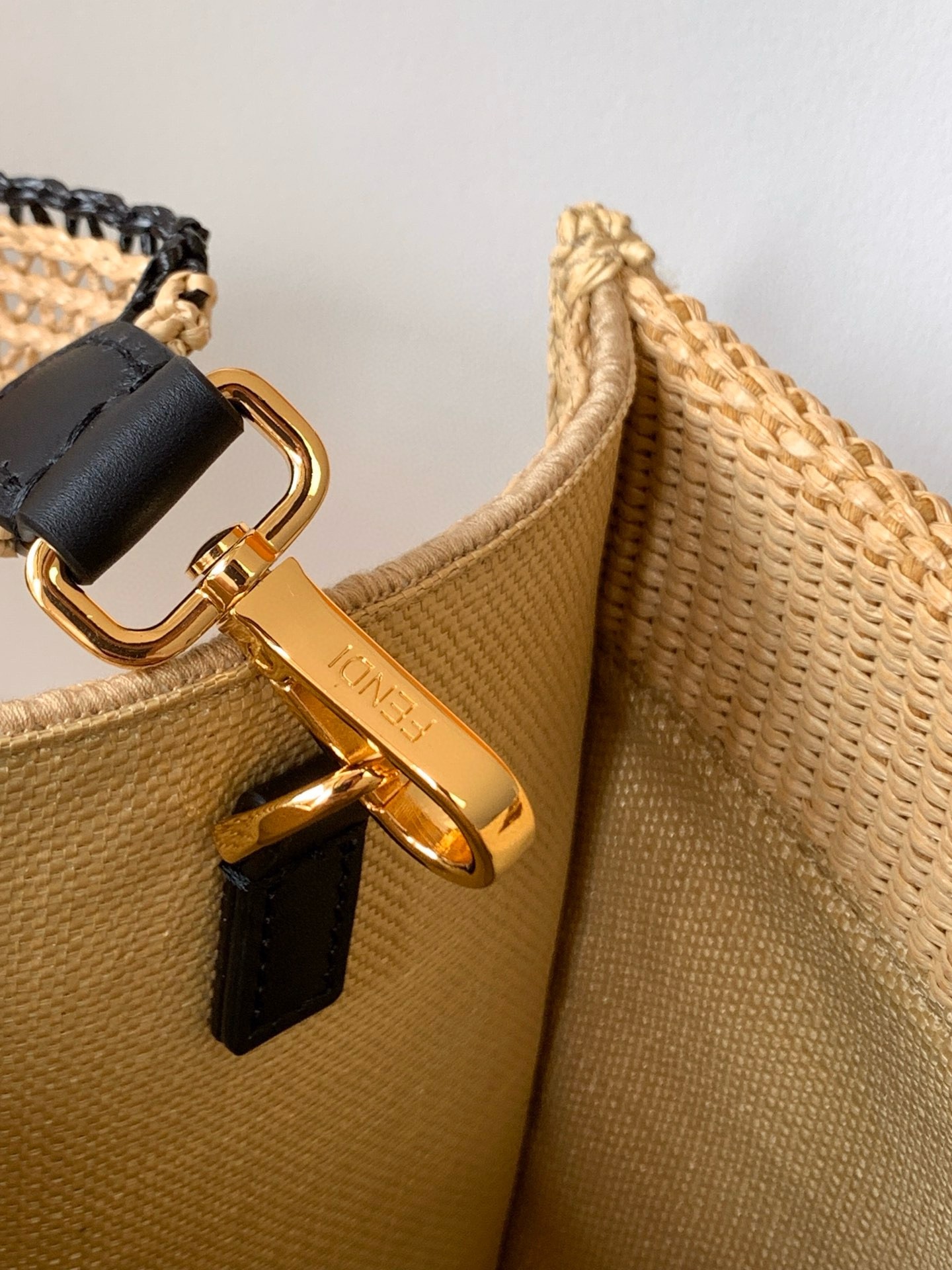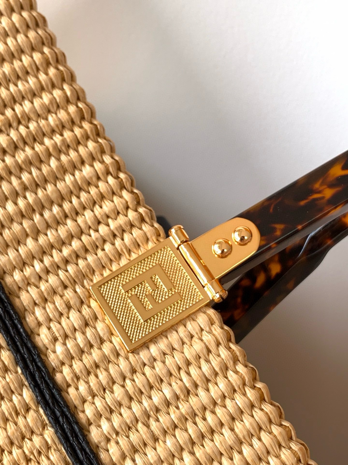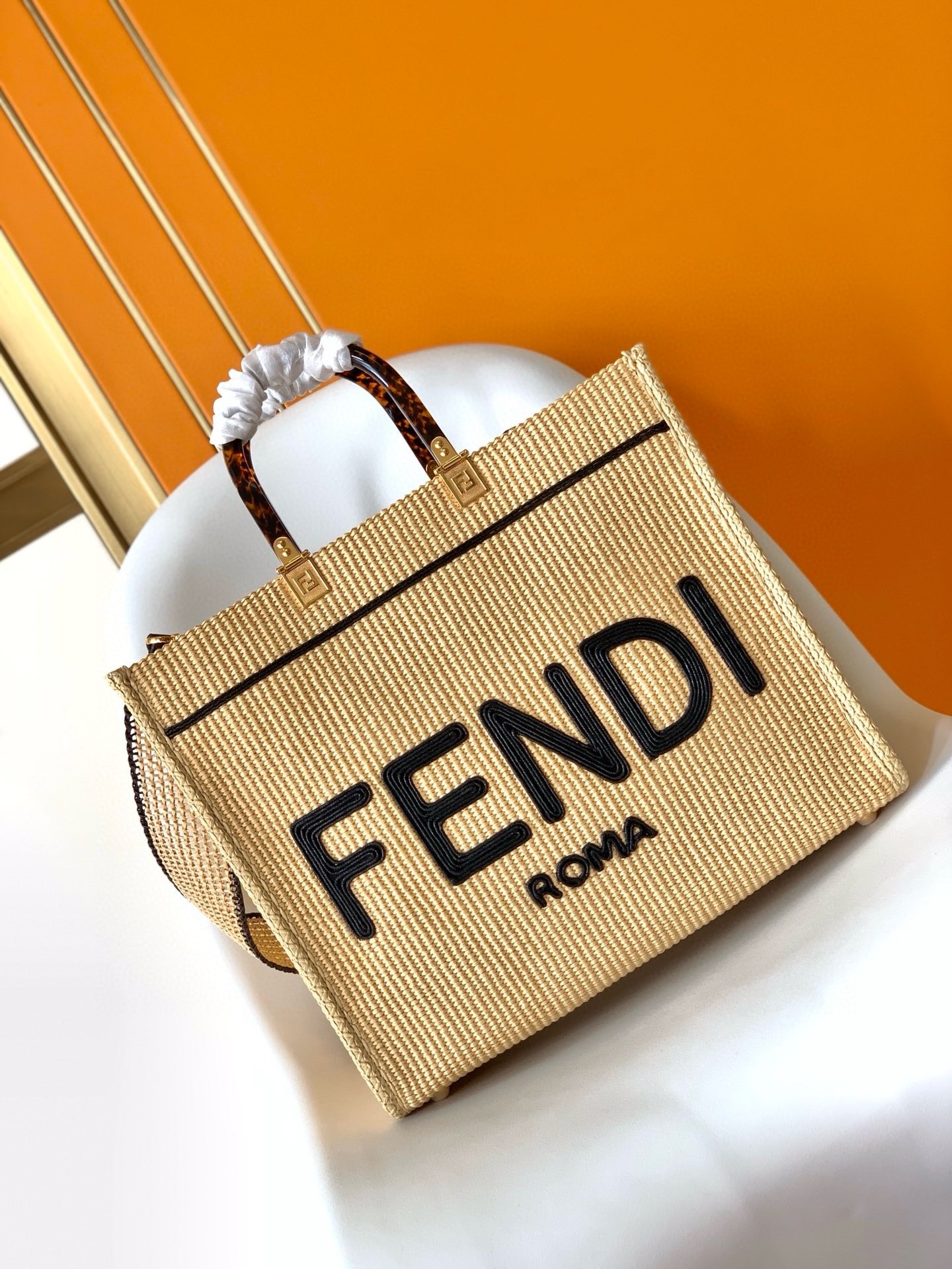 Medium Sunshine shopper made of natural-colored woven straw with a moss-stitch effect, with black straw FENDI ROMA embroidery and stiff tortoiseshell-effect plexiglass handles. Features a spacious straw-lined internal compartment, black leather edging and gold-finish metalware. Can be carried by hand or worn on the shoulder thanks to the two handles and removable tone-on-tone straw shoulder strap.