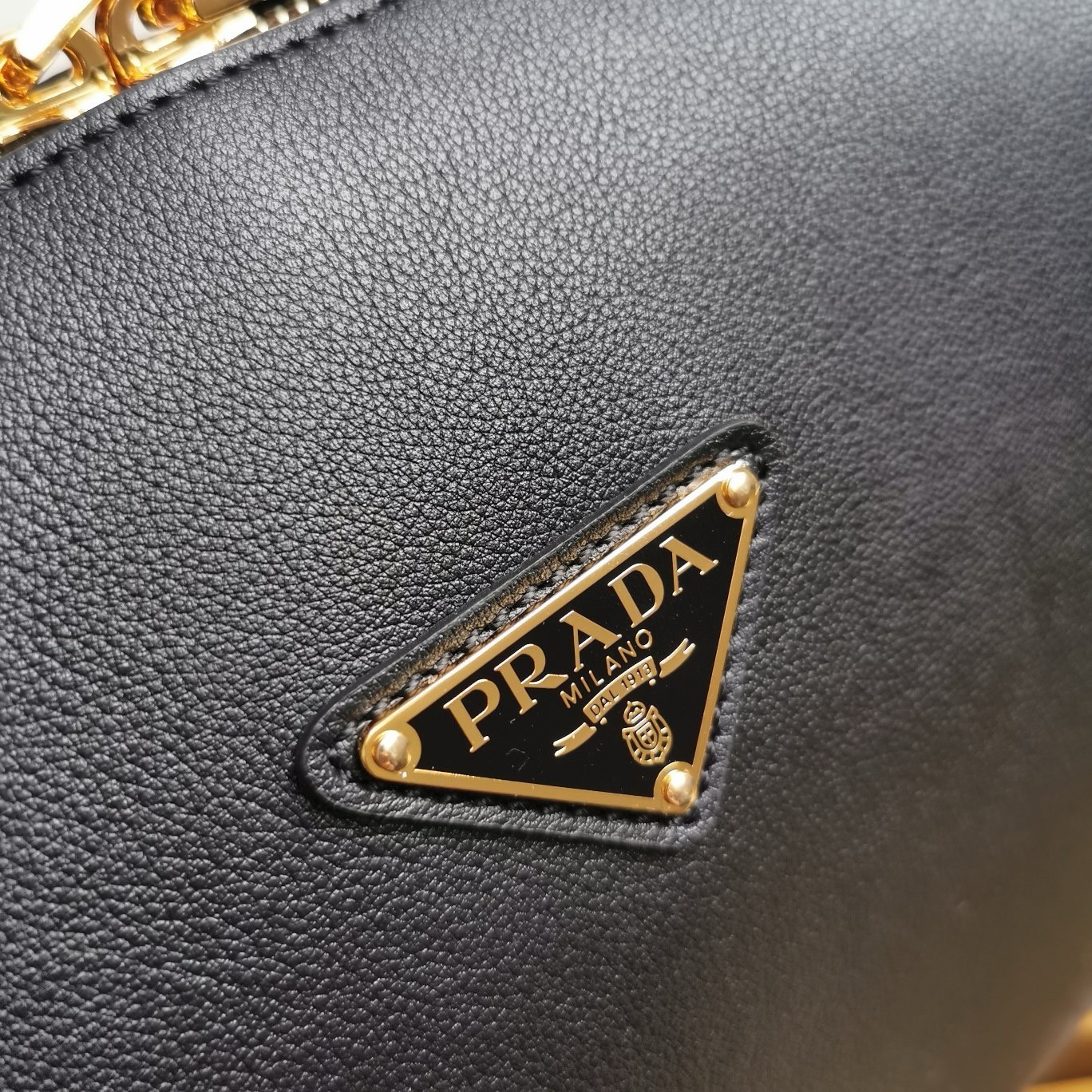 This bag with a sophisticated, contemporary design features simple yet refined details, brightened by the metal hardware. The versatile style with nappa leather interior has sleek, minimalist lines emphasized by the buttery feel of soft grain leather. The accessory, an expression of exceptional artisanal know-how, is decorated with the iconic enameled metal triangle logo.