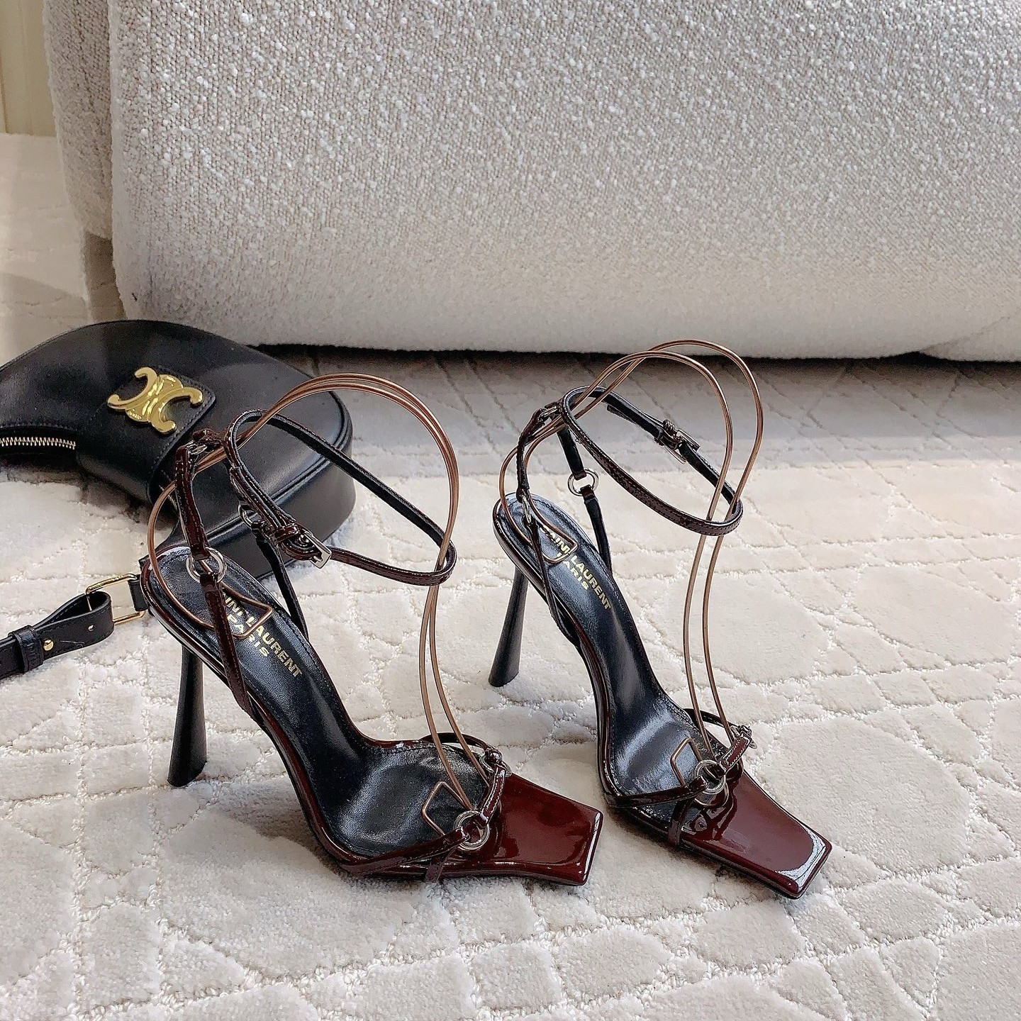 This pair of Saint Laurent Nova sandals decorated with metal ring details, Made from glossy patent leather, they feature an elongated squared toe, flared heel and adjustable ankle strap.