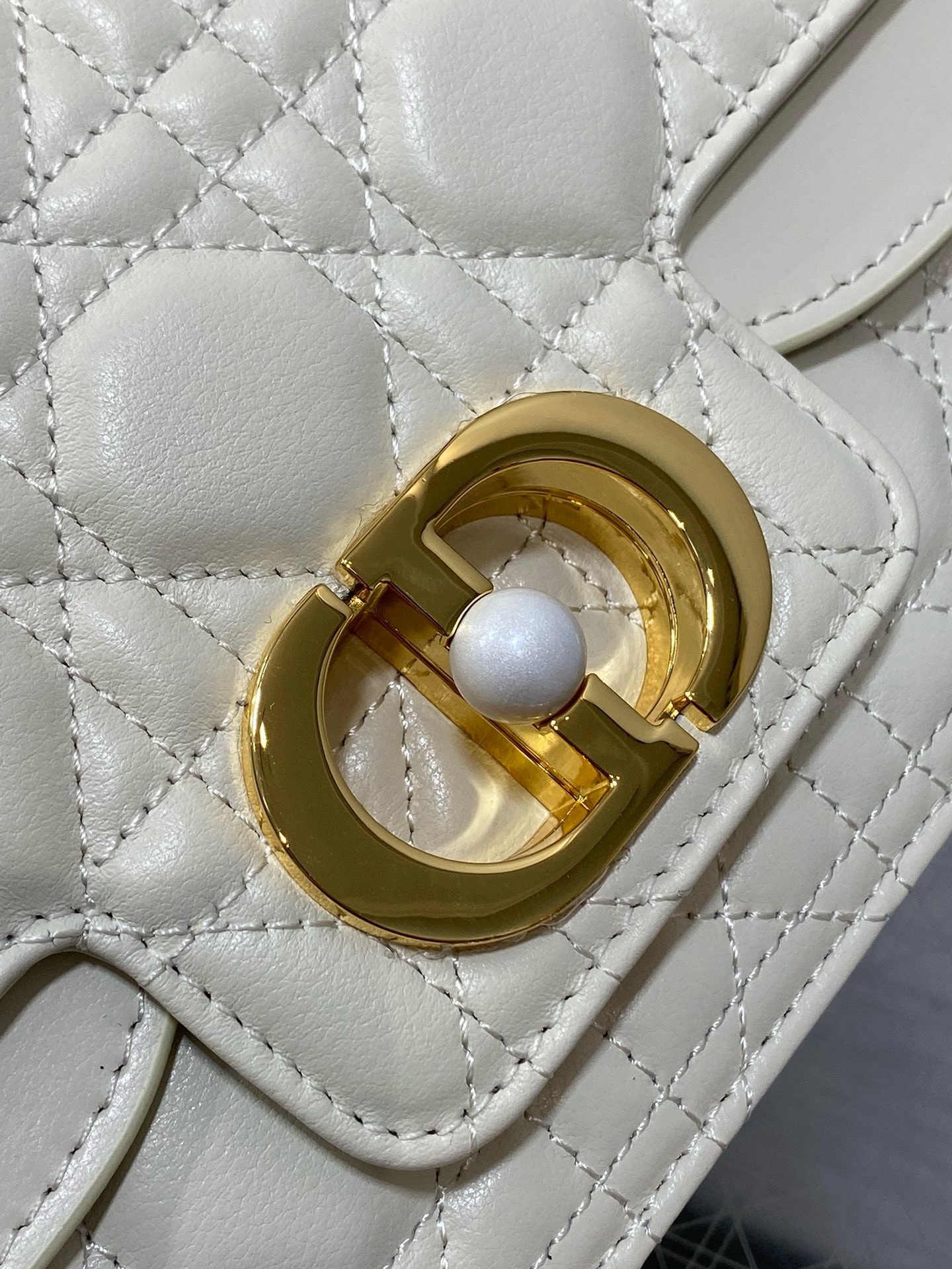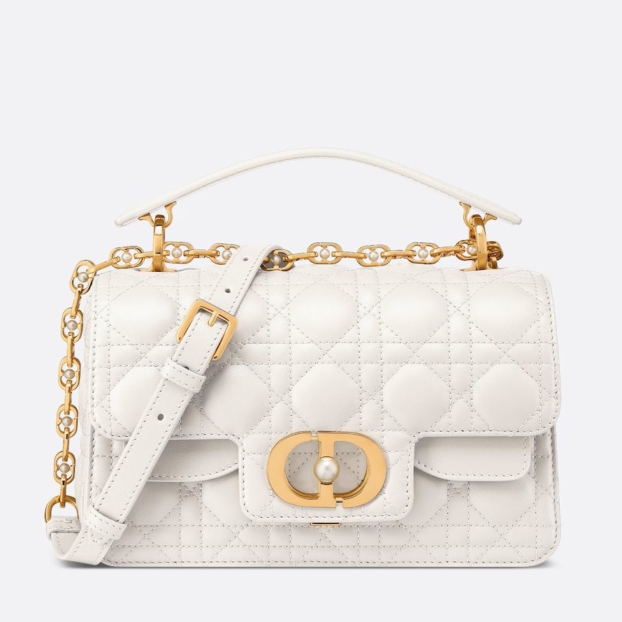 New for Summer 2024, the Dior Jolie Top Handle bag presents an elegant and functional design. It is crafted in calfskin with Cannage stitching and features a double flap enhanced by a CD signature embellished with a white resin pearl, as well as three compartments and a zip pocket to accommodate all the essentials, day or evening. The removable top handle is completed by a detachable chain strap with a leather insert and CD signature links embellished with white resin pearls, allowing the small bag to be comfortably carried by hand, worn over the shoulder or crossbody.