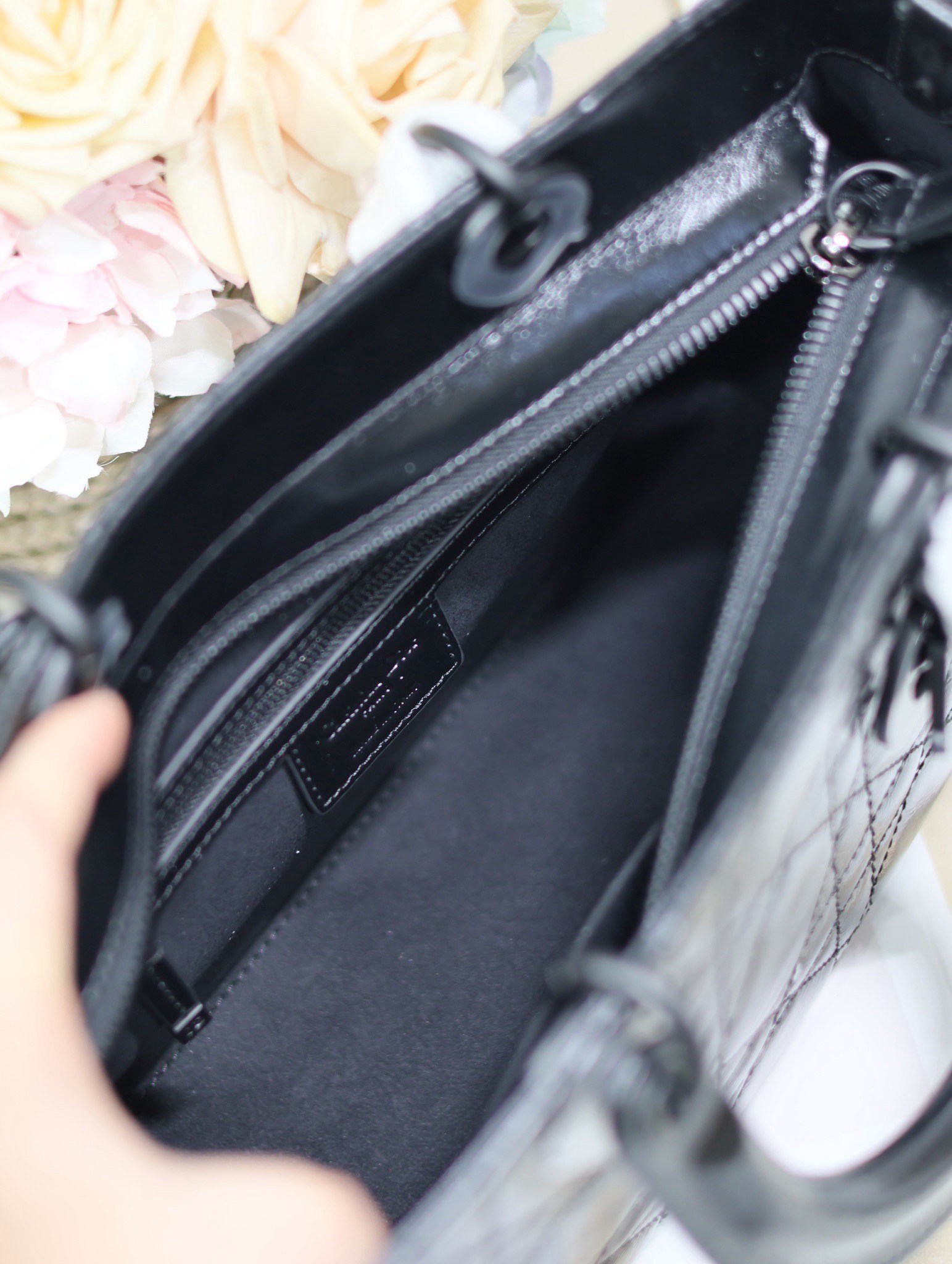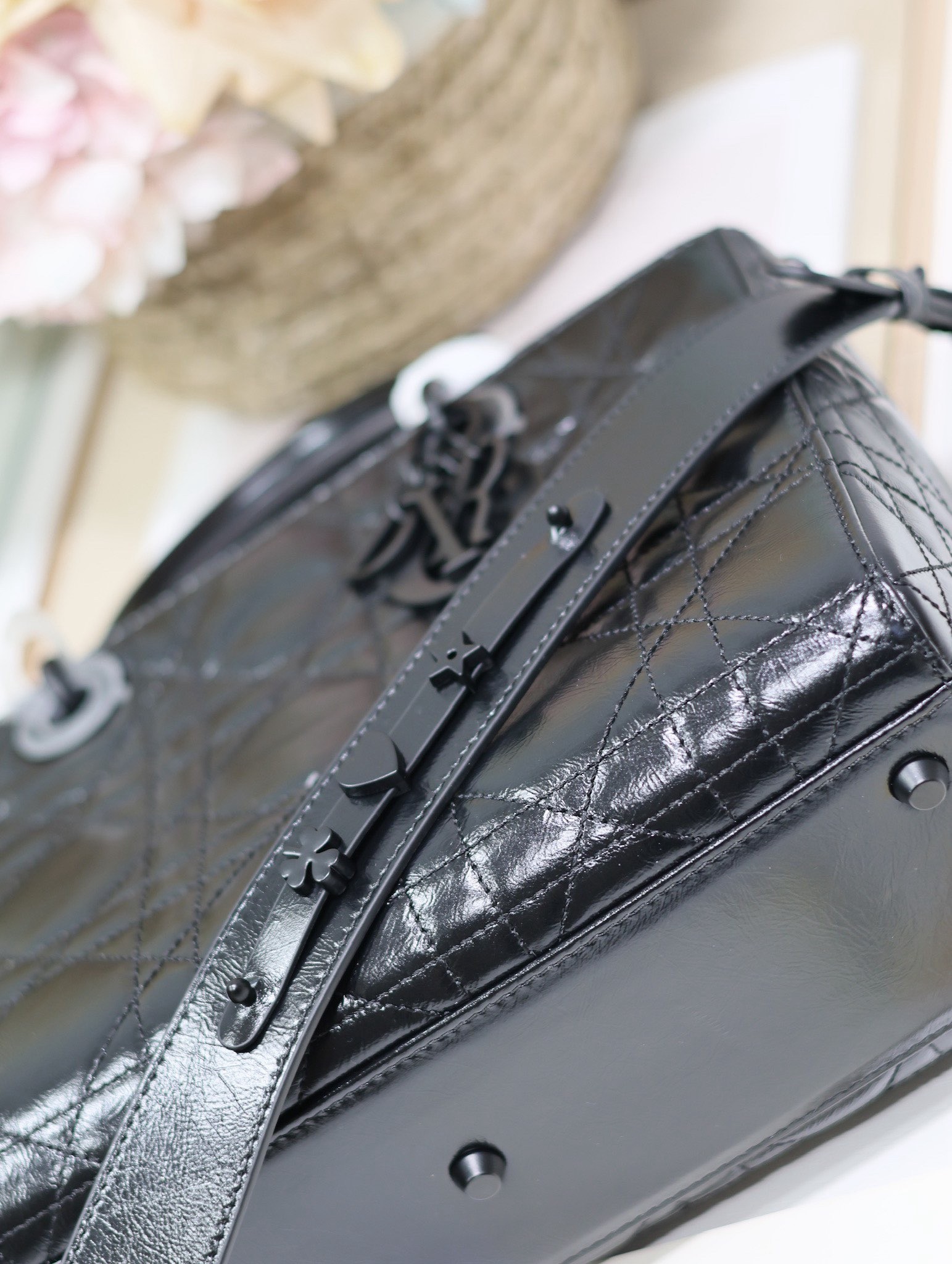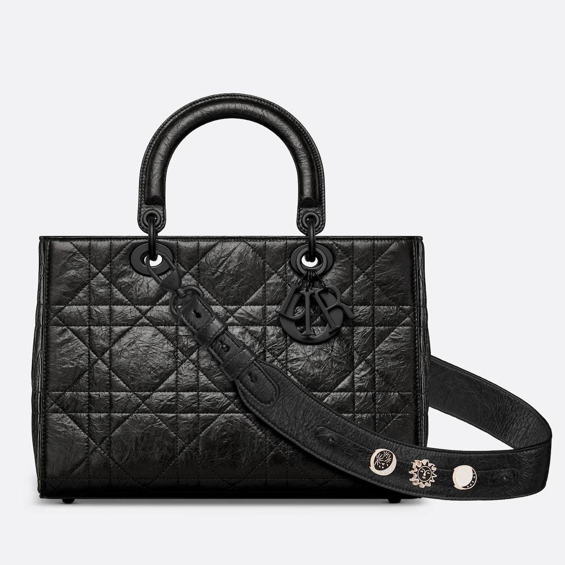 New for the season and appearing in the Spring-Summer 2024 Fashion Show, the Lady D-Sire My ABCDior bag draws inspiration from the iconic elegance of the Lady Dior design. Reimagined with a casual style for an urban look, the black crinkled calfskin is accented by Macrocannage topstitching, while tonal ultra-matte metal D.I.O.R. charms lend a modern touch. Showcasing a shoulder strap that can be personalized by adding symbolic badges, the unique medium bag can be carried by hand or worn crossbody.