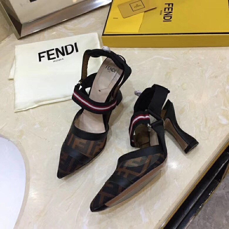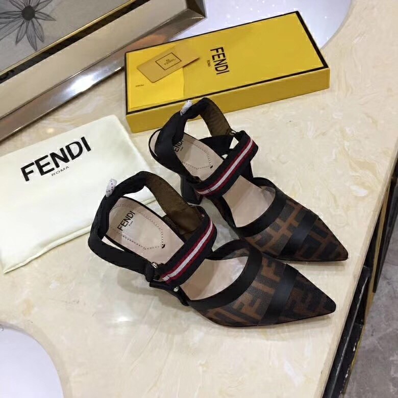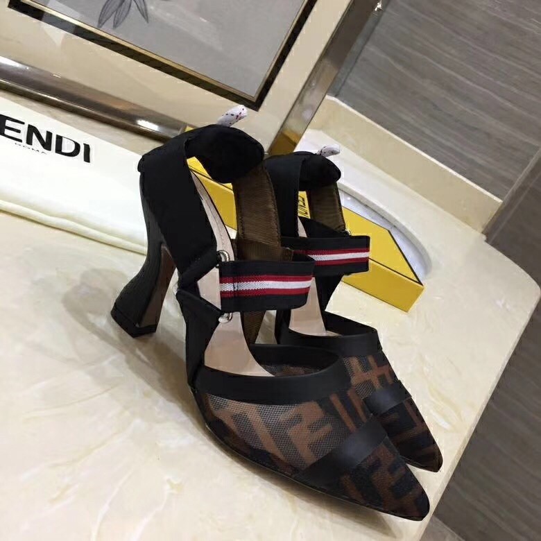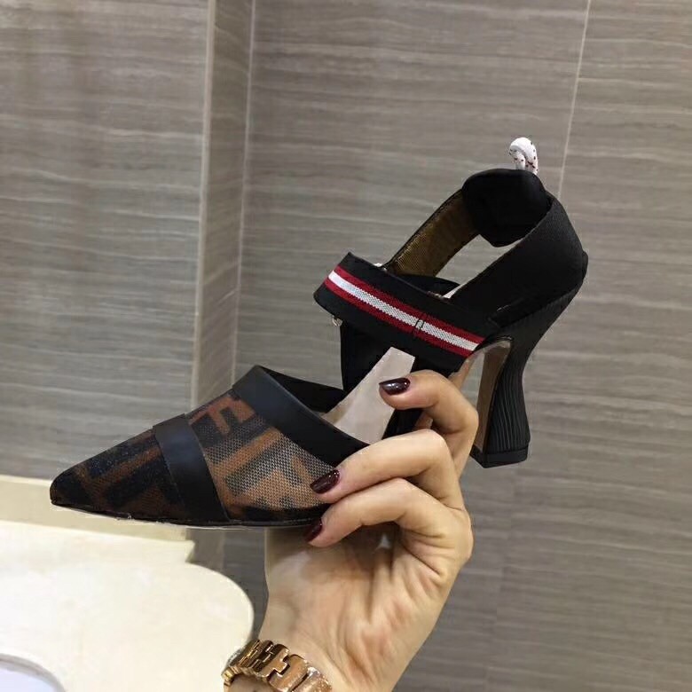 Round-toe Colibrì slingbacks with stretch ribbons that wrap around the foot. Sole finished with rubber insert. The innovative construction is inspired by futuristic geometric designs: the shoes are made of technical mesh and tulle, with tone-on-tone heat-sealing. The FF logo print creates levels of transparency on the toe. The ankle straps add a sporty touch, with a pad and hiking hardware. Covered heel.