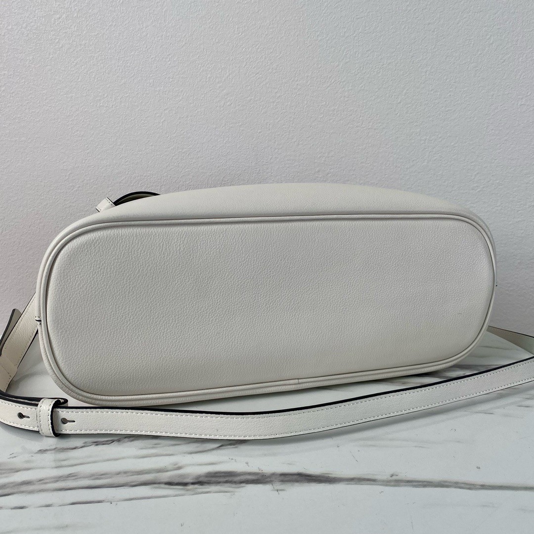 Clean lines and refined elements tell the story of Prada's dual aesthetic that moves between simplicity and detail, functionality and elegance. This leather bag with nappa interior summarizes the stylistic codes of the brand in a pragmatic yet sophisticated design. The silhouette is characterized by a multifaceted soul, expressed by the interchangeable belt that enriches the accessory with a unique and contemporary touch. The lettering logo, embossed in 22 karat gold leaf, decorates the modern, versatile style.