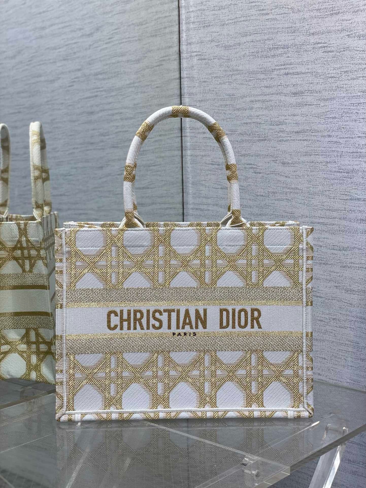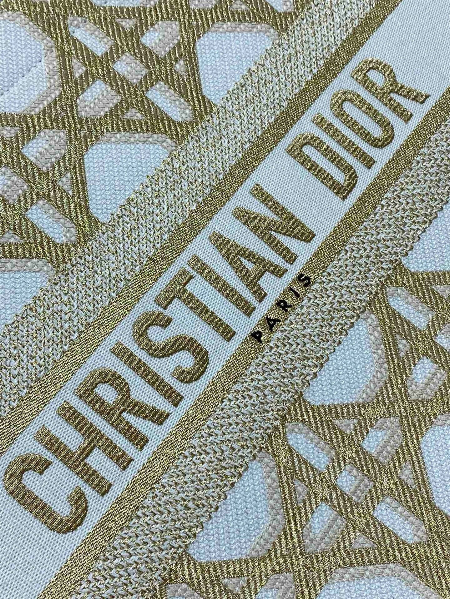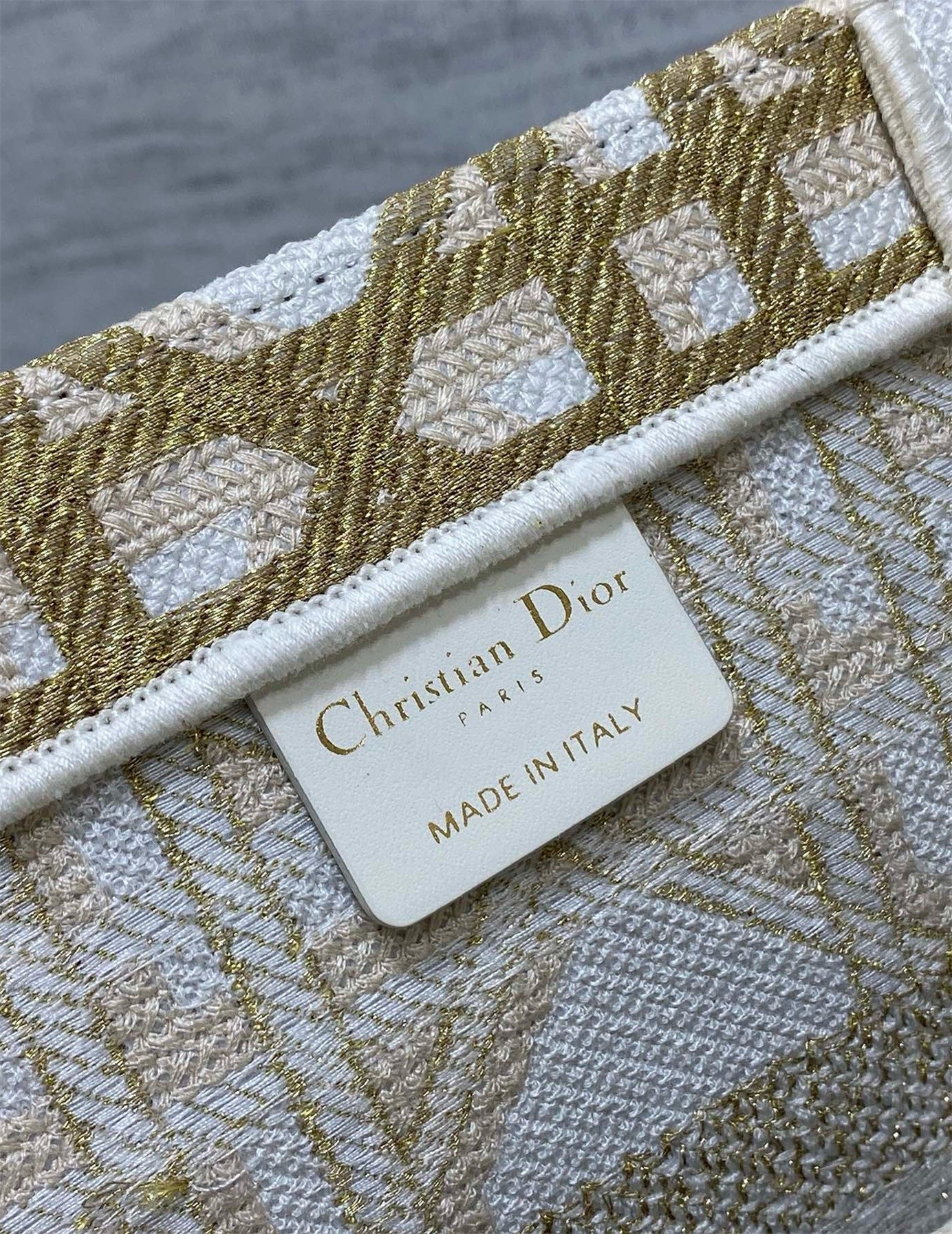 Introduced by Maria Grazia Chiuri, Creative Director of Christian Dior, the Dior Book Tote has become a staple of the Dior aesthetic. Designed to hold all the daily essentials, the style is fully embroidered with a gold-tone Macrocannage motif and is further adorned with the Christian Dior Paris signature on the front. The medium tote exemplifies the House's signature savoir-faire and may be carried by hand or worn over the shoulder.