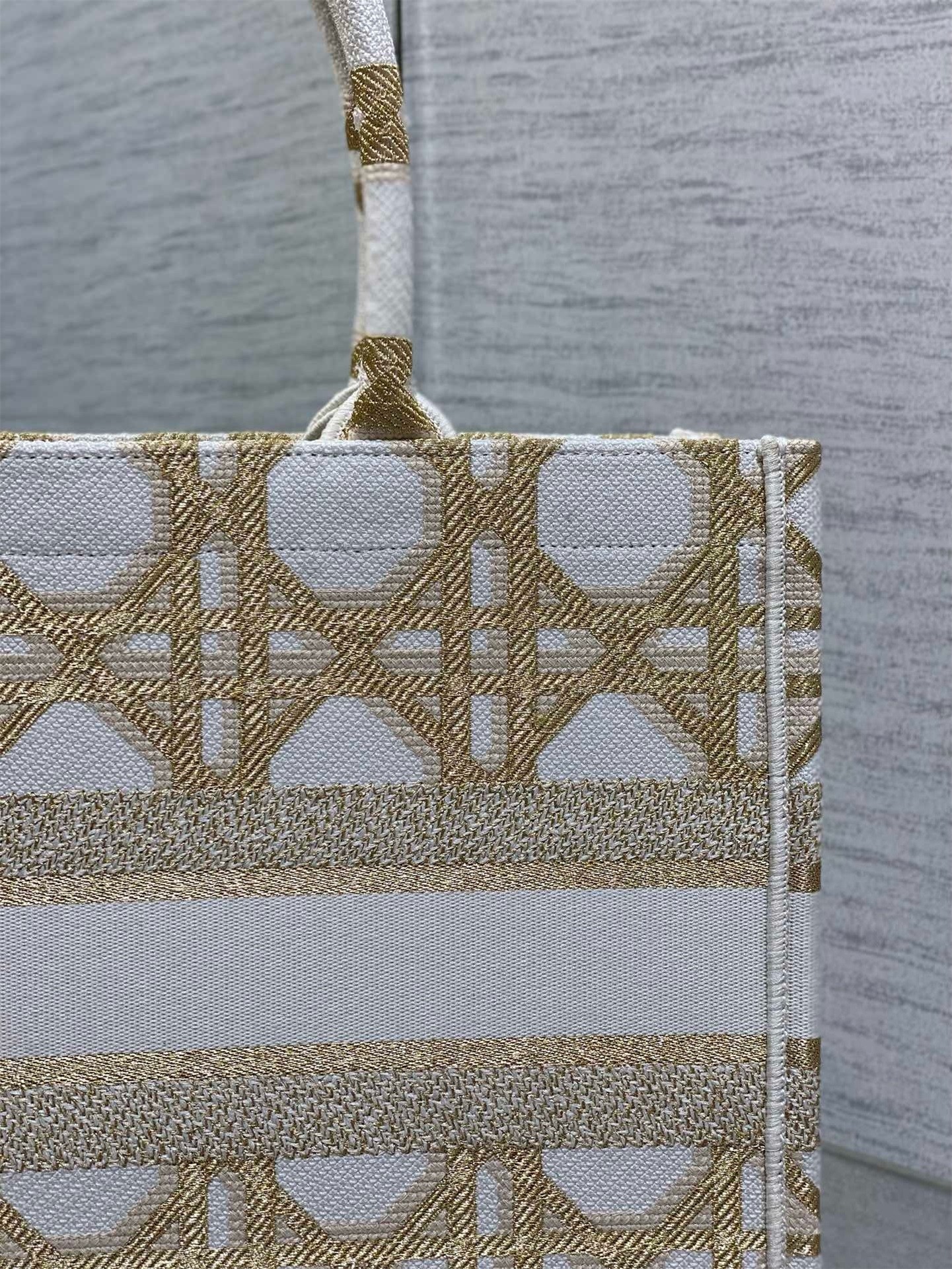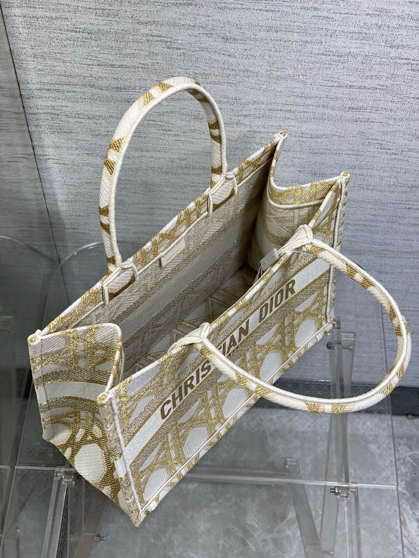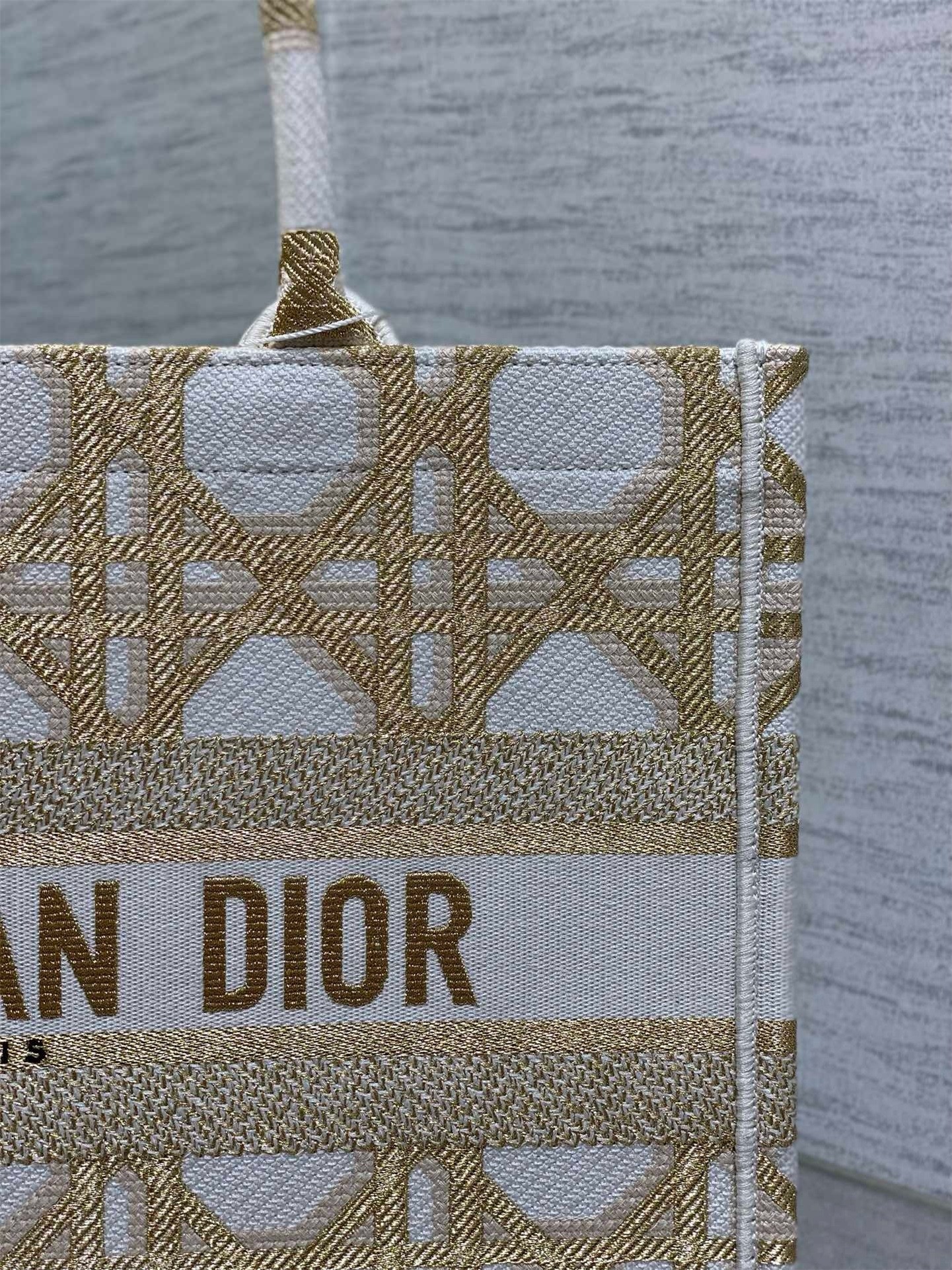 Introduced by Maria Grazia Chiuri, Creative Director of Christian Dior, the Dior Book Tote has become a staple of the Dior aesthetic. Designed to hold all the daily essentials, the style is fully embroidered with a gold-tone Macrocannage motif and is further adorned with the Christian Dior Paris signature on the front. The medium tote exemplifies the House's signature savoir-faire and may be carried by hand or worn over the shoulder.