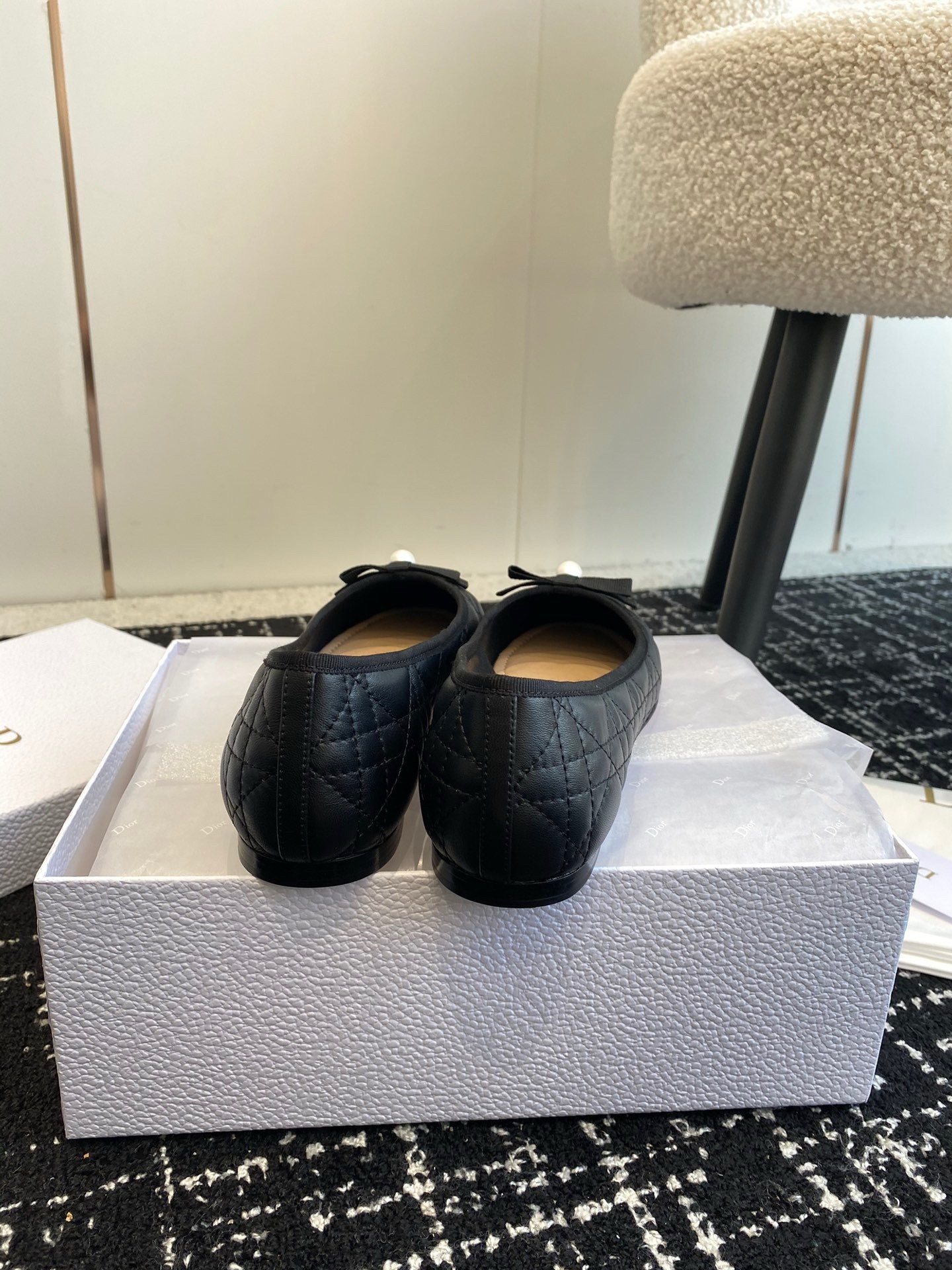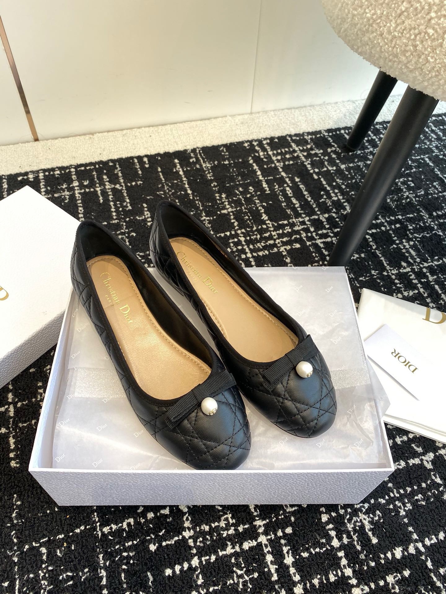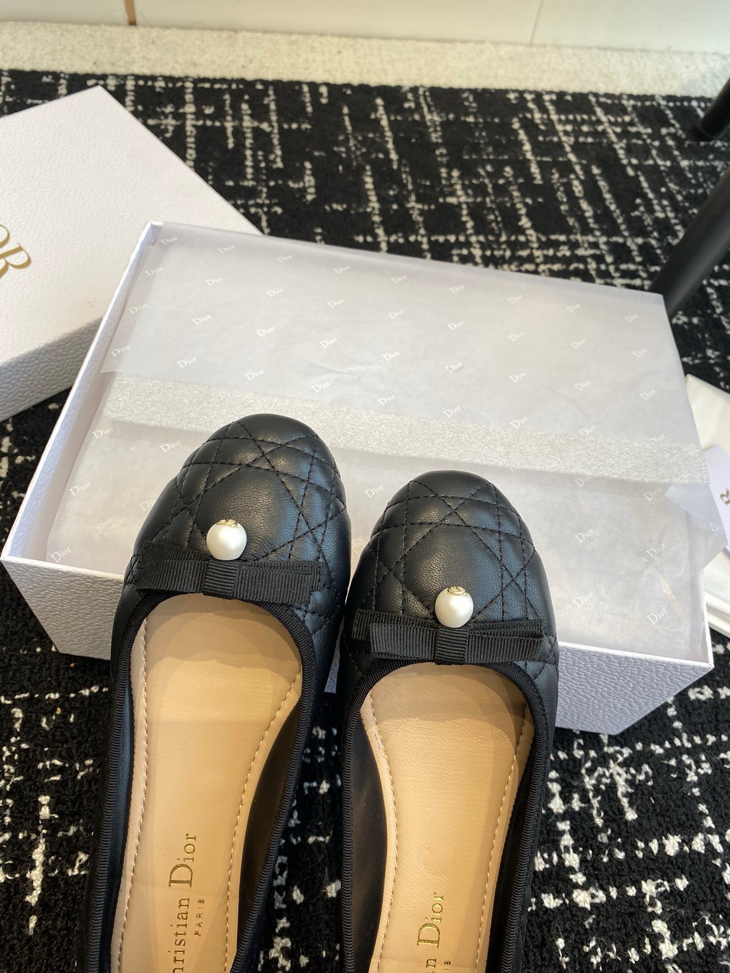 The Dior Ballet flat revisits a timeless pattern with elements of House couture. Crafted in quilted calfskin with the Cannage motif, it is distinguished by a delicate grosgrain bow on the front adorned with a white CD resin pearl inspired by the iconic Dior Tribales earrings. Featuring a padded leather insole, the supple, comfortable ballet flat will add the finishing touch to all of the season's looks.