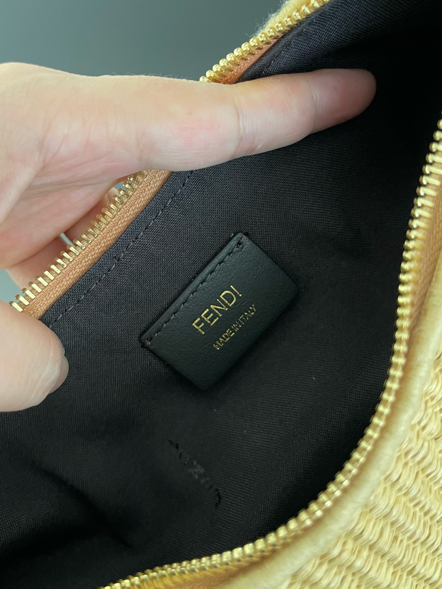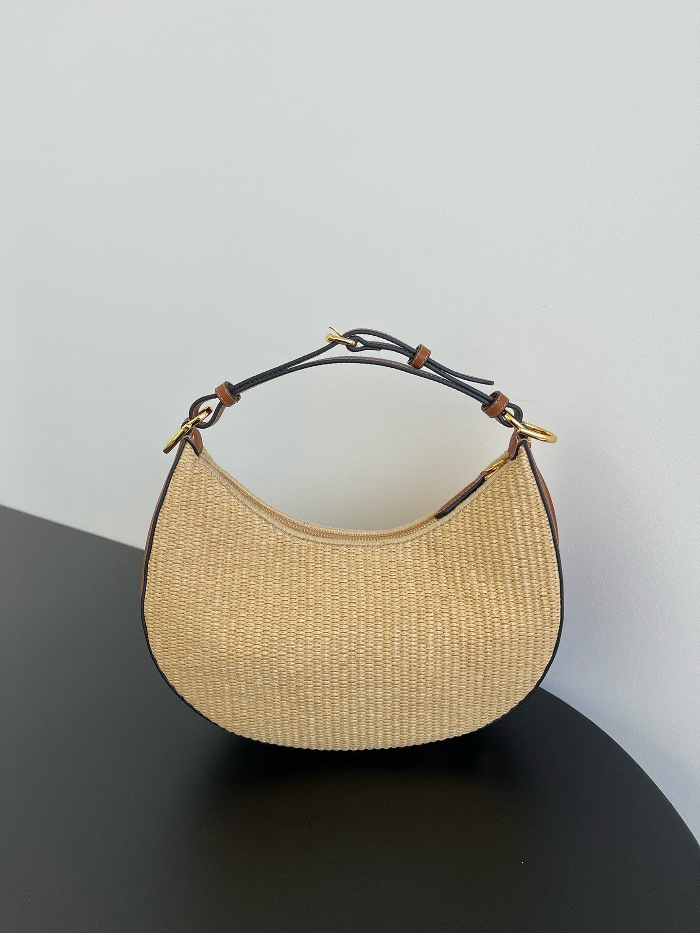Small hobo bag made of natural-colored straw in a moss-stitch textured weave, with background and details in brown leather. With vintage gold metal FENDI lettering visible when the bag is worn under the arm. Zip closure with fabric-lined internal compartment and vintage gold-finish metalware. Can be worn under the arm or cross-body thanks to the adjustable, detachable handle and the hooks that allow a shoulder strap to be attached.