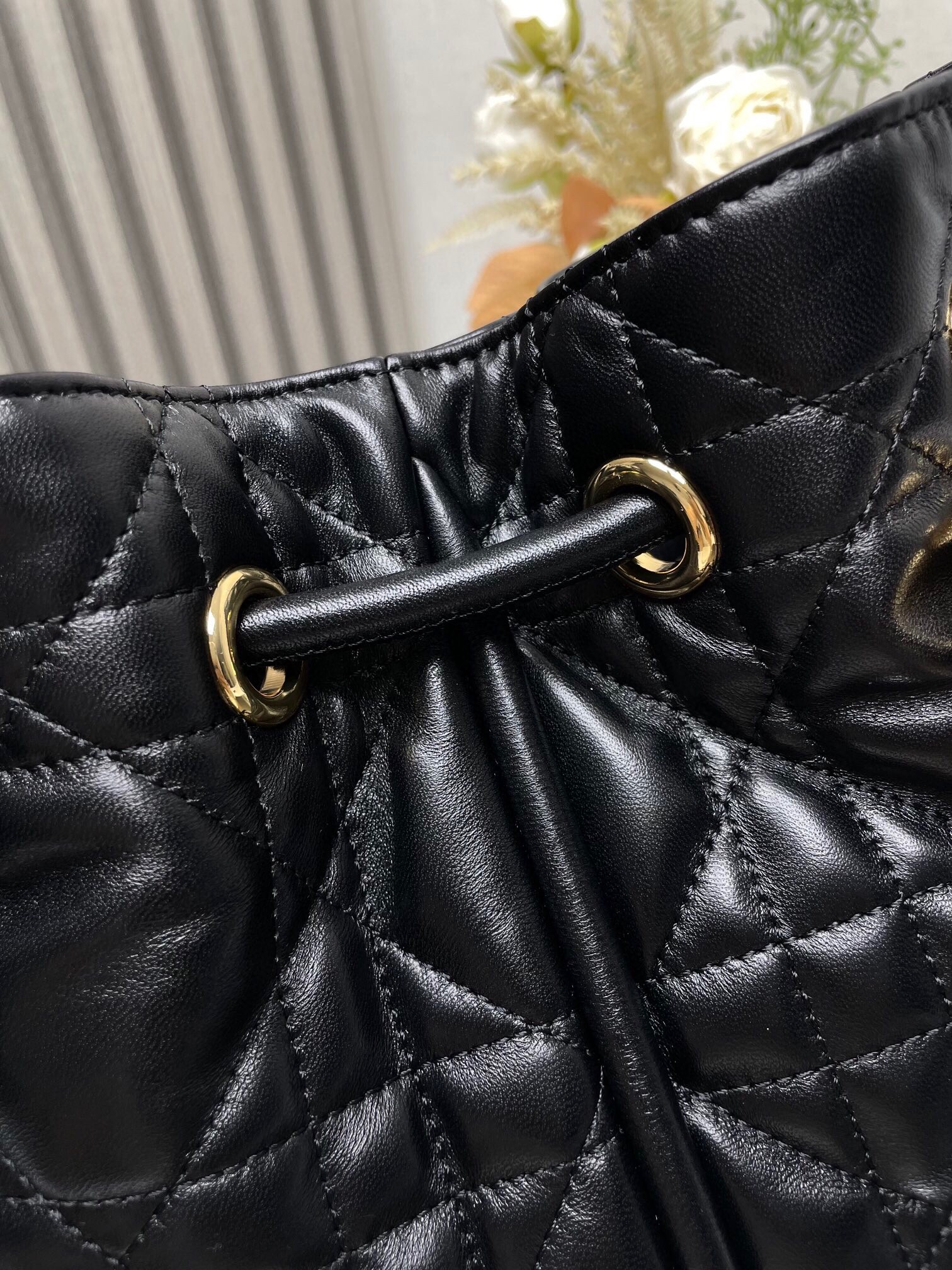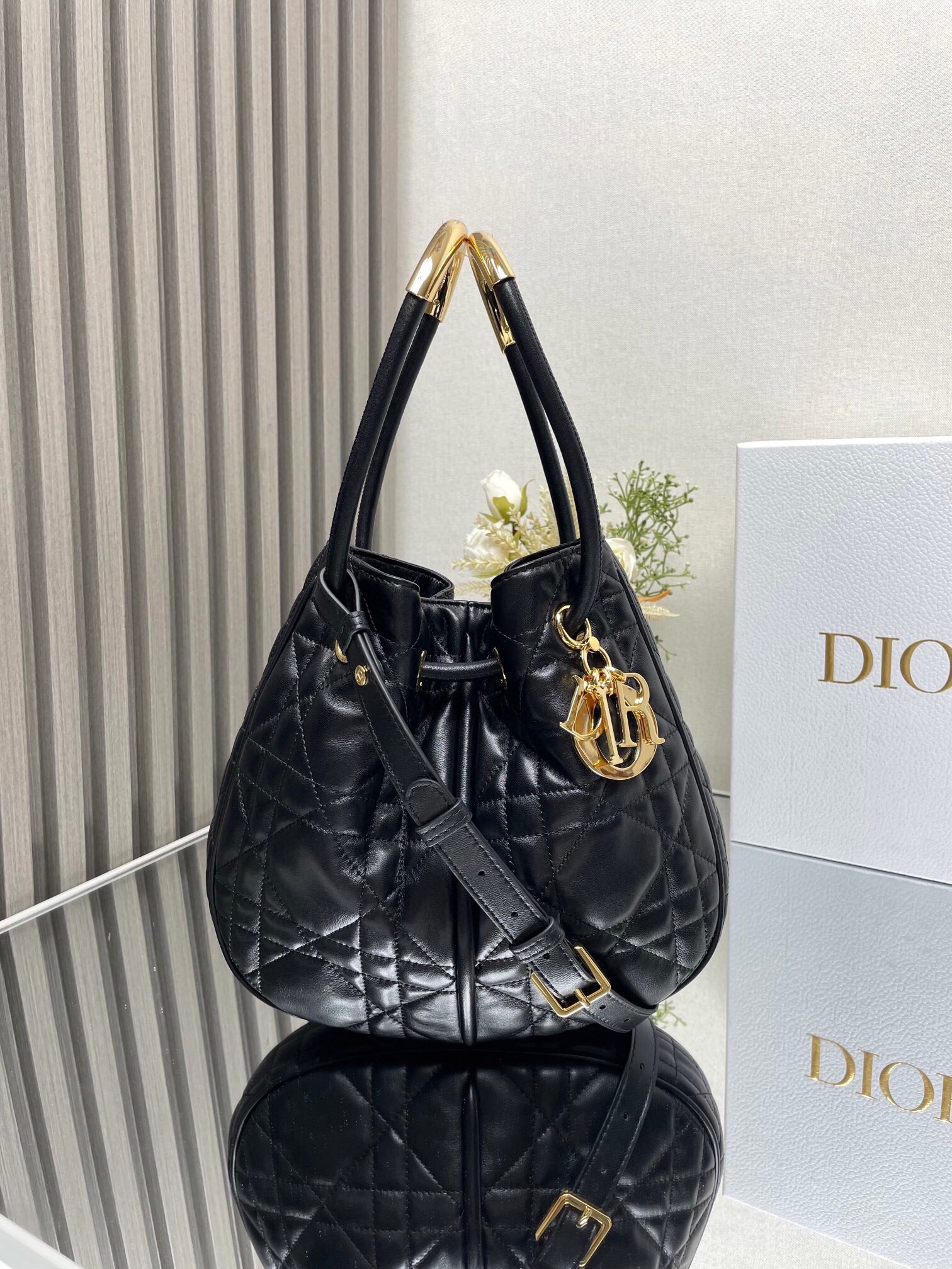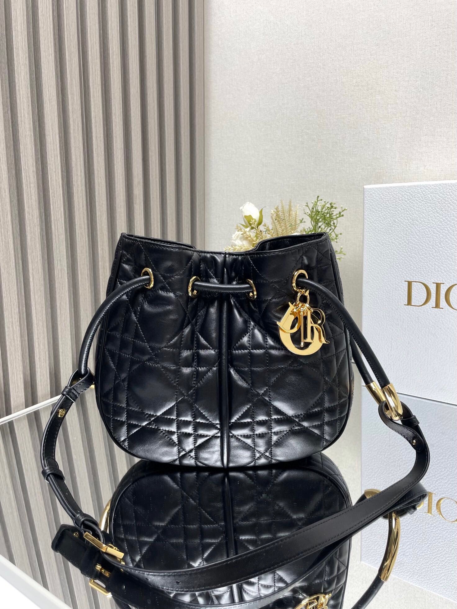 New for Fall 2024, the Dior Nolita bag redefines House codes of modern elegance with a refined and contemporary silhouette. The black Macrocannage lambskin is complemented by structured top handles embellished with antique gold-finish metal, as well as sliding D.I.O.R. charms which lend a touch of movement. The drawstring closure reveals a practical interior with a slip pocket, while the adjustable and removable leather strap allows the medium bag to be carried by hand, worn over the shoulder or crossbody.