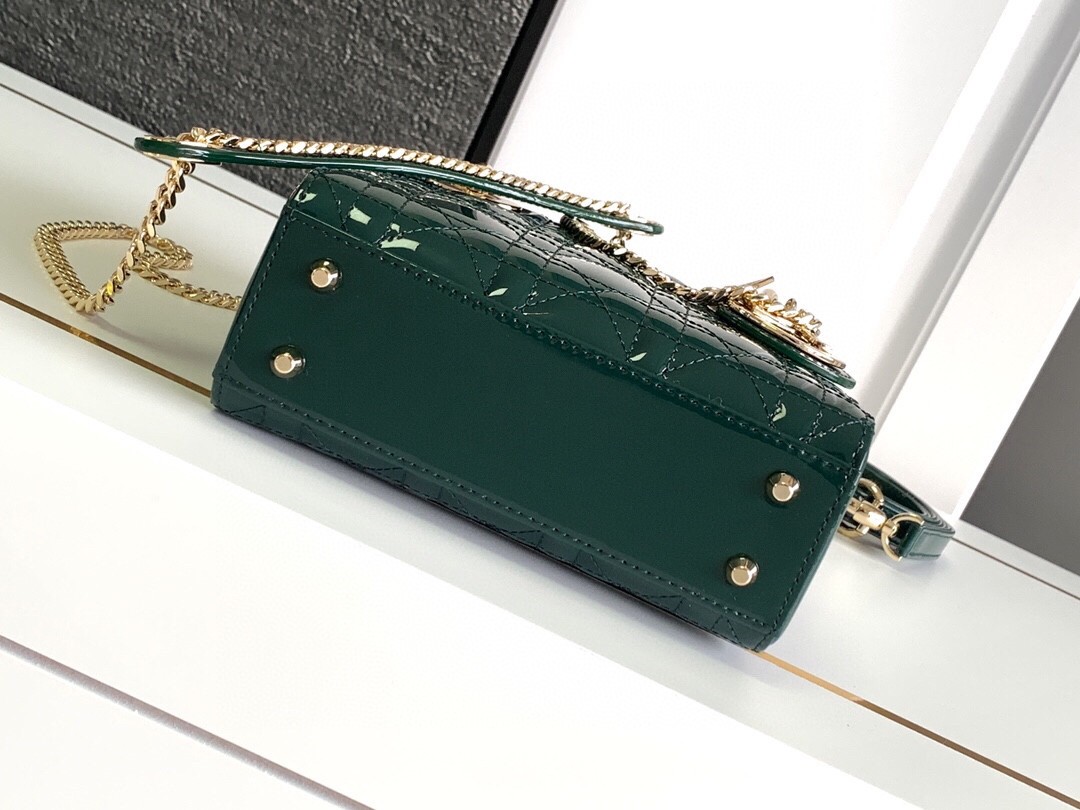 The Lady Dior bag embodies the House's vision of elegance and beauty. Sleek and refined, the style is timeless. It is crafted in patent calfskin with Cannage stitching, creating the instantly recognizable quilted texture, while the pale gold-finish metal 'D.I.O.R.' charms further embellish its silhouette. Featuring a removable chain shoulder strap, the miniature Lady Dior bag can be carried by hand or crossbody as an ideal evening wear companion.