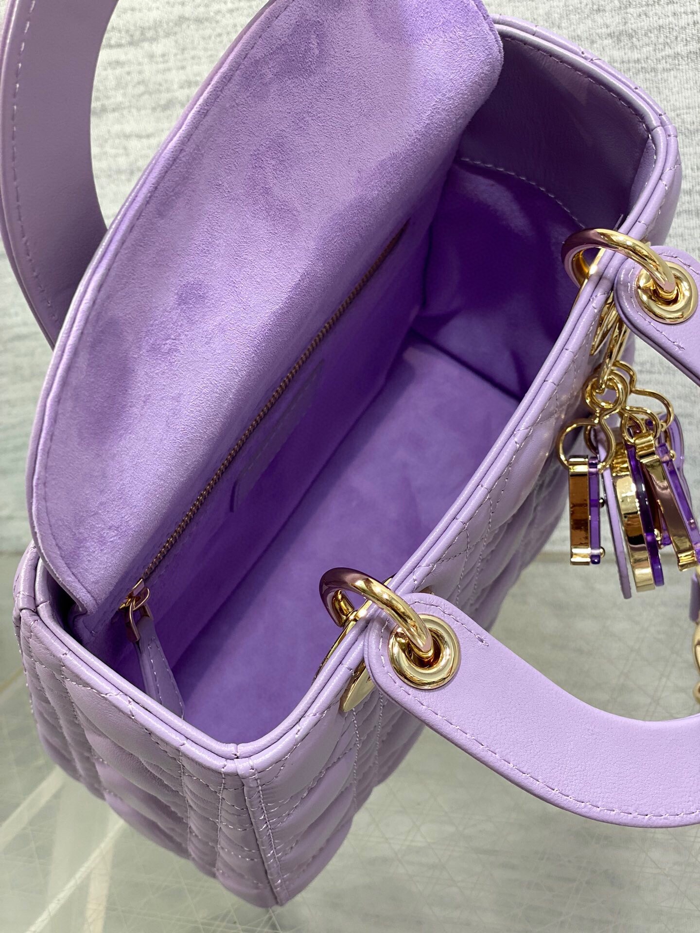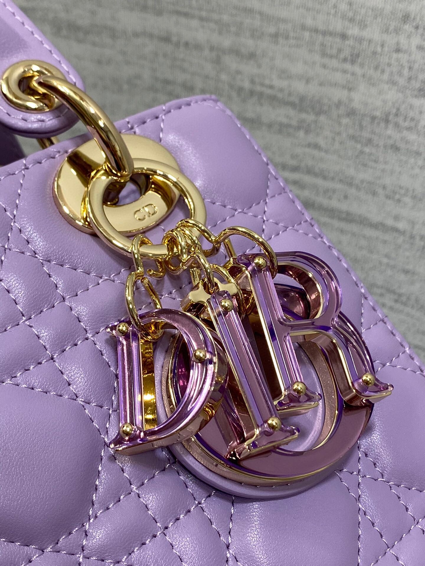 The Lady Dior bag embodies Dior's vision of elegance and beauty. Sleek and refined, the timeless yet modern style is crafted in lambskin with Cannage stitching, creating the unmistakable quilted texture. The D.I.O.R. charms embellished in transparent tonal resin illuminate its silhouette. Featuring a thin, removable leather shoulder strap, the small Lady Dior bag can be carried by hand or worn crossbody.