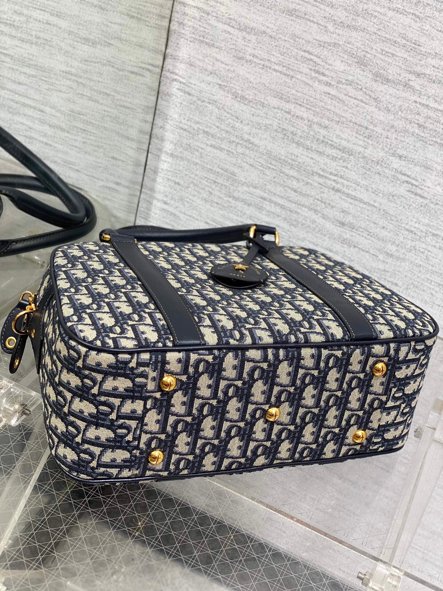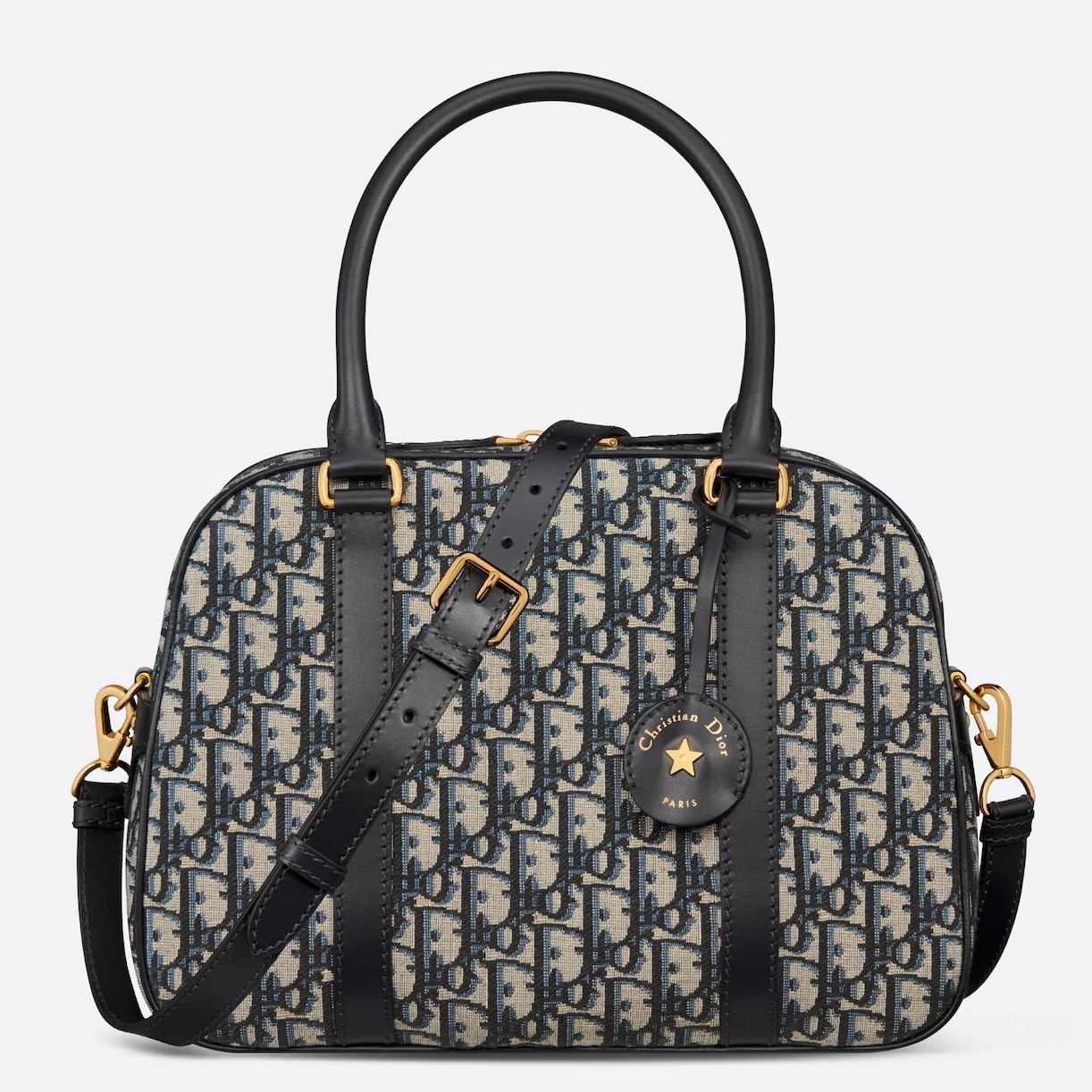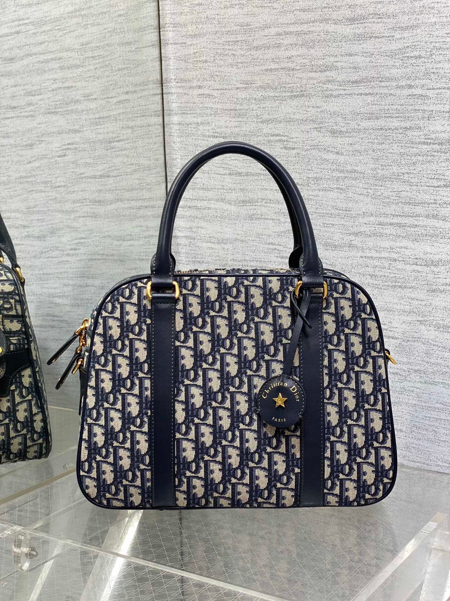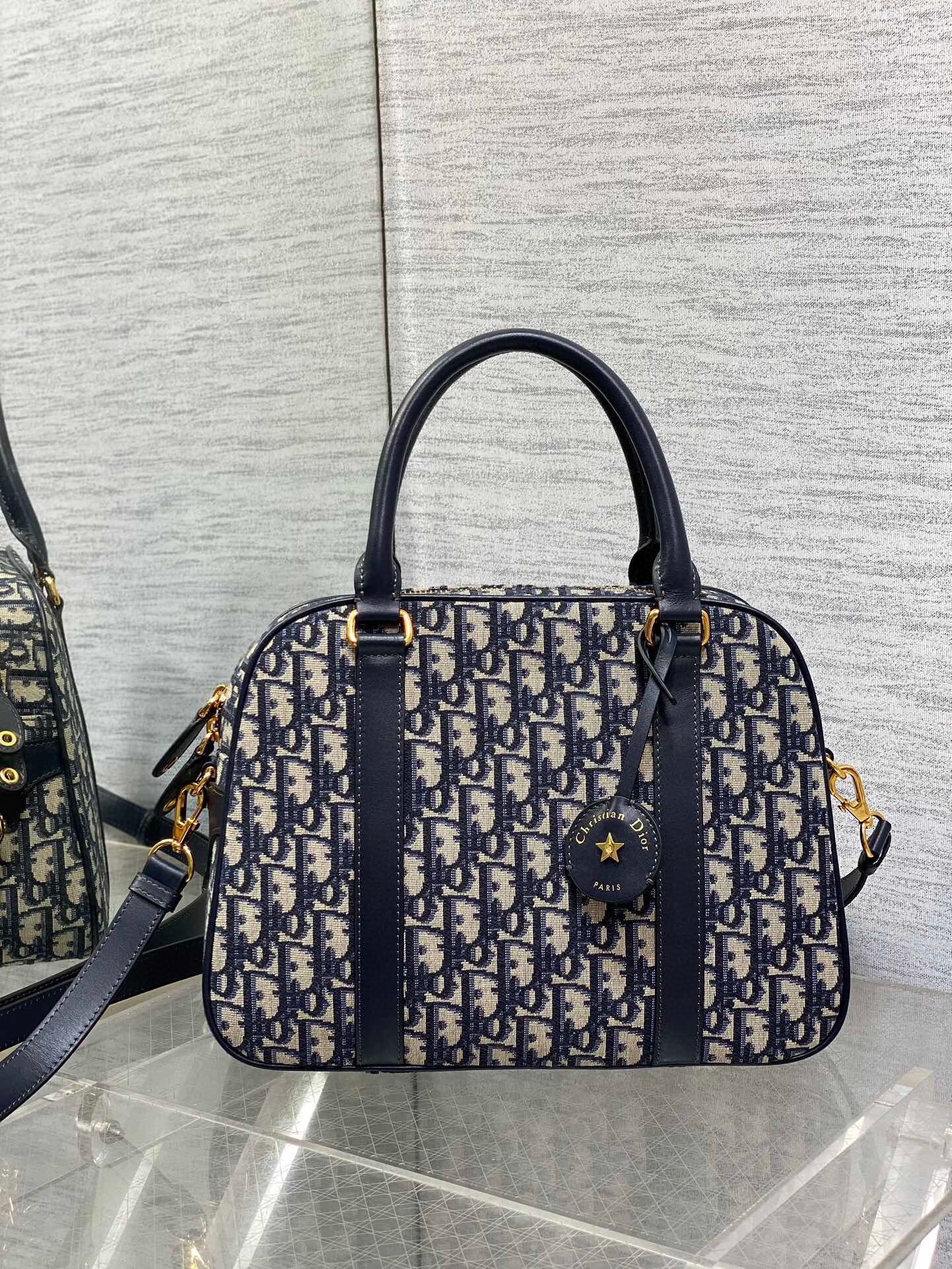 New for Fall 2024, the D-Vibe bowling bag has a streamlined and modern silhouette. Constructed in blue Dior Oblique jacquard adorned with tonal leather details, it stands out with a leather key holder engraved with the Christian Dior Paris signature and a gold-finish star. The attached key opens the zipper padlock to reveal a spacious compartment that can accommodate all the essentials, completed by a slip pocket and a zip pocket. Featuring leather top handles and an adjustable, removable strap, the practical large bag can be carried by hand, worn over the shoulder or crossbody.