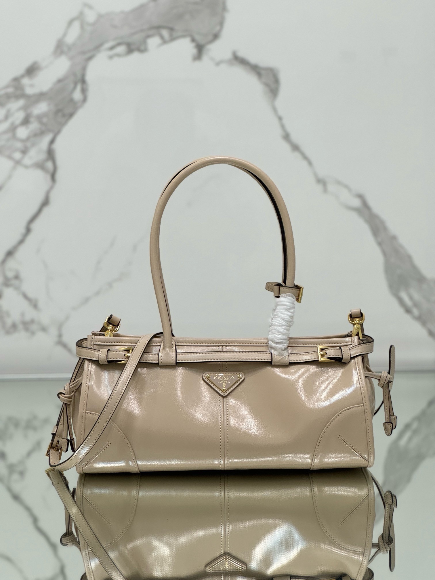 This pragmatic and refined handbag is made of soft leather with a glossy finish that emphasizes its versatile, modern allure. The geometric design blends different influences into one style with a distinctive but sleek aesthetic. Embellished by the sophisticated strap detail, the rectangular silhouette has zipper pockets inside. The enameled metal triangle logo completes the look with its iconic signature.