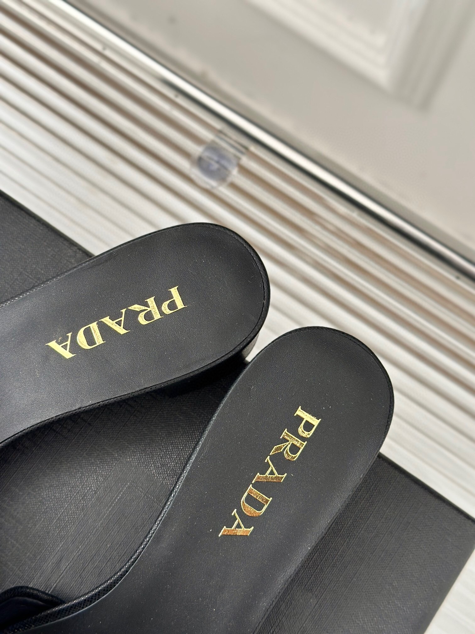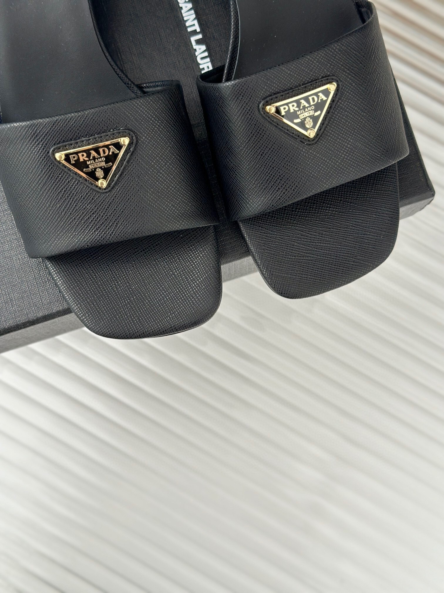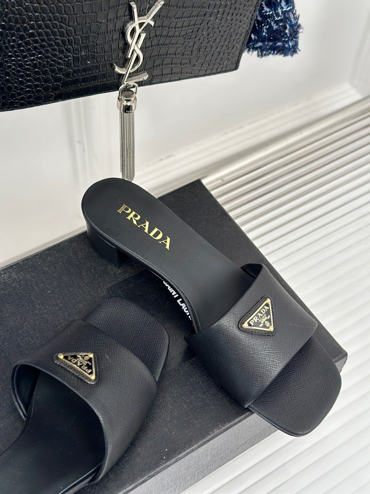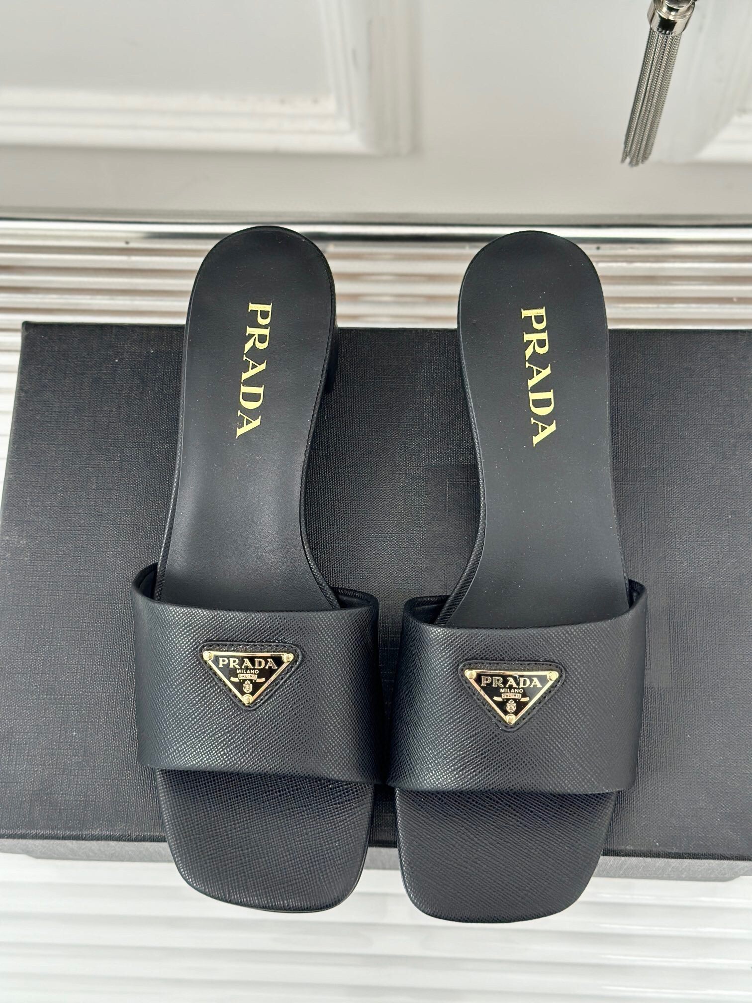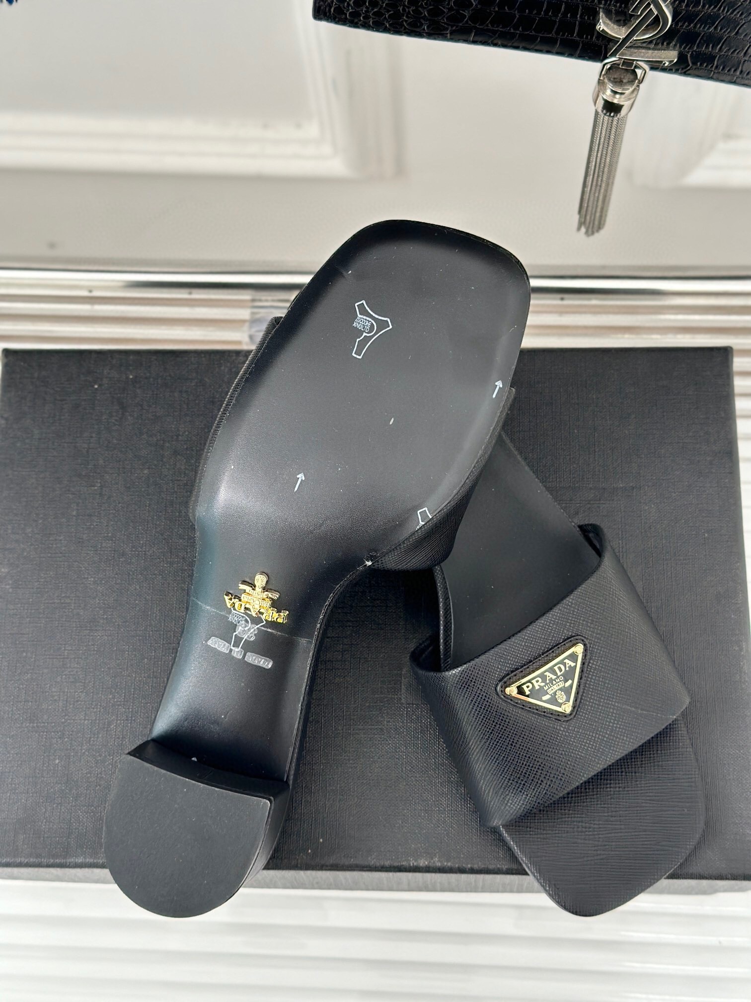 The distinctive crosshatch pattern of Saffiano leather, a signature material of Prada collections, meets the Saffiano leather in these sandals set on a 35mm leather-covered heel with a contemporary design. The sophisticated and versatile style defined by clean, sleek lines is enriched with the iconic enameled metal triangle logo.