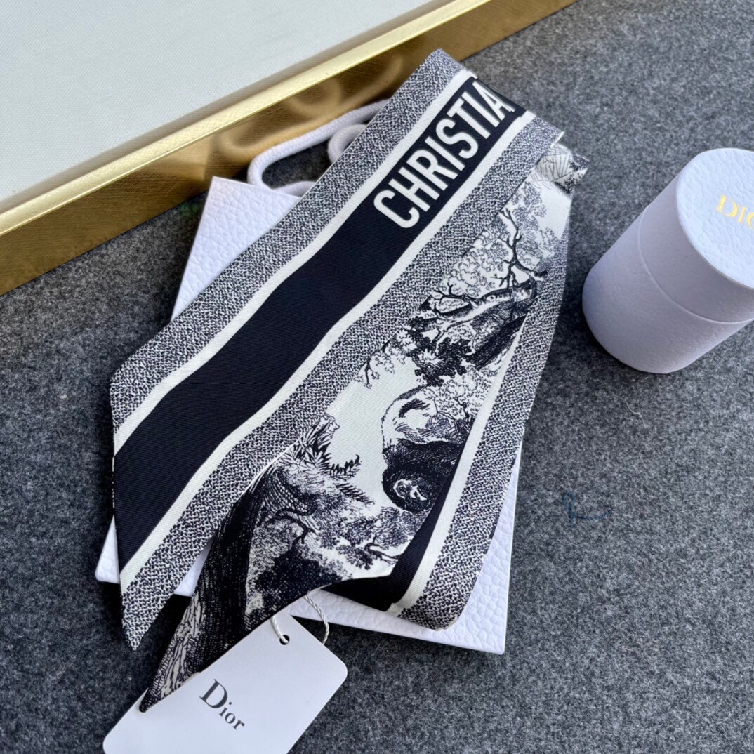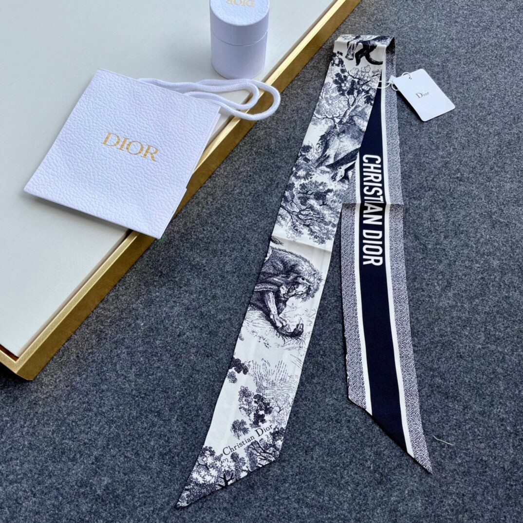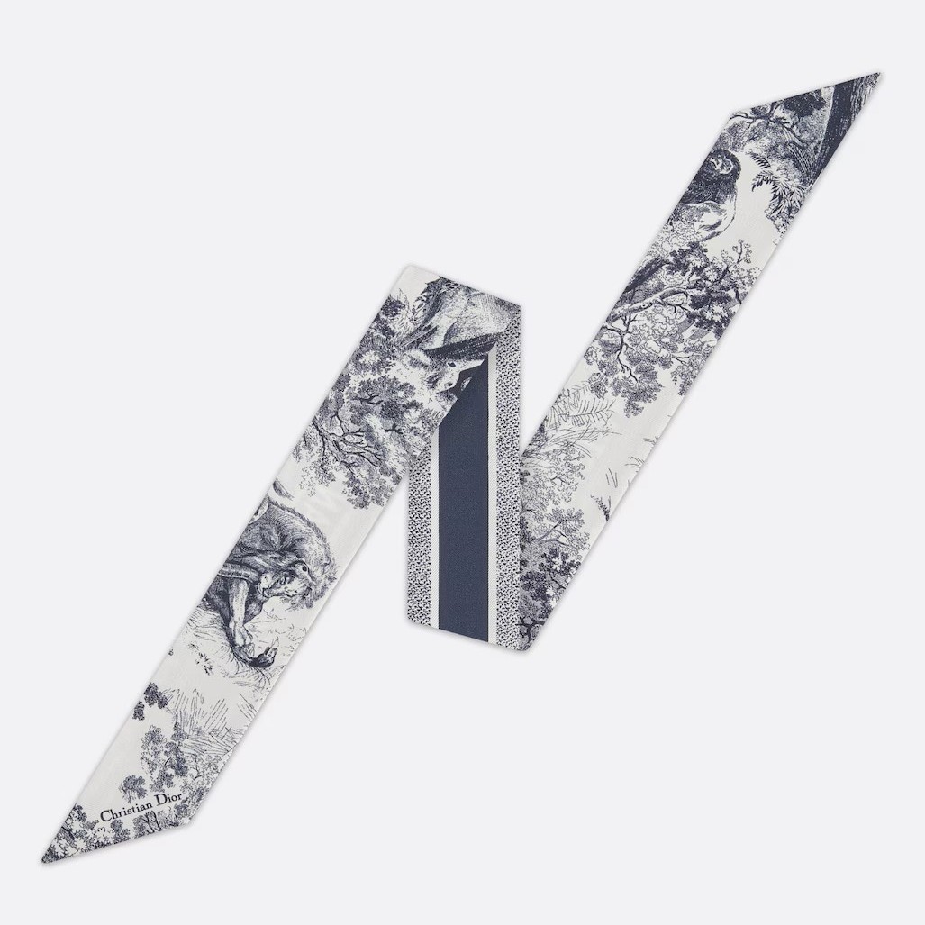 The Toile de Jouy Sauvage Mitzah scarf highlights the hallmark House motif. A timeless design, it is crafted in ivory and navy blue silk twill and is distinguished by an elongated shape with pointed ends. It is further embellished with a contrasting 'CHRISTIAN DIOR' signature jacquard band on the back. The Mitzah scarf will lend the finishing touch to any modern look and may be worn around the neck, tied at the wrist or on a bag.