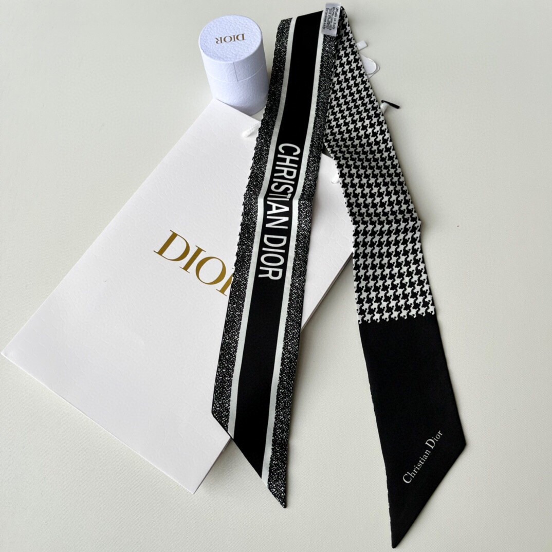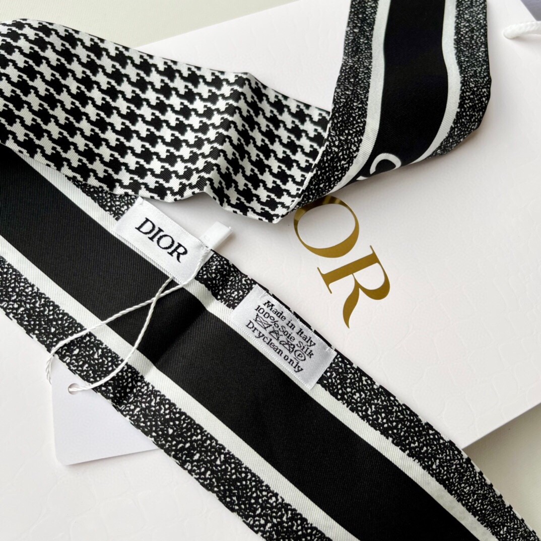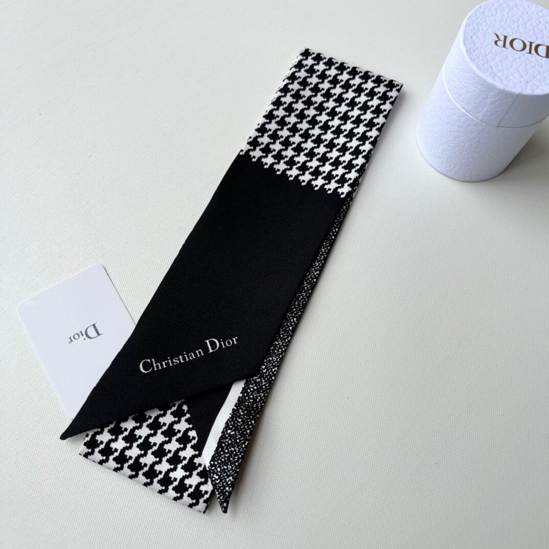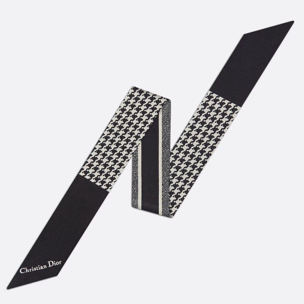 Inspired by the hallmark House address, the 30 Montaigne Mitzah scarf is embellished with a black and white Houndstooth motif. A timeless style, its elongated shape and pointed ends are embellished with a 'CHRISTIAN DIOR' signature jacquard band at the back. The scarf will lend the finishing touch to any modern look and may be tied around the neck, at the wrist or on a bag.