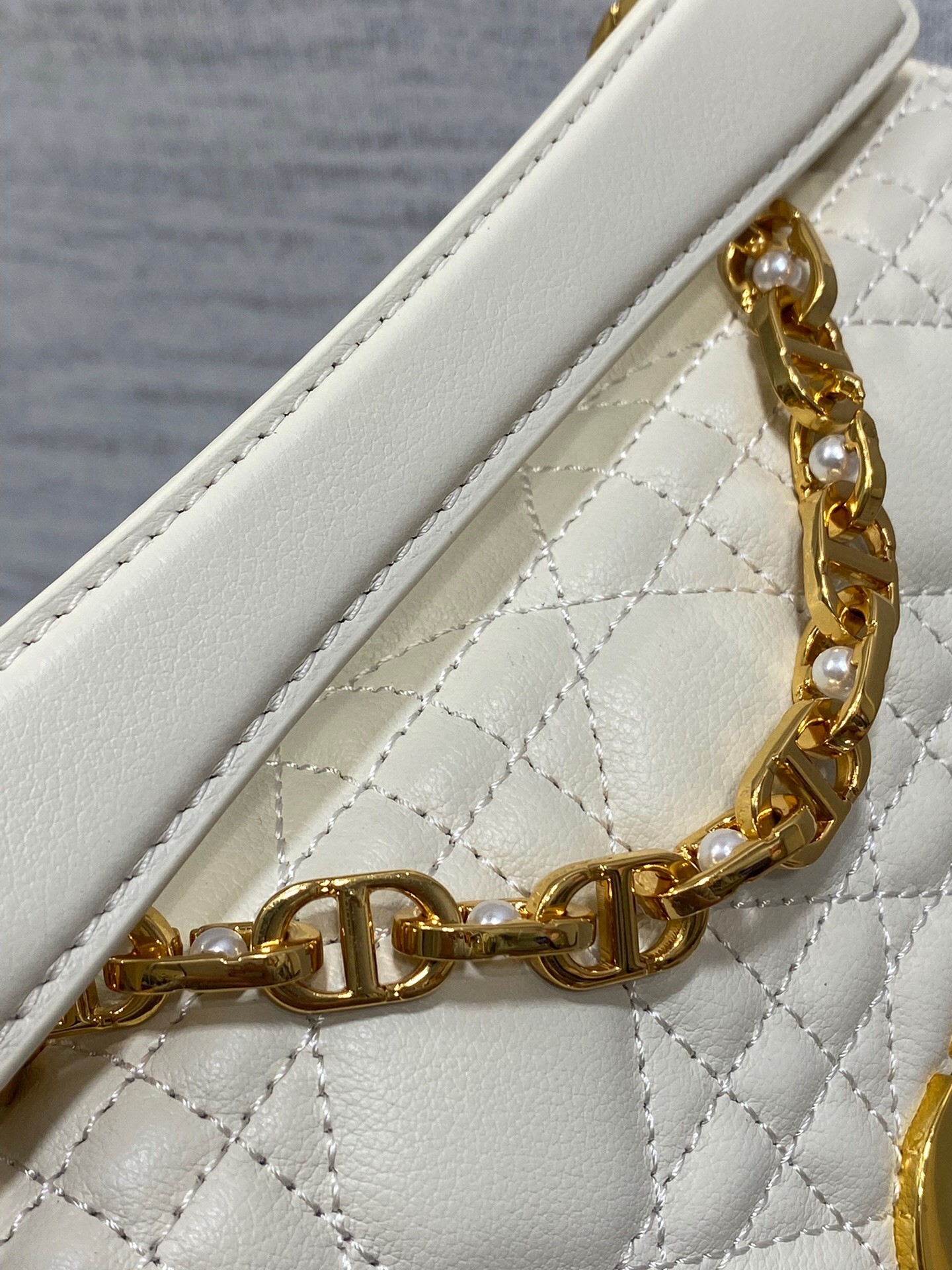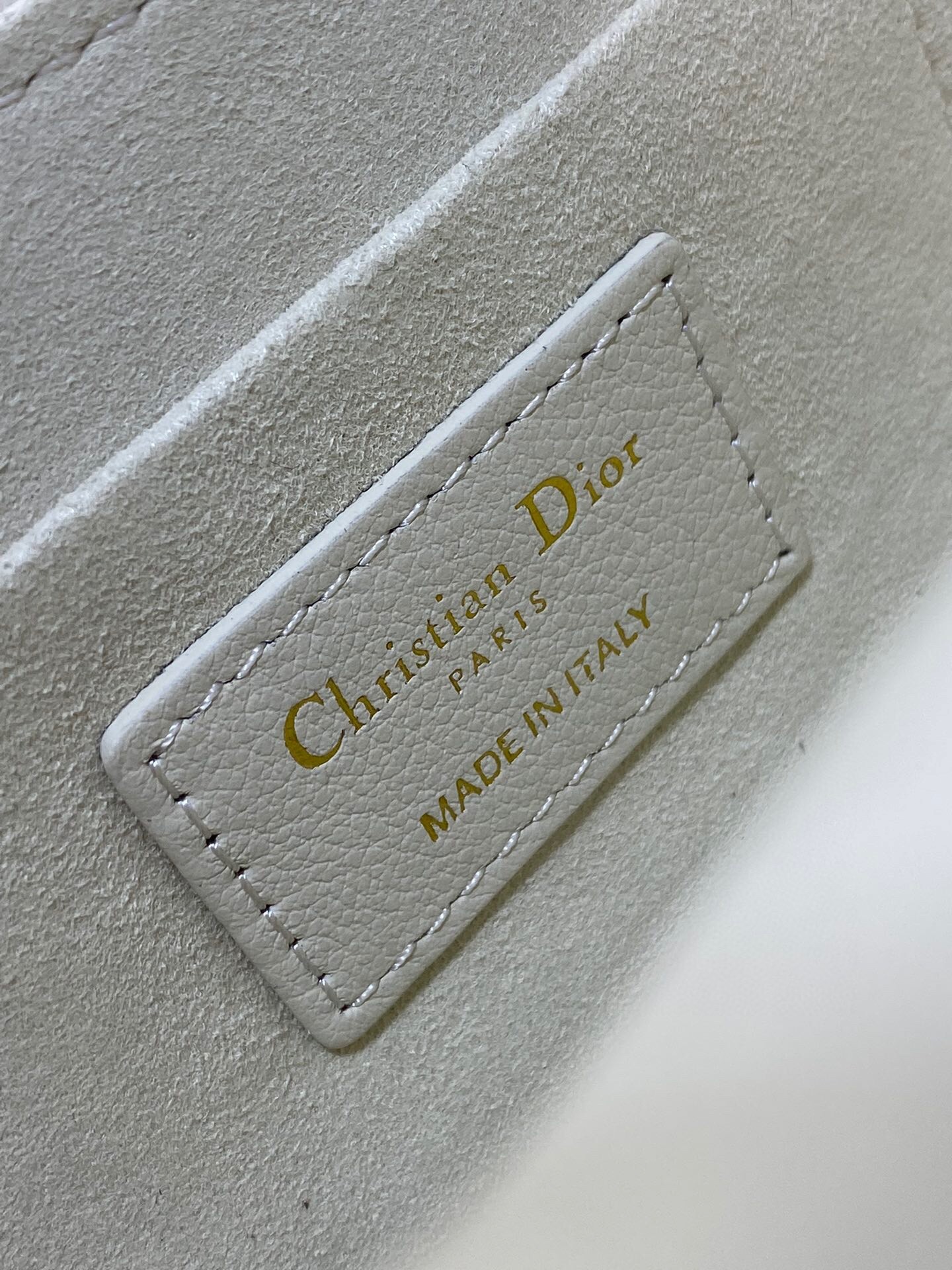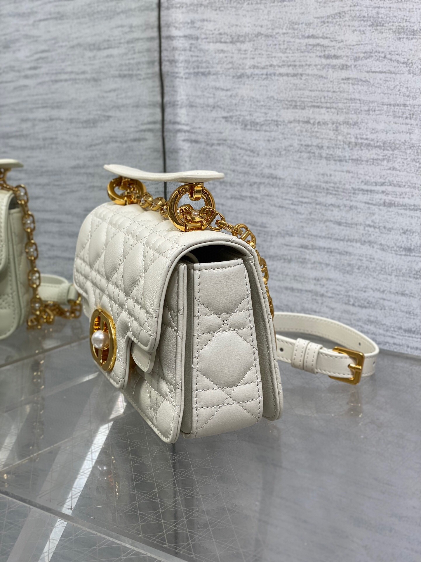 The Dior leather goods lines are enriched by an irresistible new accessory to be taken wherever you go: the Dior Jolie bag. An emblem of Dior elegance, this top handle model - distinguished by its timeless, structured silhouette, dressed in smooth leather and adorned with the iconic graphics of cannage. An exceptional creation, it reflects the House's heritage with a refined clasp comprising the gilded letters "CD", a detail subtly enhanced by a decorative pearl. A perfect addition to any outfit, day or night, it can be carried by hand or on the shoulder, in a sophisticated or more casual style.