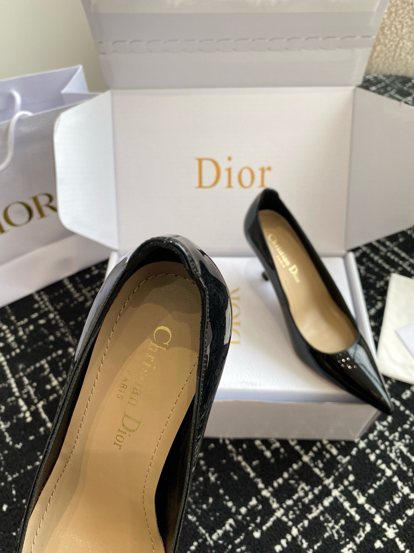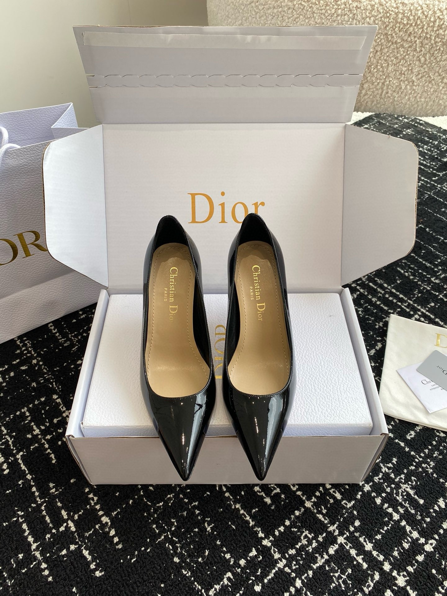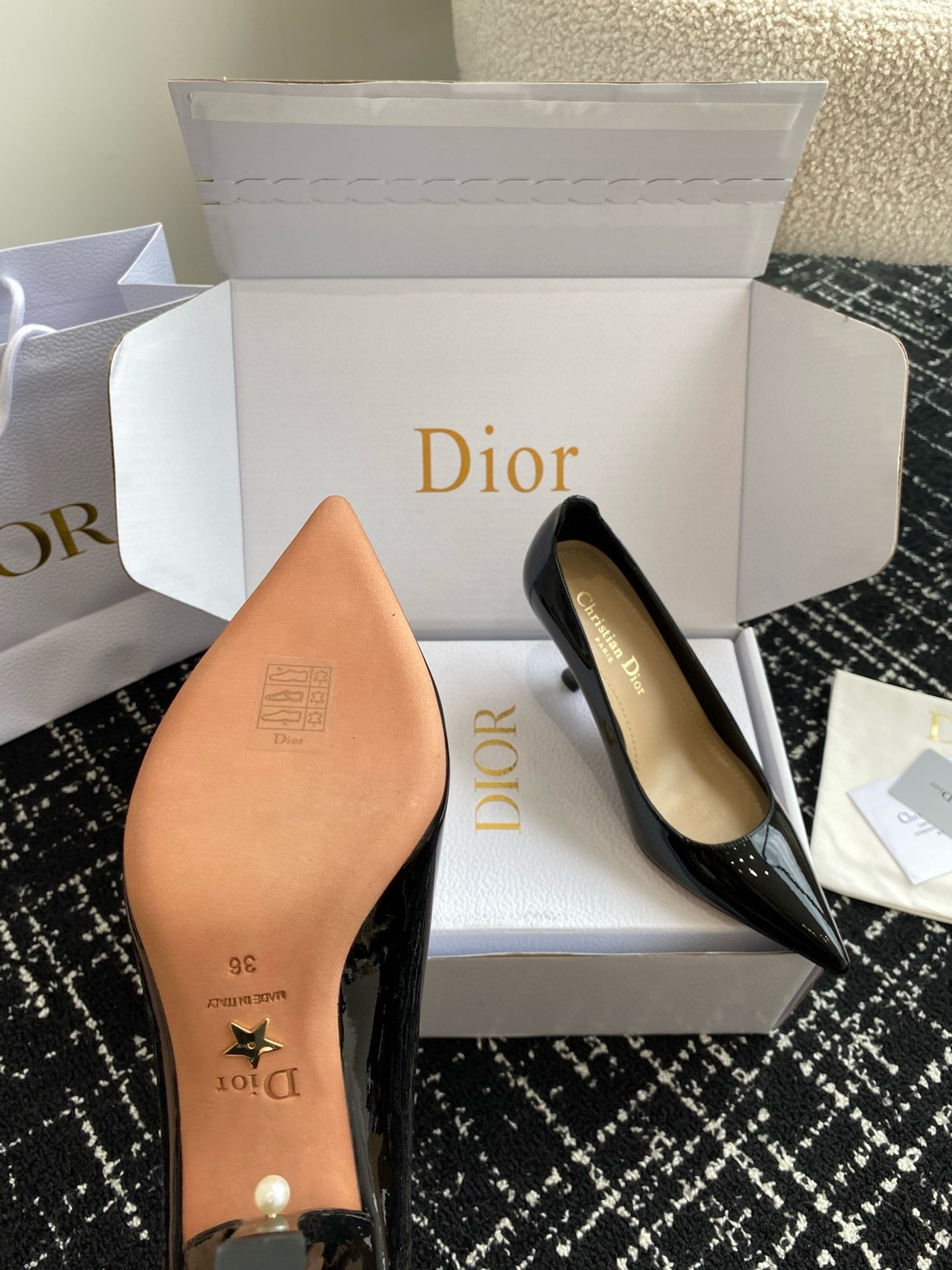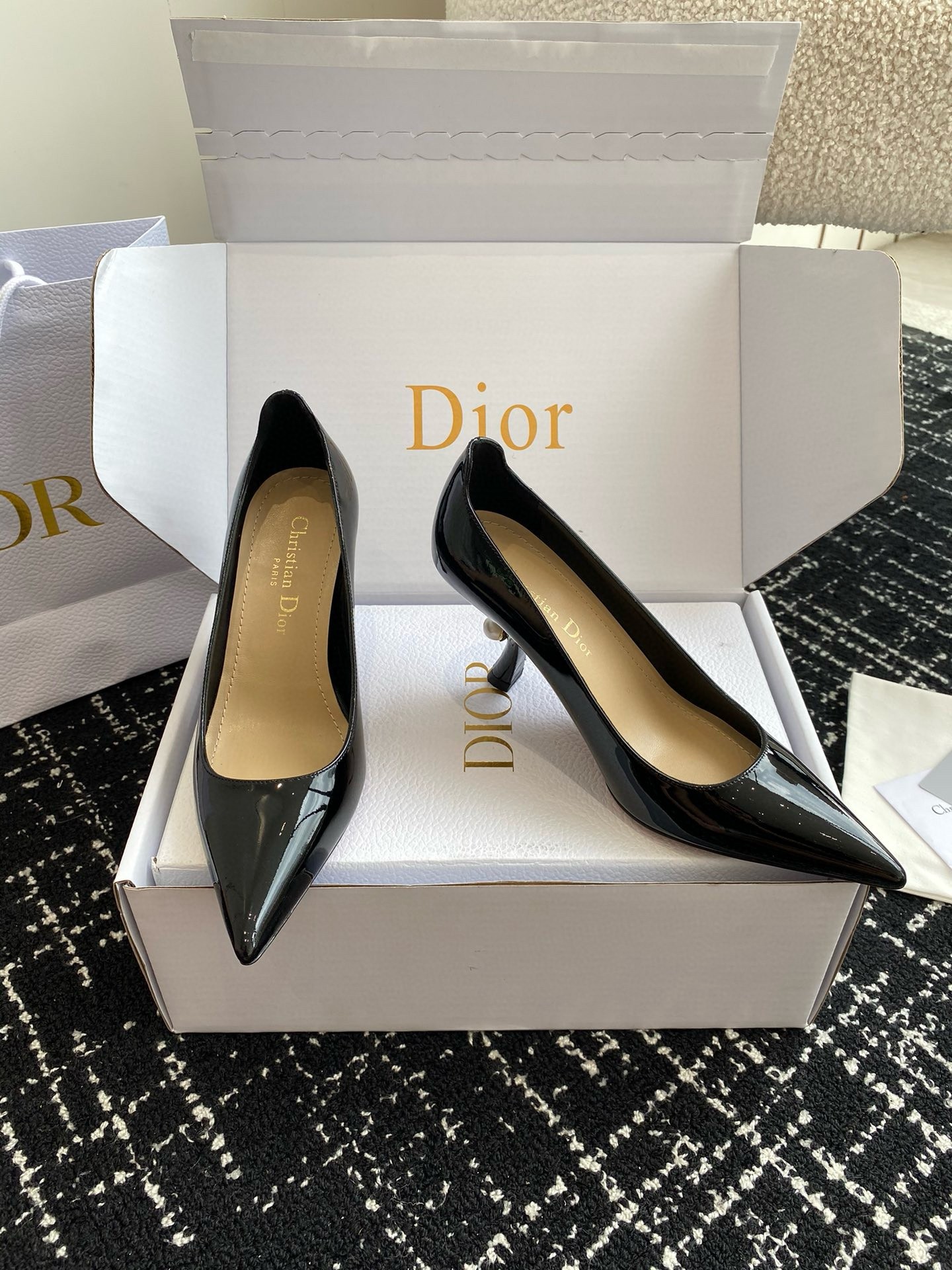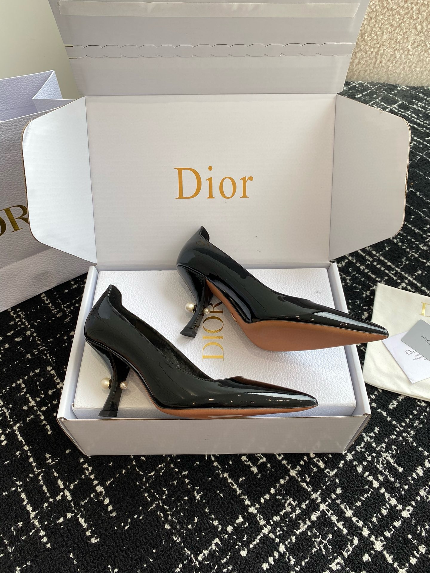 New for Fall 2024, the Dior Tribales pump displays couture appeal. The patent calfskin upper is accented by a graphic cutout on the heel counter. Its 8 cm comma heel is accented with white resin pearls. The rear pearl features a gold-tone CD signature inspired by the namesake earrings. The sophisticated pump has a pointed toe and can be paired easily with any evening wear.