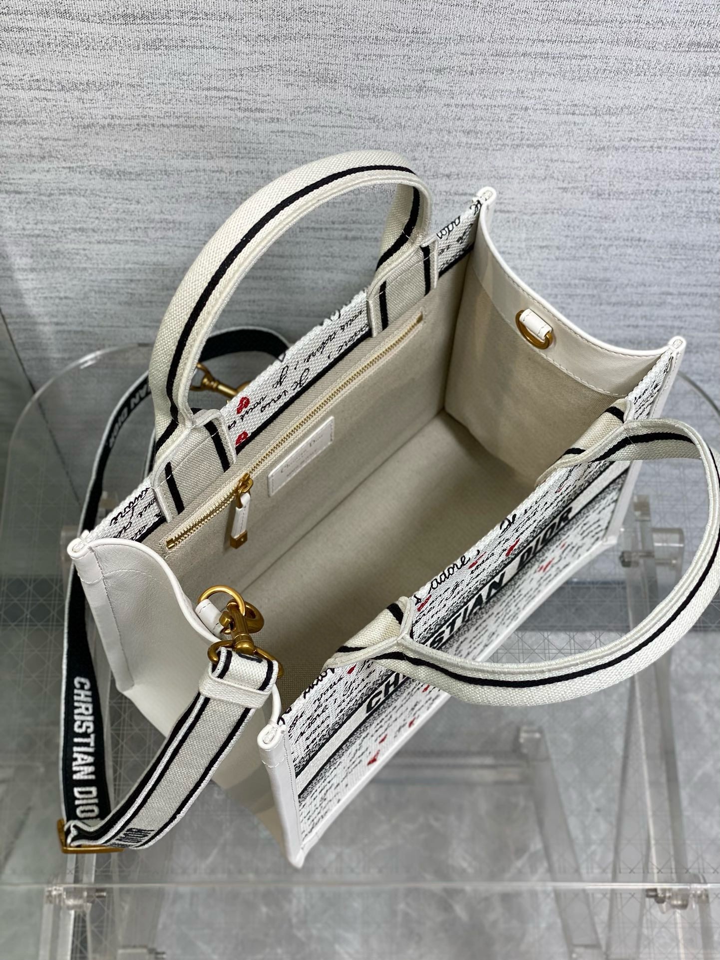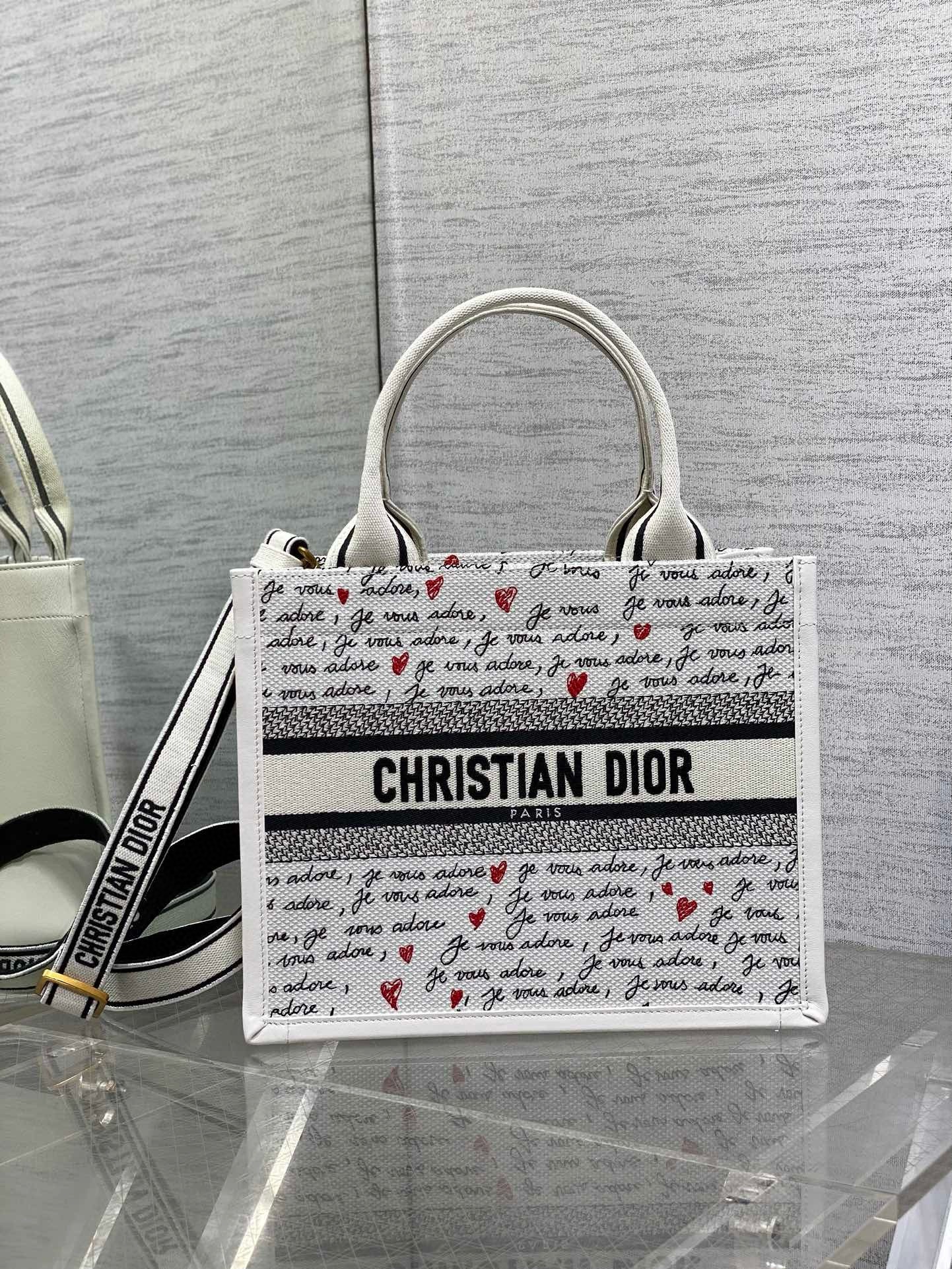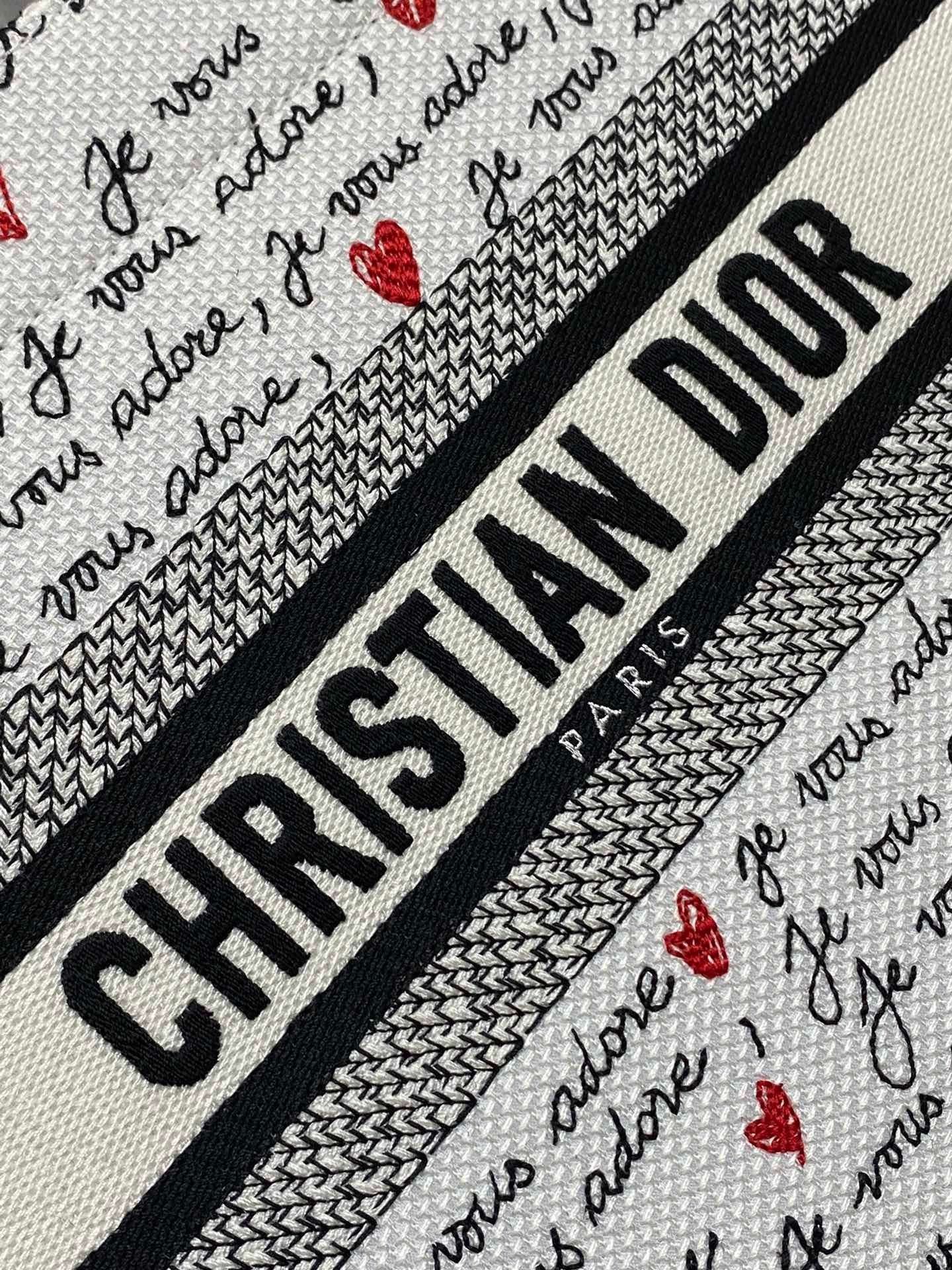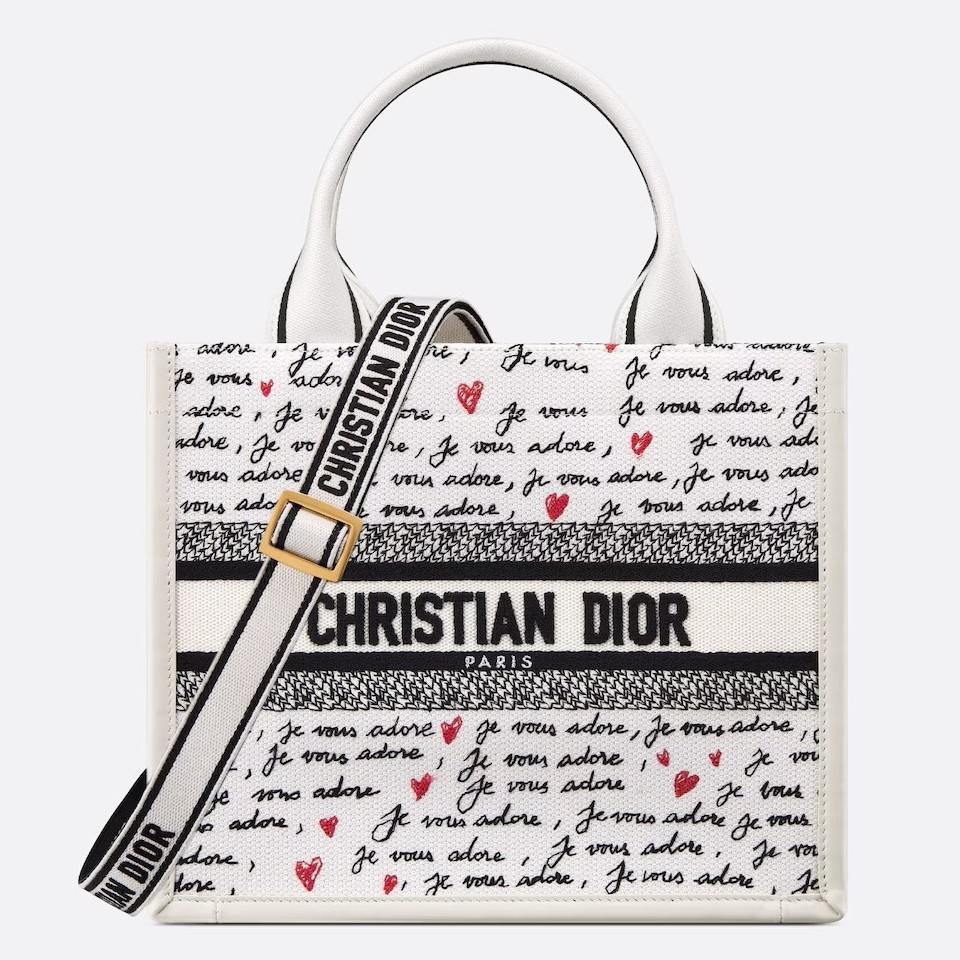 Part of the Dioramour capsule, the Dior Book Tote is an original creation by Maria Grazia Chiuri. The style elegantly combines white calfskin with white embroidery, showcasing the black and red Je Vous Adore (I Love You) motif, inspired by the Marc Bohan for Dior archives. Designed to organize all the daily essentials, the interior reveals a zip pocket and slip pockets. Equipped with an adjustable and removable embroidered strap, the functional small tote can be carried by hand or worn over the shoulder, and it will coordinate well with other Dioramour creations.