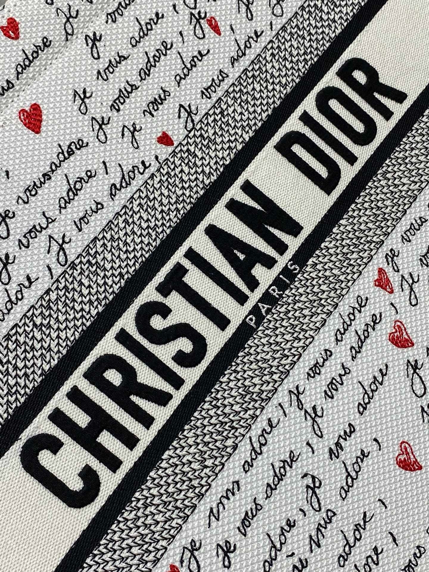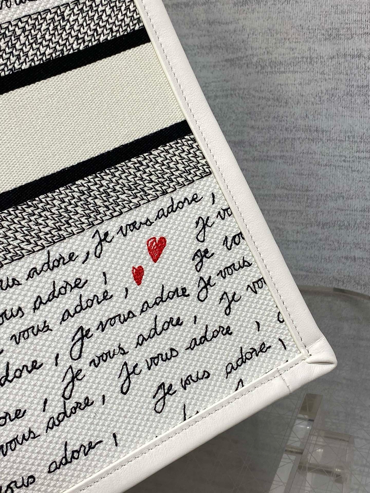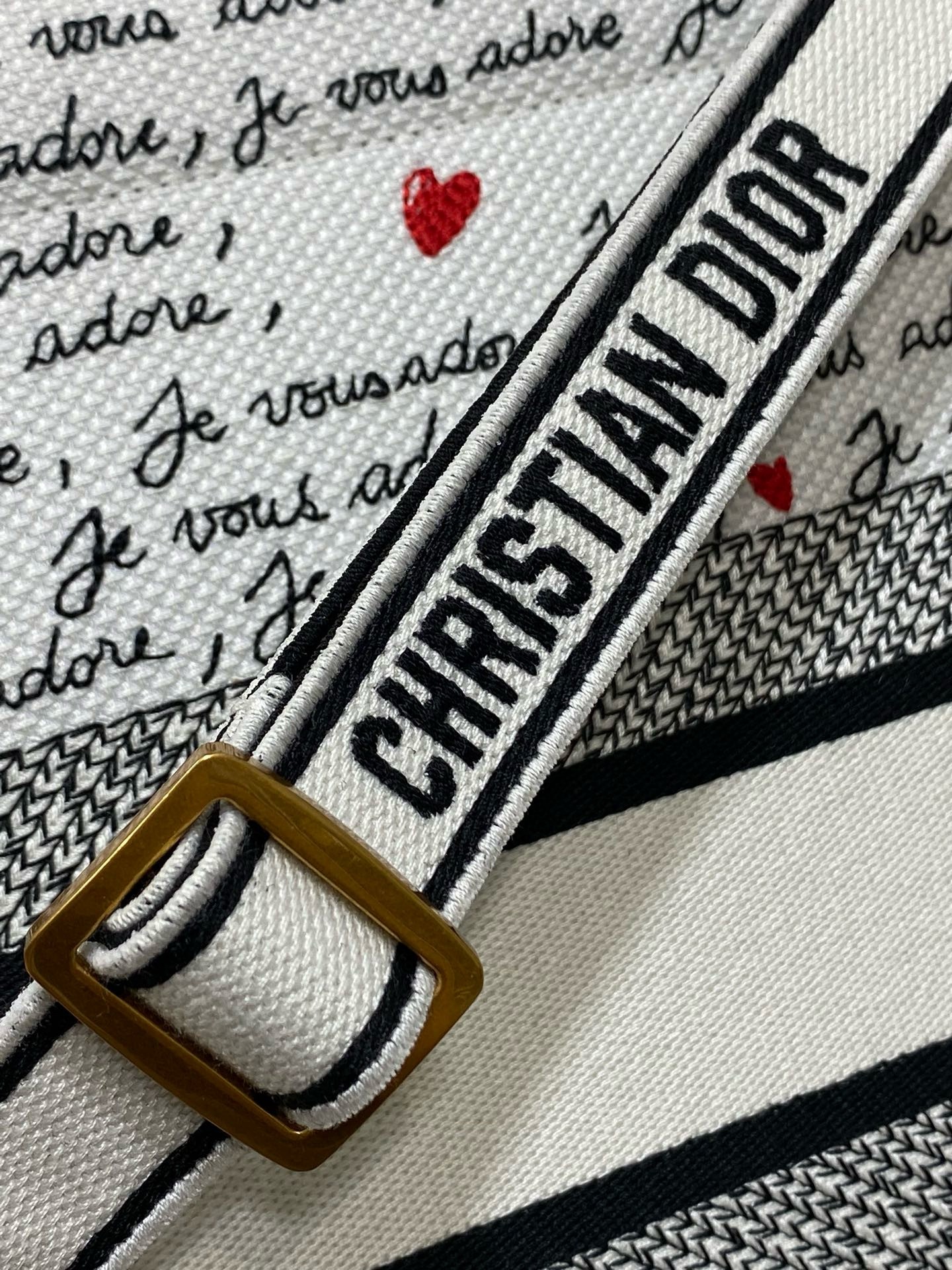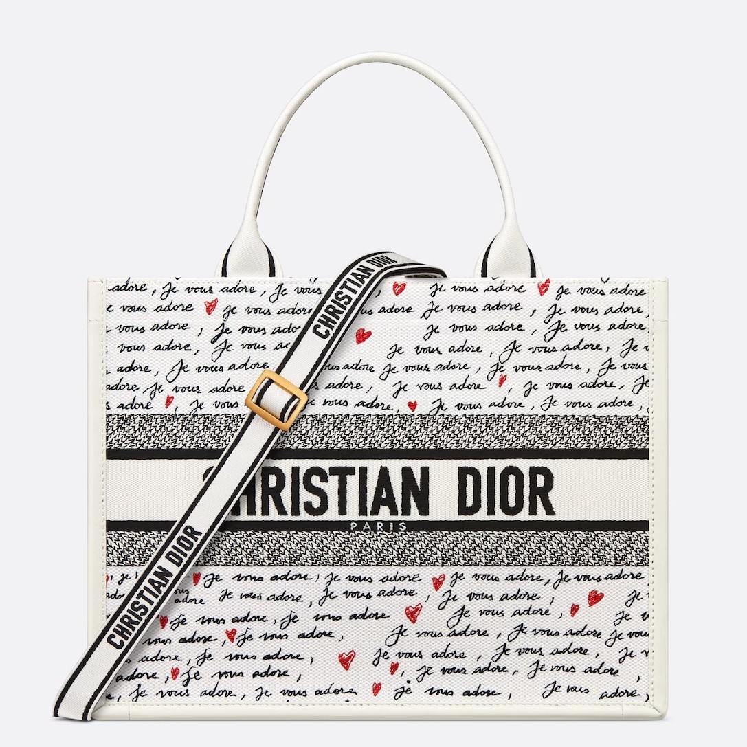 Part of the Dioramour capsule, the Dior Book Tote is an original creation by Maria Grazia Chiuri. The style elegantly combines white calfskin with white embroidery, showcasing the black and red Je Vous Adore (I Love You) motif, inspired by the Marc Bohan for Dior archives. Designed to organize all the daily essentials, the interior reveals a zip pocket and slip pockets. Equipped with an adjustable and removable embroidered strap, the functional medium tote can be carried by hand or worn over the shoulder, and it will coordinate well with other Dioramour creations.