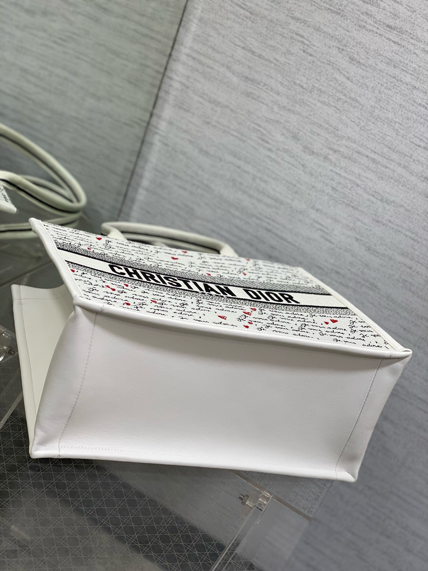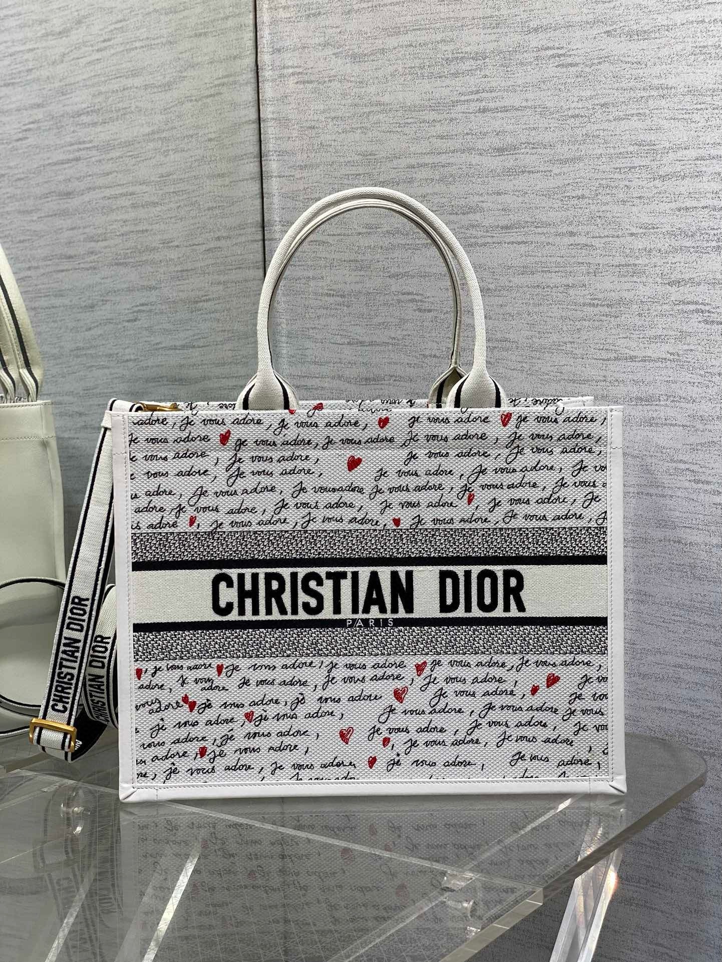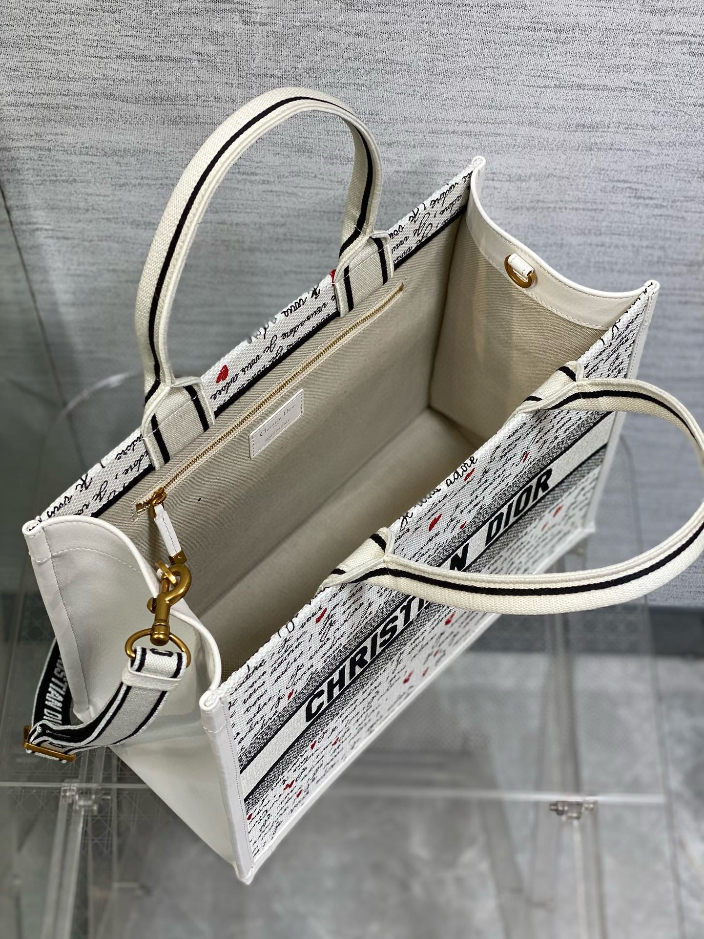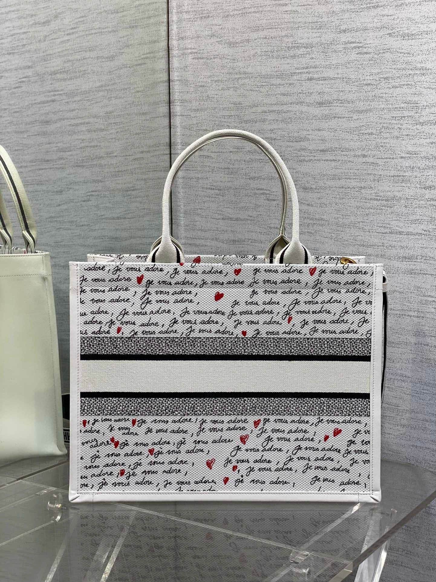 Part of the Dioramour capsule, the Dior Book Tote is an original creation by Maria Grazia Chiuri. The style elegantly combines white calfskin with white embroidery, showcasing the black and red Je Vous Adore (I Love You) motif, inspired by the Marc Bohan for Dior archives. Designed to organize all the daily essentials, the interior reveals a zip pocket and slip pockets. Equipped with an adjustable and removable embroidered strap, the functional medium tote can be carried by hand or worn over the shoulder, and it will coordinate well with other Dioramour creations.