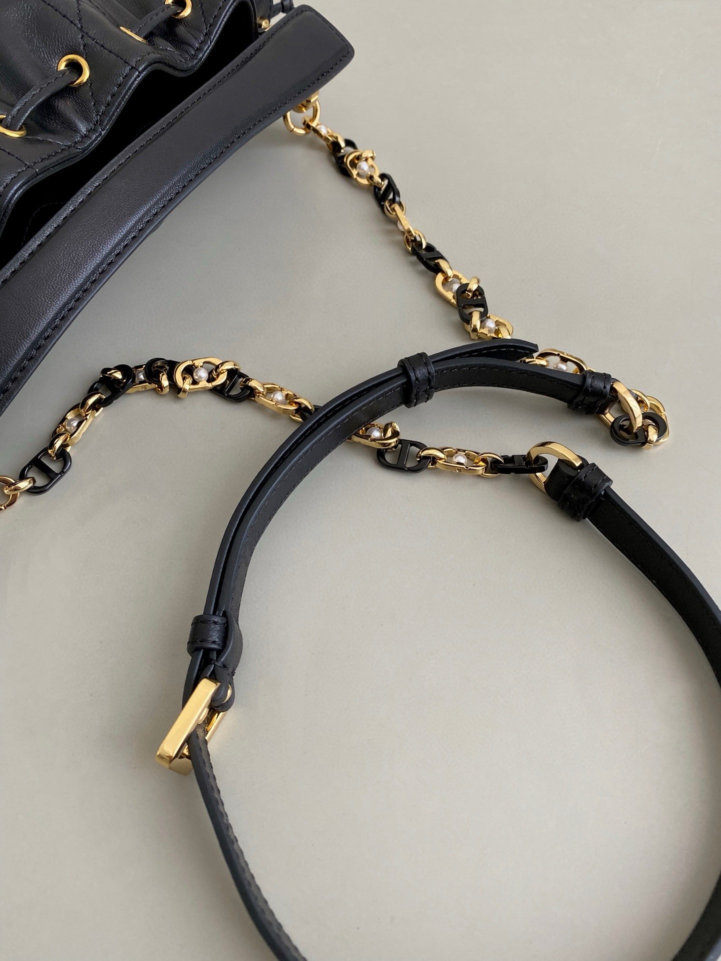 New for Fall 2024, the Dior Jolie bucket bag is a modern creation. Constructed in lambskin and calfskin with Macrocannage stitching, it has a drawstring closure and spacious interior. Featuring a removable black leather top handle and adjustable, removable CD link chain in gold-finish metal accented by resin pearls, the small contemporary bag can be carried by hand, worn over the shoulder or crossbody.