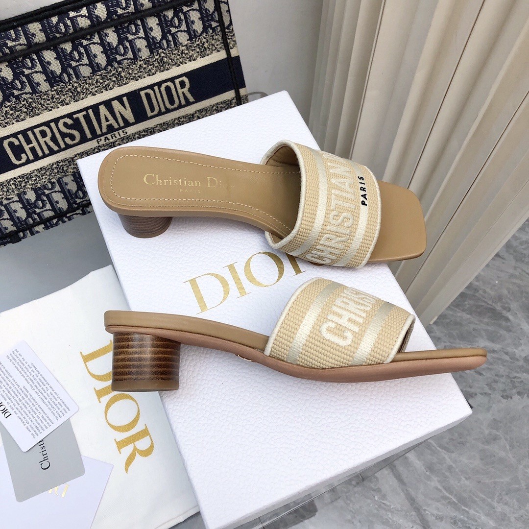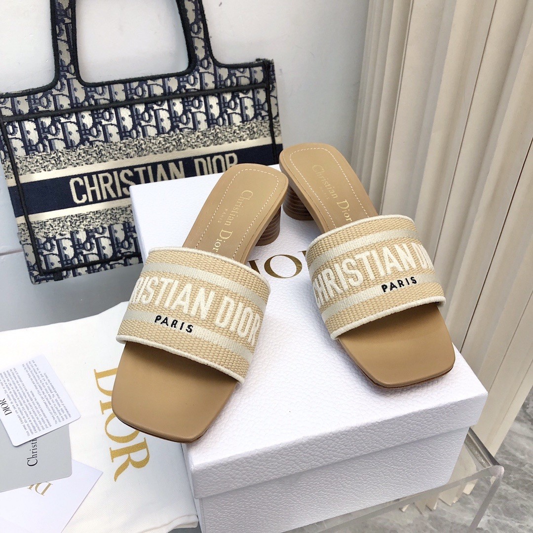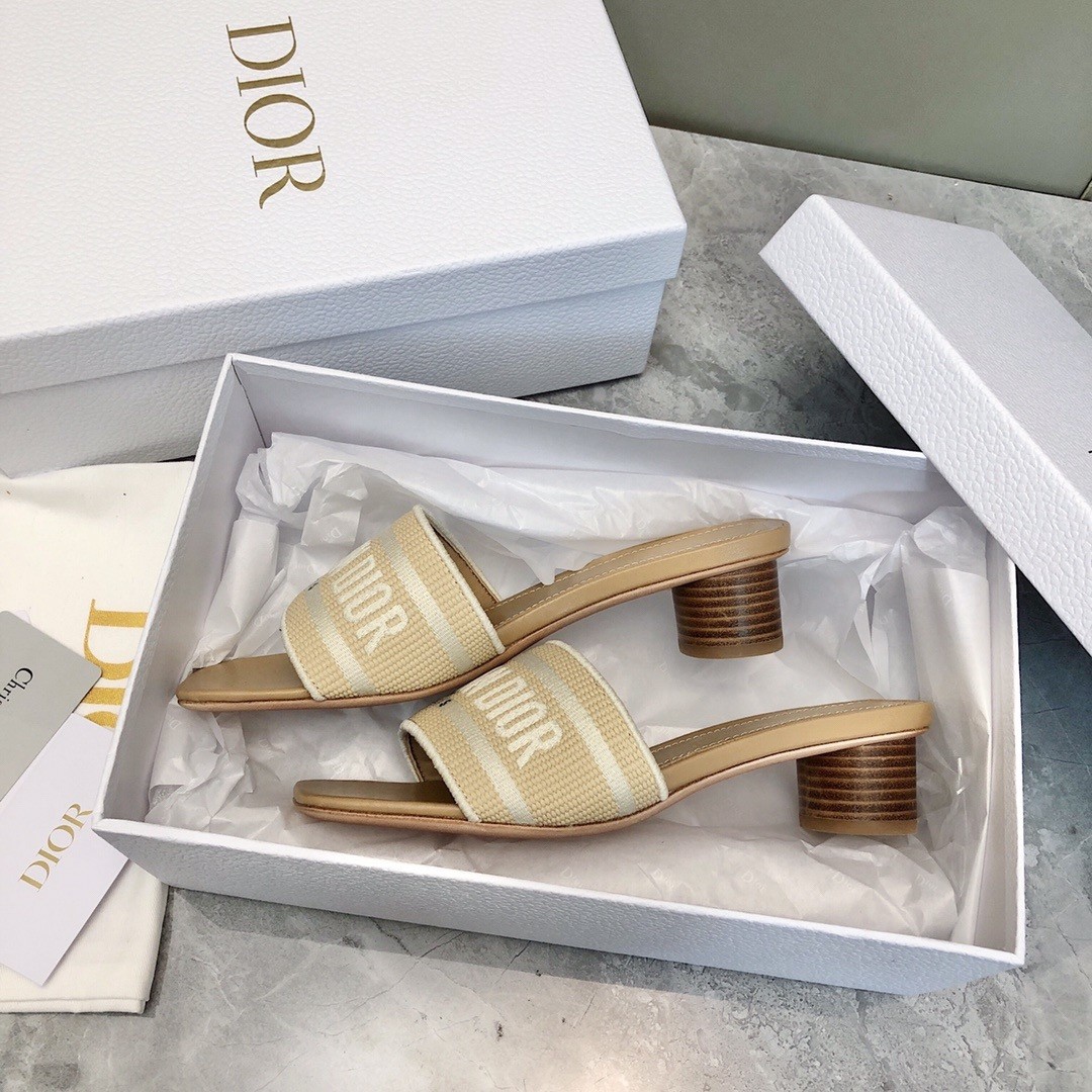 Part of the Dioriviera capsule, the Dway heeled slide is a hallmark and timeless design. The natural raffia and cotton upper is embroidered with the Christian Dior Paris signature, lending an instantly recognizable touch. Completed by a 3.5-cm (1.5) cylindrical heel and square toe, the slide will elevate outfits with a modern look and can be coordinated with other pieces from the Dioriviera capsule.