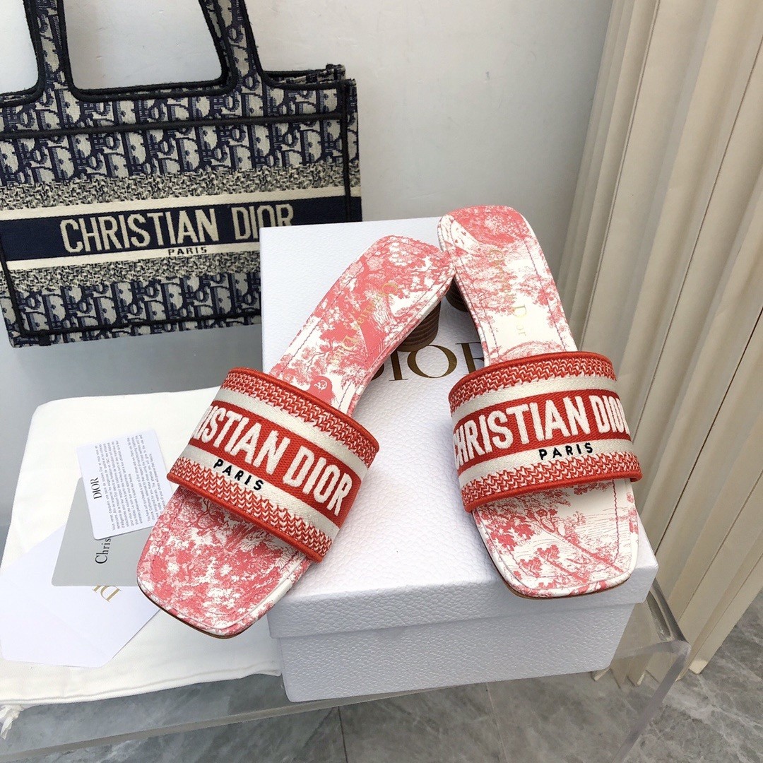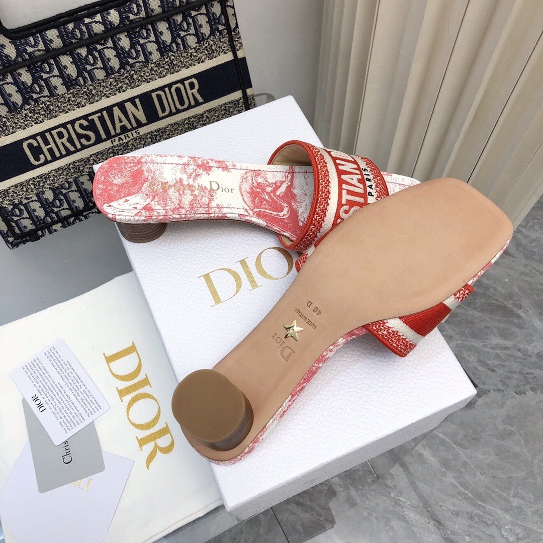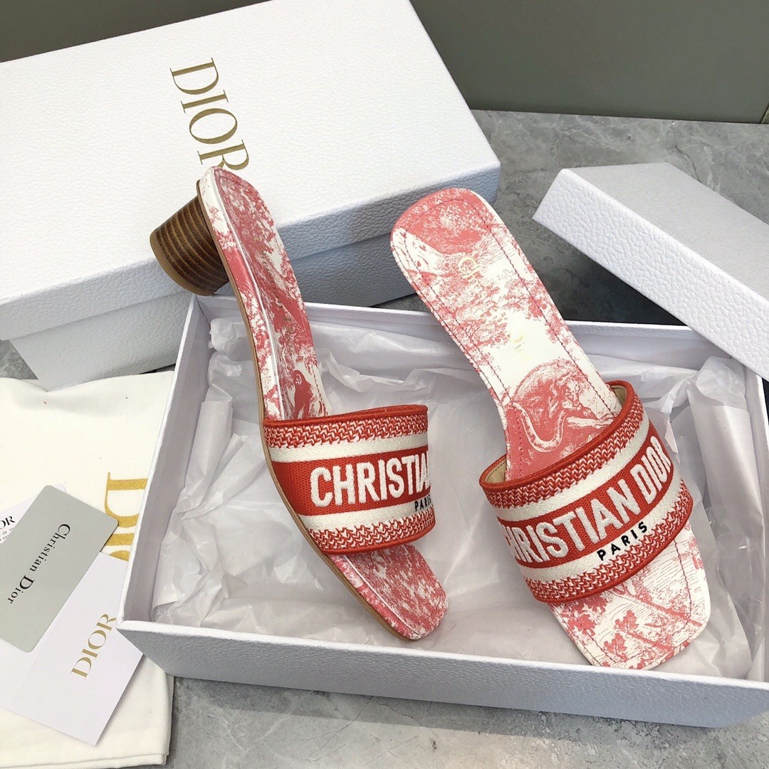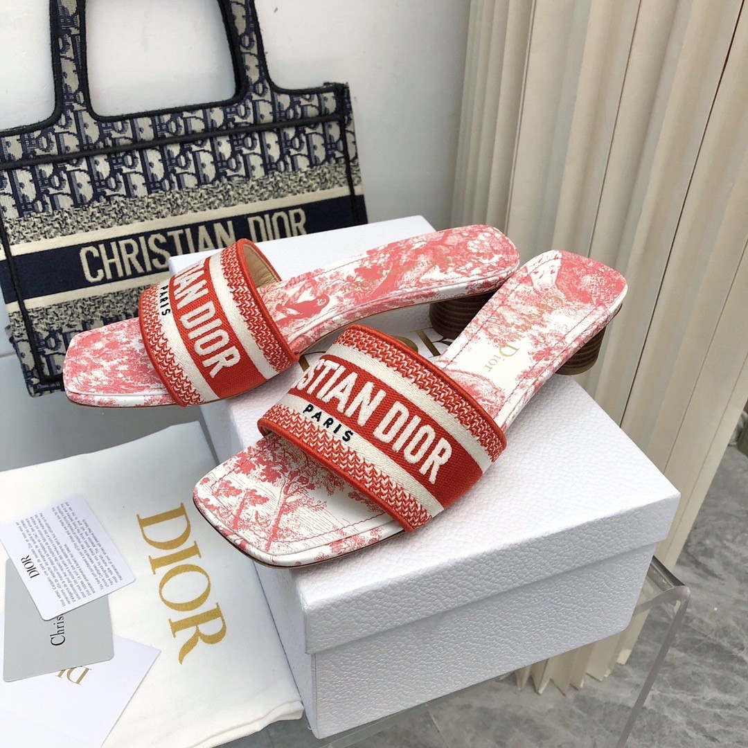 Part of the Dioriviera capsule, the hallmark Dway heeled slide honors the Toile de Jouy Sauvage motif. The upper is embroidered with the Christian Dior Paris signature for an instantly recognizable touch, while the square toe adds modern appeal. Completed by a 3.5 cm cylindrical heel, the slide will bring a contemporary twist to outfits and can be coordinated with other pieces from the Dioriviera capsule.