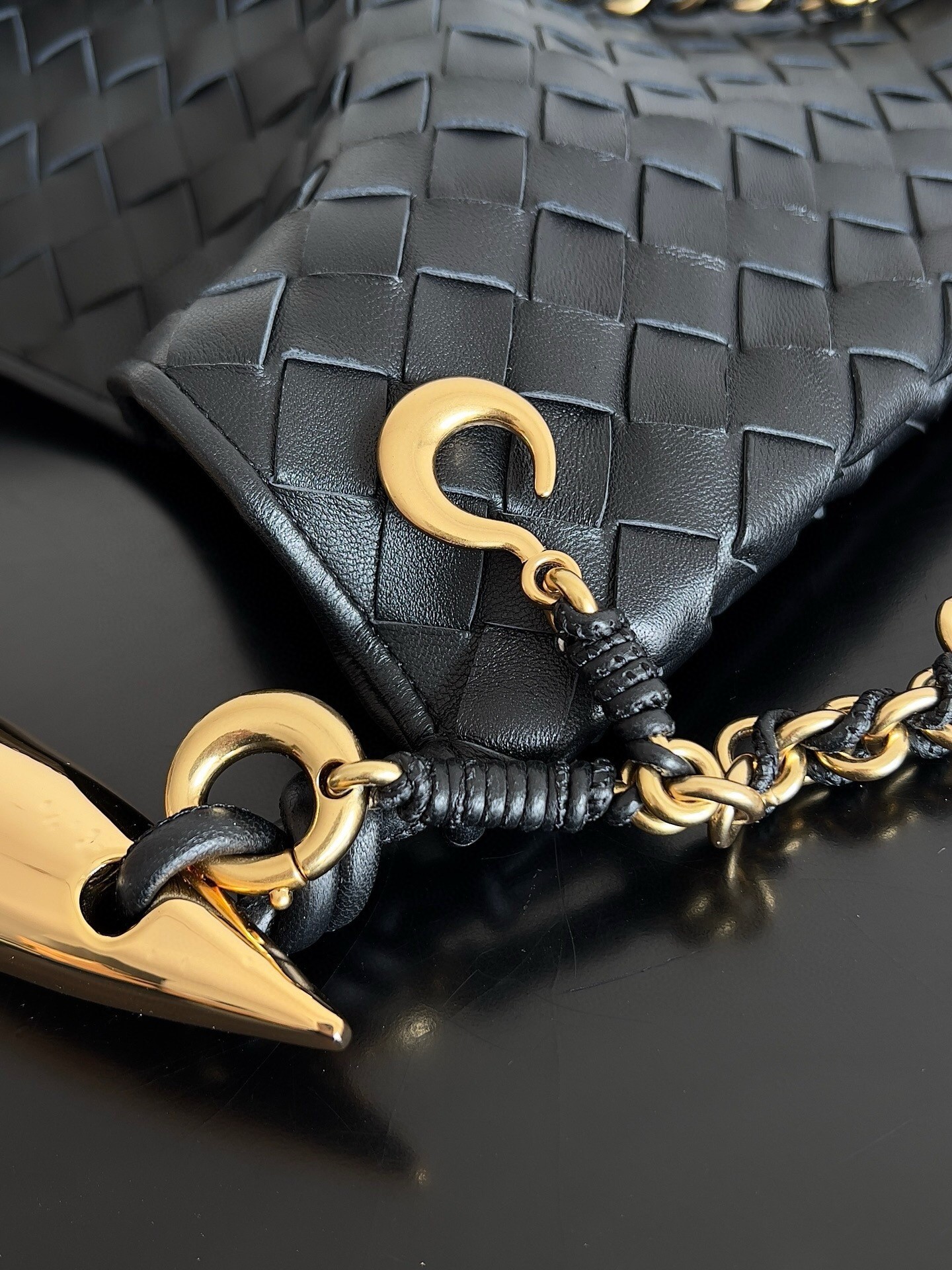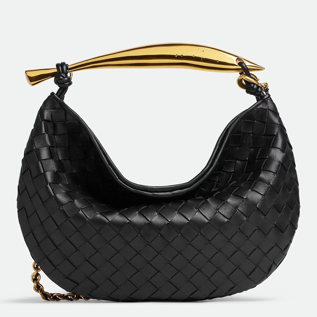 Bottega Veneta's Sardine bag just keeps getting better. The latest intrecciato version comes in lambskin with a slouchy silhouette and braided chain. The name, of course, comes from the playful, fish-shaped handle – match your jewelry to its gold-tone.