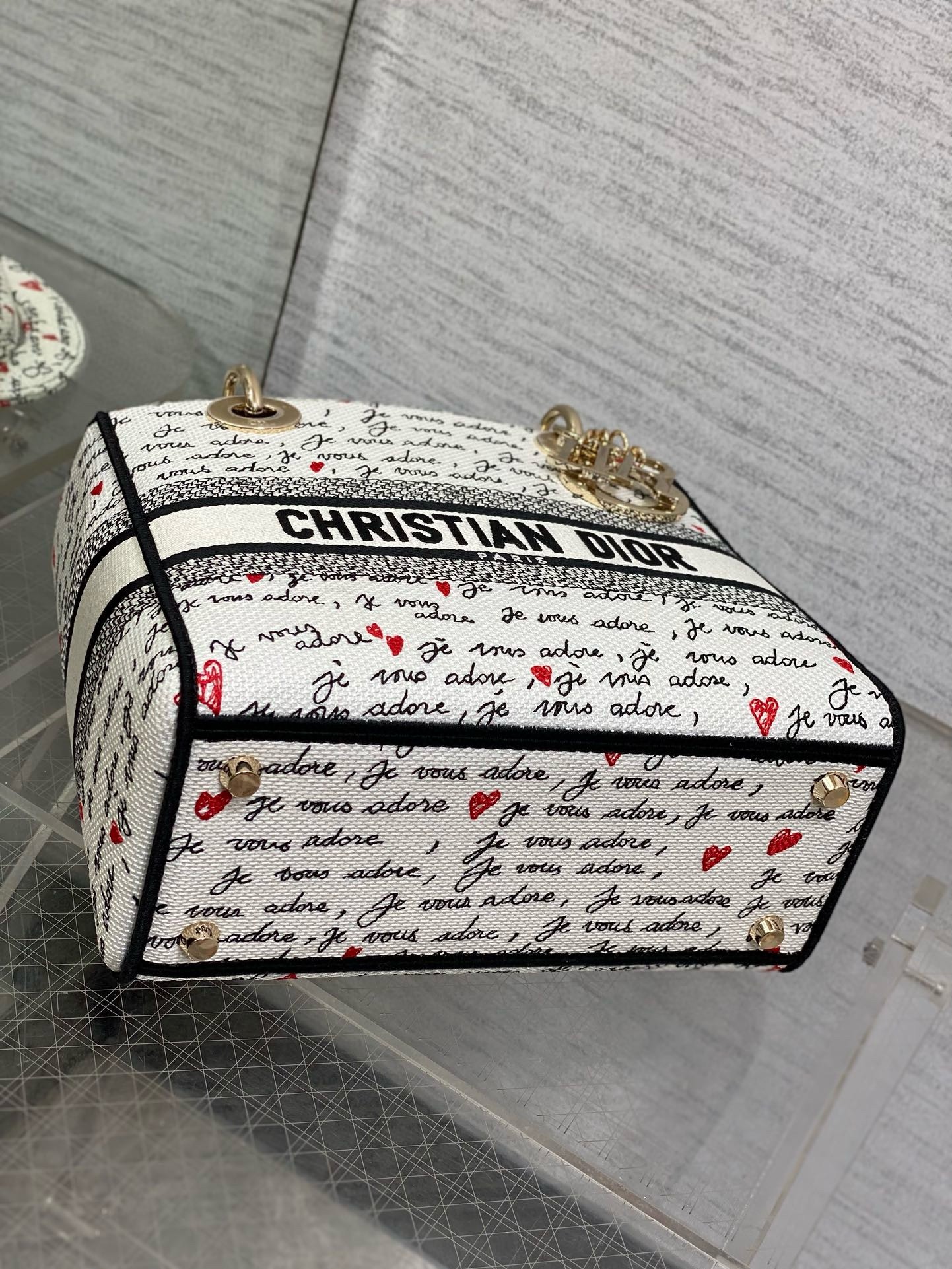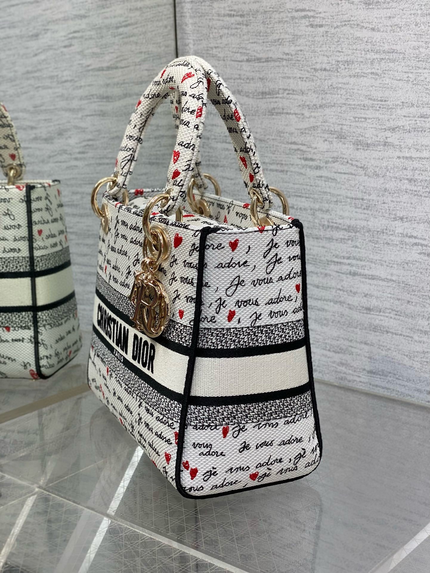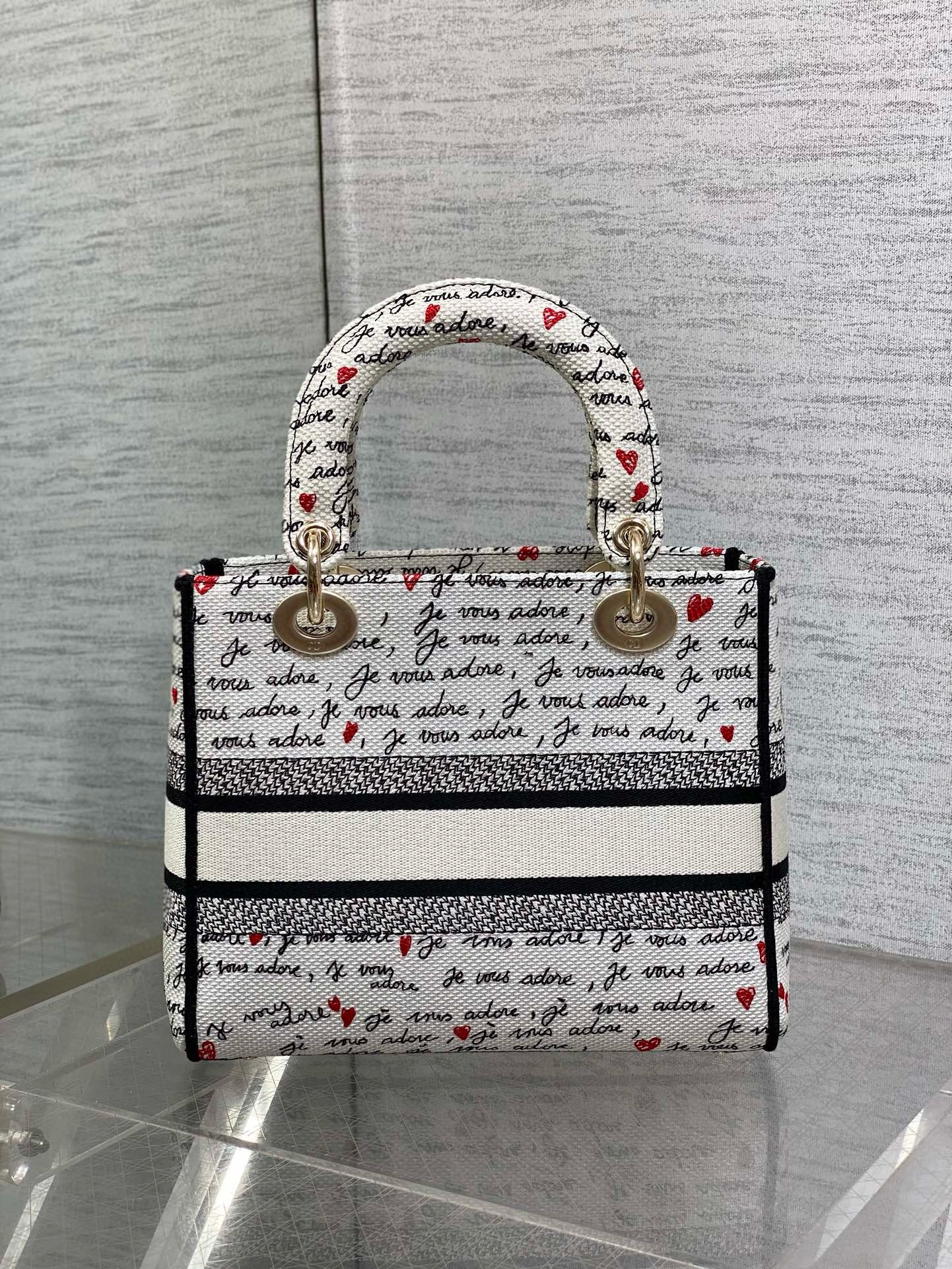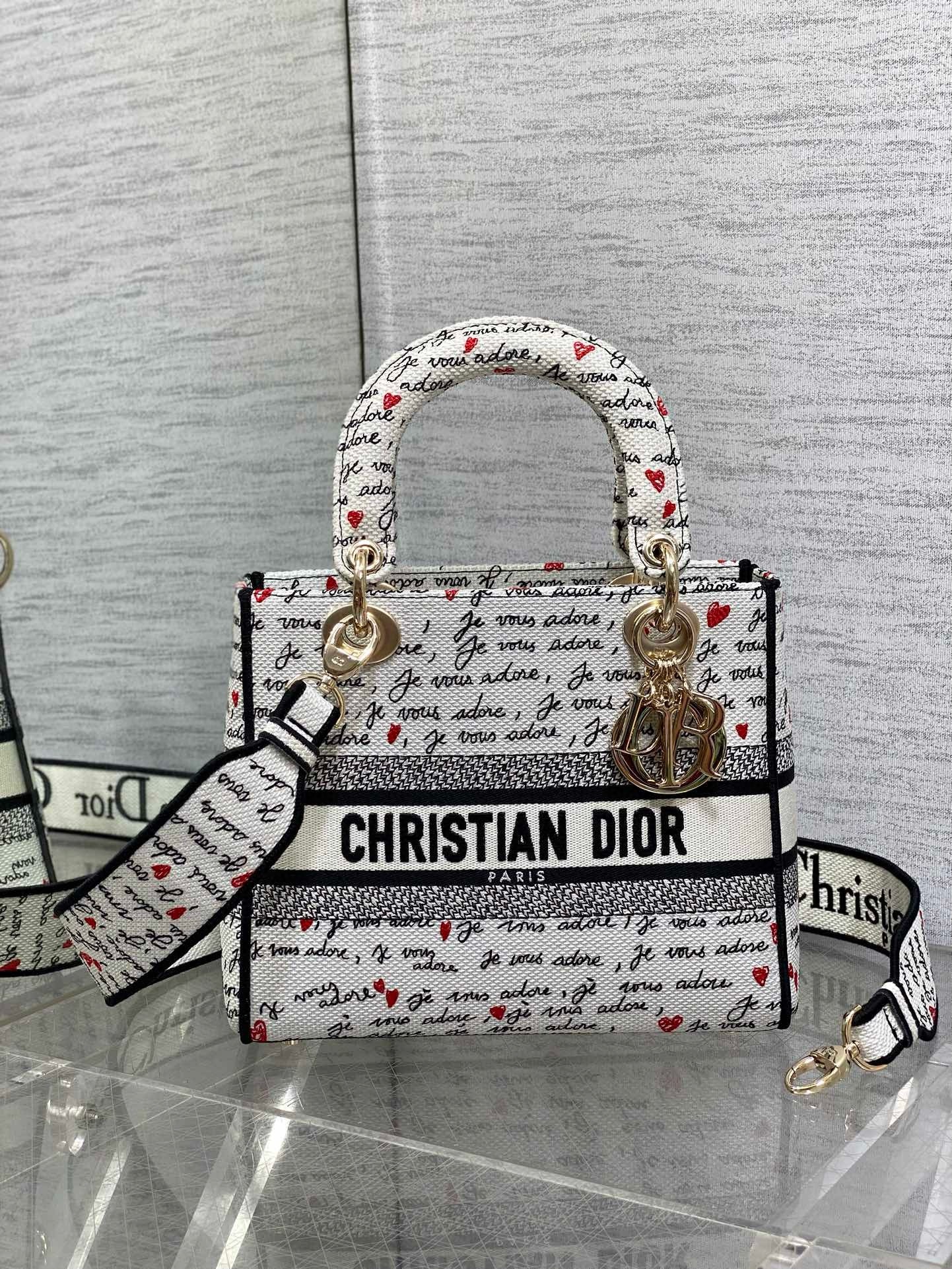Part of the Dioramour capsule, the Lady D-Lite bag combines classic elegance with House modernity. The white style is fully embroidered with the black and red Je Vous Adore (I Love You) motif, inspired by the Marc Bohan for Dior archives. The front features a Christian Dior Paris signature while the pale gold-finish metal D.I.O.R. charms are complemented by a red enamel heart charm. Equipped with a wide, reversible and removable embroidered strap, the medium Lady D-Lite bag can be carried by hand or worn crossbody, and it will coordinate well with other Dioramour creations.