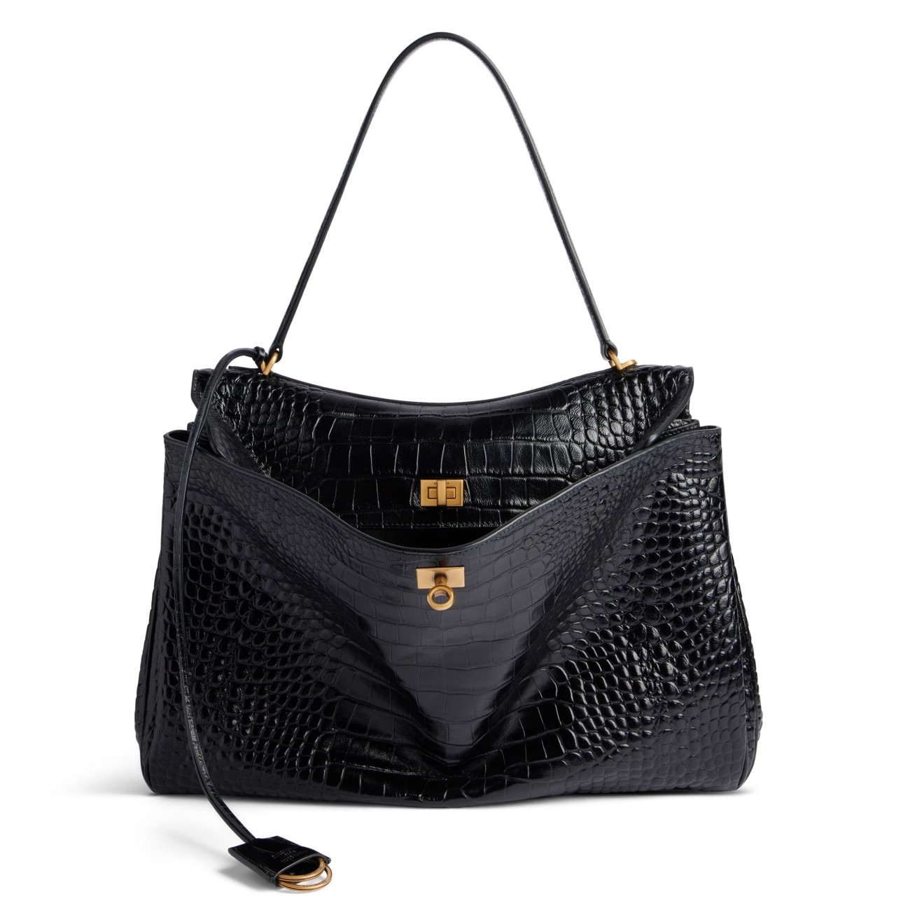 Launching on May 10th, 2024, a campaign photographed by Mario Sorrenti showcases the Balenciaga Rodeo Bag, an instant icon named for the world-famous intersection of luxury and fashion, Rodeo Drive in Beverly Hills. This large style is crafted in calfskin embossedd with crocodile finish. Its one-of-a-kind construction and versatile closure options effect a relaxed attitude. Pre-worn pleats, softened piping, and raw edges call to mind a favorite item worn daily, or an heirloom passed between generations.