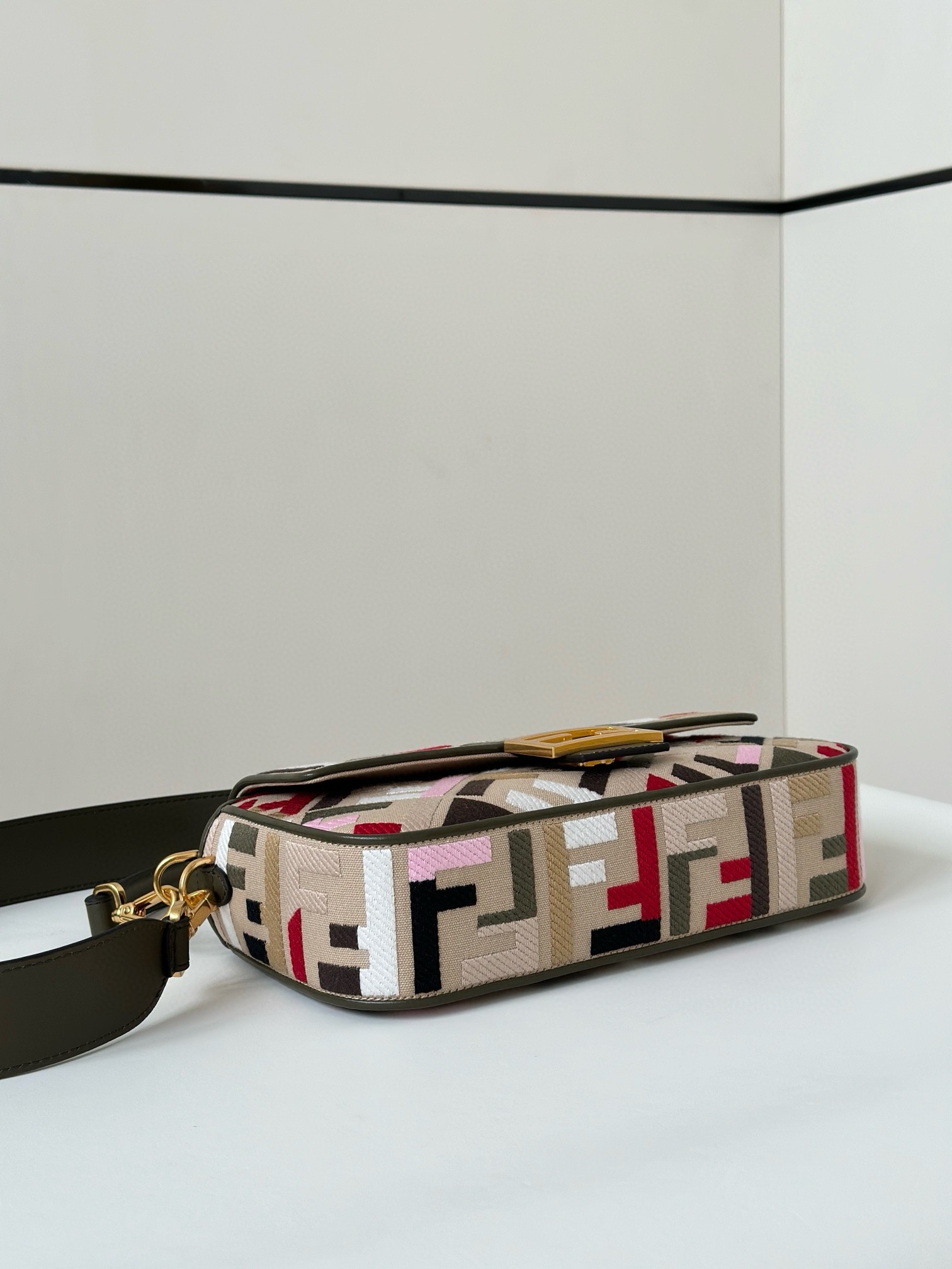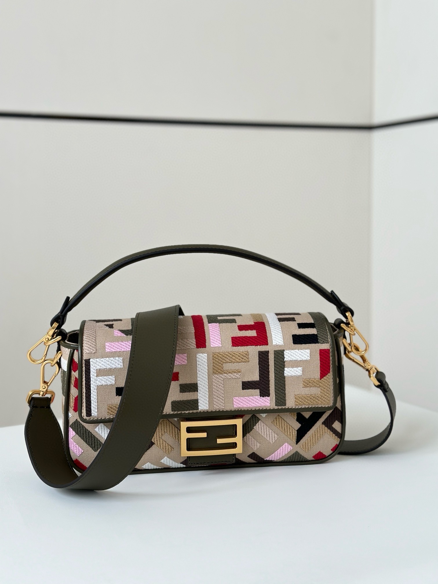 Iconic medium Baguette bag, created in 1997 which went on to become the leading It bag. Versatile and with timeless appeal, it features the iconic underarm design inspired by the French Baguette bread from which it takes its name. Made of canvas fabric with the iconic embossed FF motif embroidered in multicolor yarn. Trimmed in green calfskin and embellished with an FF clasp. The bag can be carried by hand, or worn either on the shoulder or cross-body thanks to the handle and shoulder strap, both detachable.