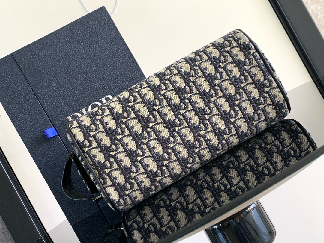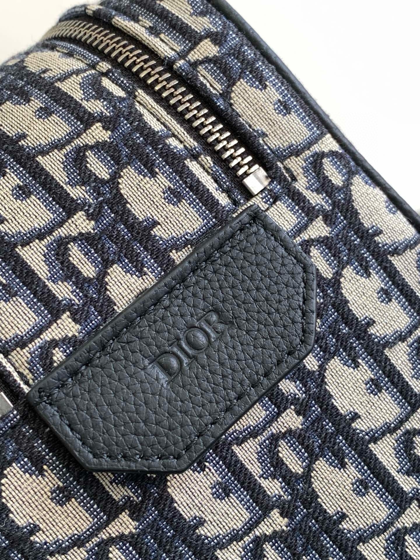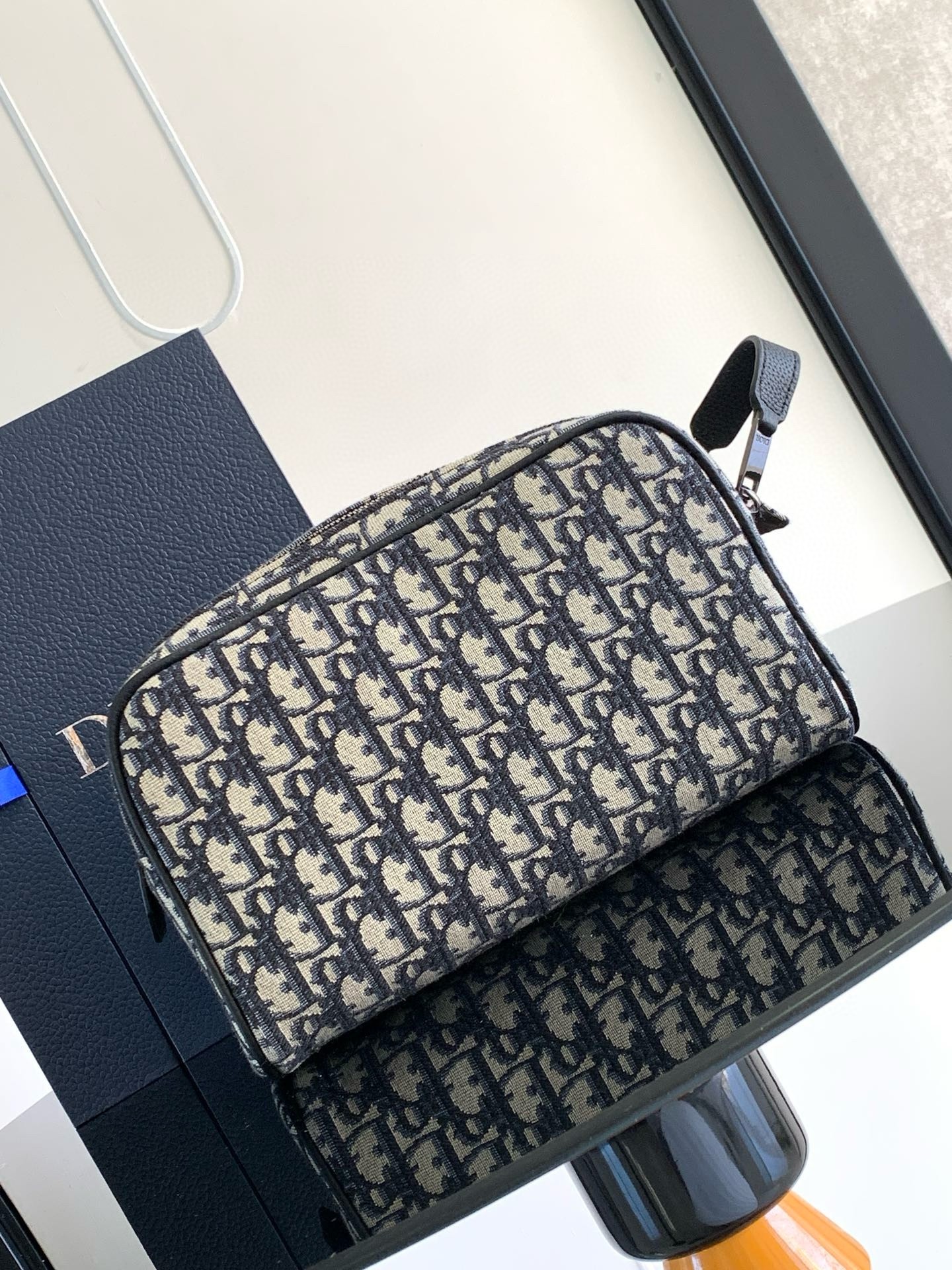 The toiletry bag is a functional accessory with a streamlined silhouette. Crafted in beige and black Dior Oblique jacquard, it is embellished with black grained calfskin trim and a Dior signature on the front. The style features a zip pocket on the front as well as a spacious zip compartment with two slip pockets. Equipped with a leather handle, the toiletry bag can be carried by hand or tucked into any bag.