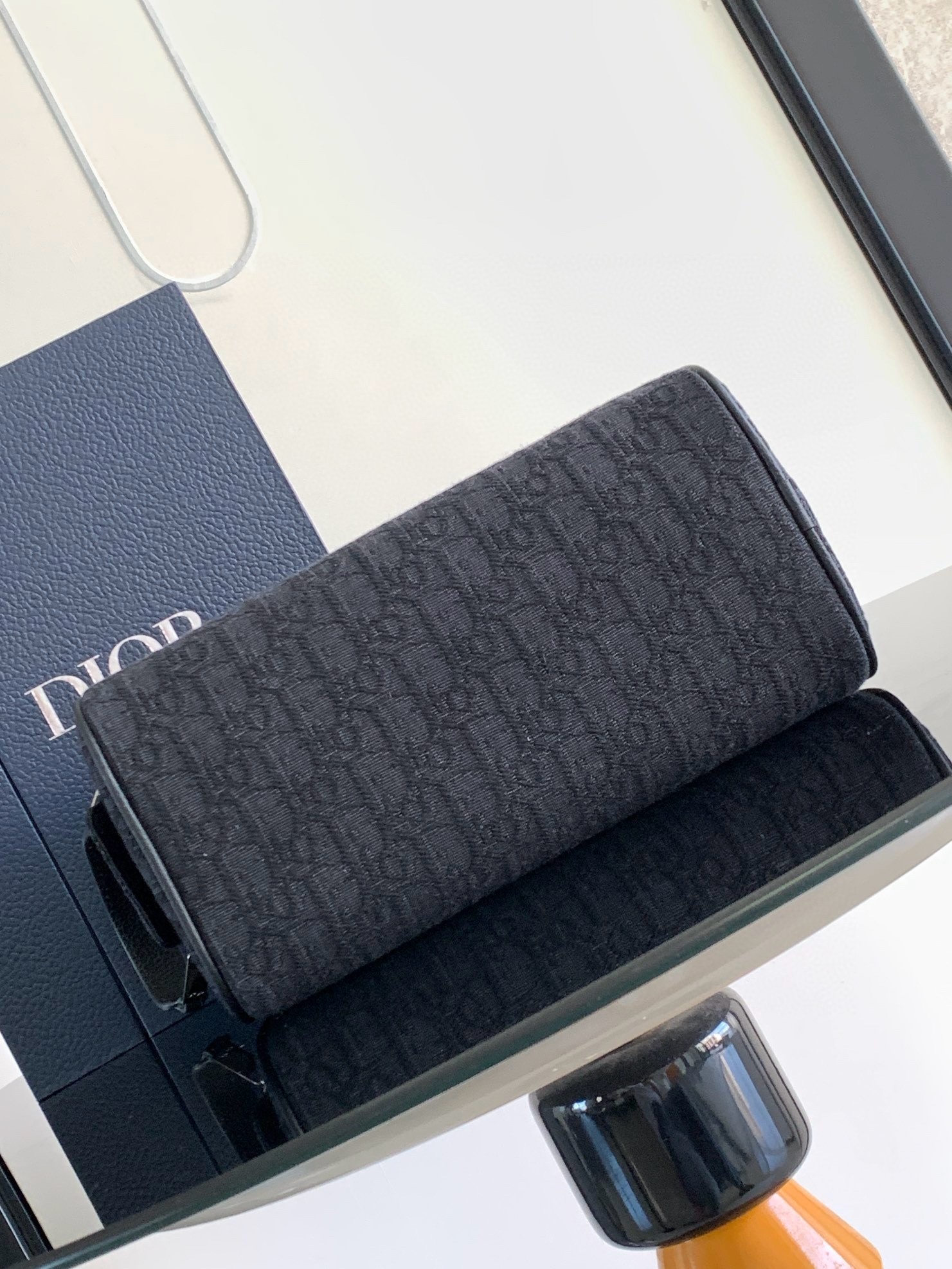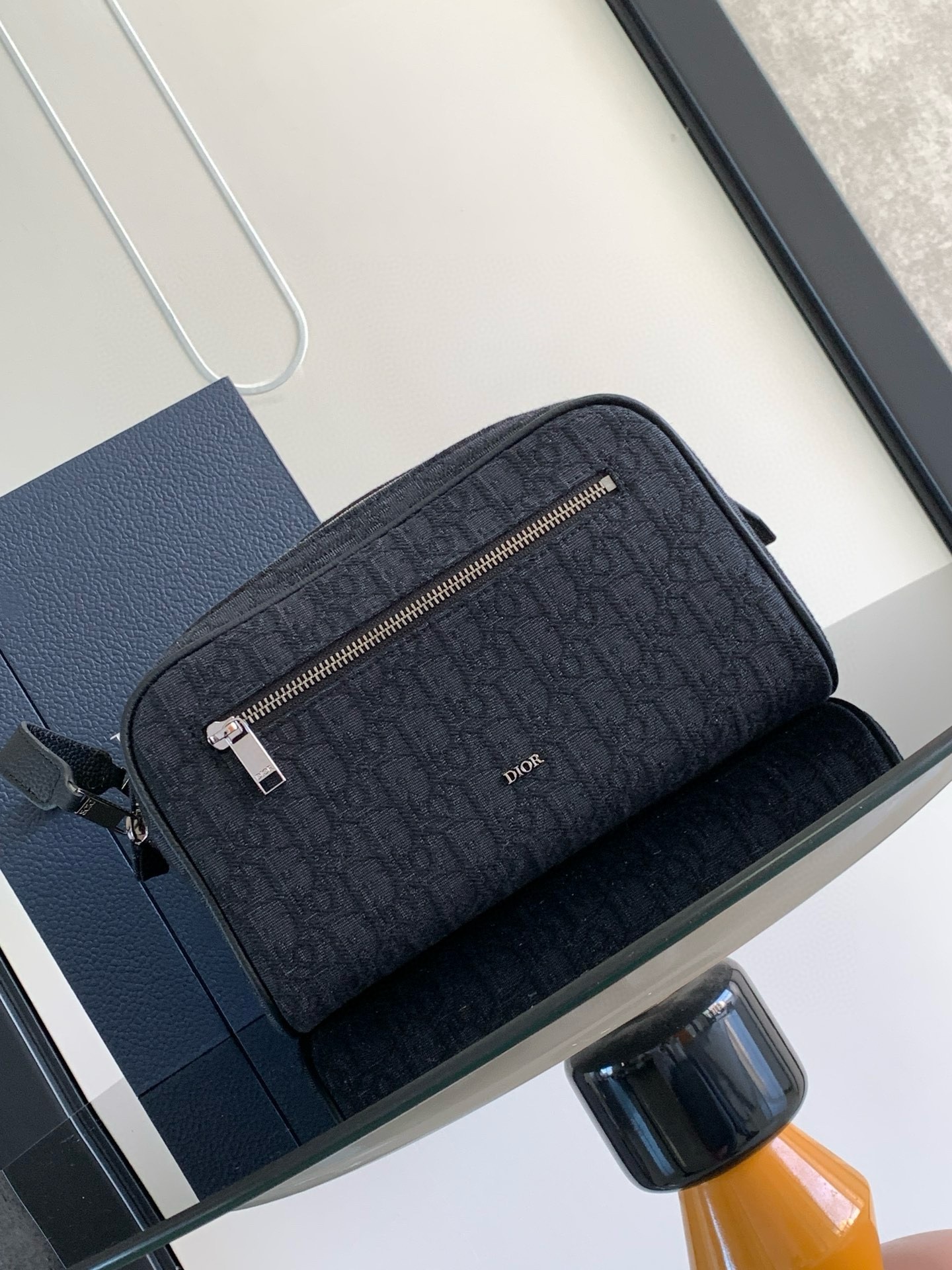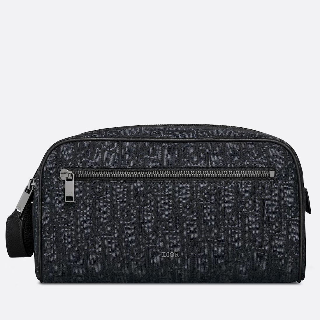 The toiletry bag is a functional accessory with a streamlined silhouette. Crafted in black Dior Oblique jacquard, it is embellished with tonal grained calfskin trim and a Dior signature on the front. The style features a zip pocket on the front as well as a spacious zip compartment with two slip pockets. Equipped with a leather handle, the toiletry bag can be carried by hand or tucked into any bag.