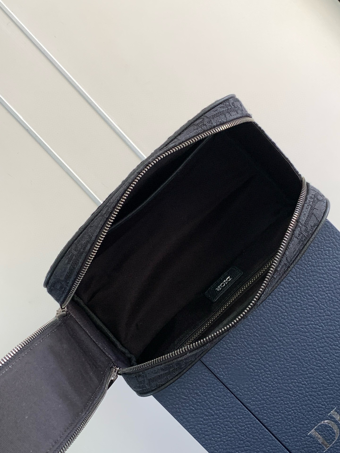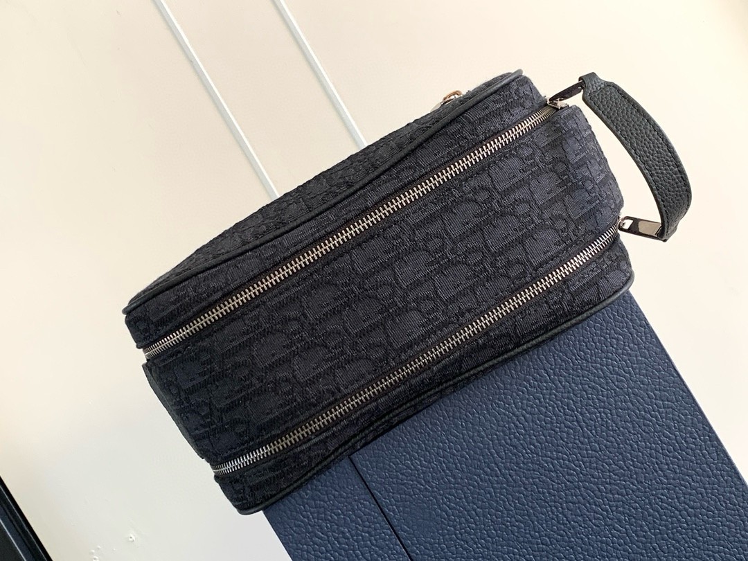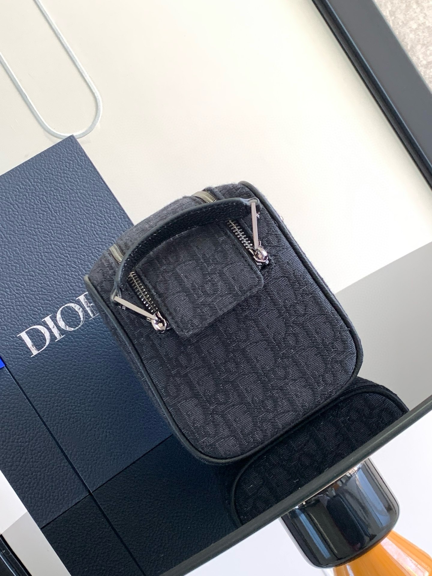 The toiletry bag is a functional accessory with a streamlined silhouette. Crafted in black Dior Oblique jacquard, it is embellished with tonal grained calfskin trim and a Dior signature on the front. The style features a zip pocket on the front as well as a spacious zip compartment with two slip pockets. Equipped with a leather handle, the toiletry bag can be carried by hand or tucked into any bag.