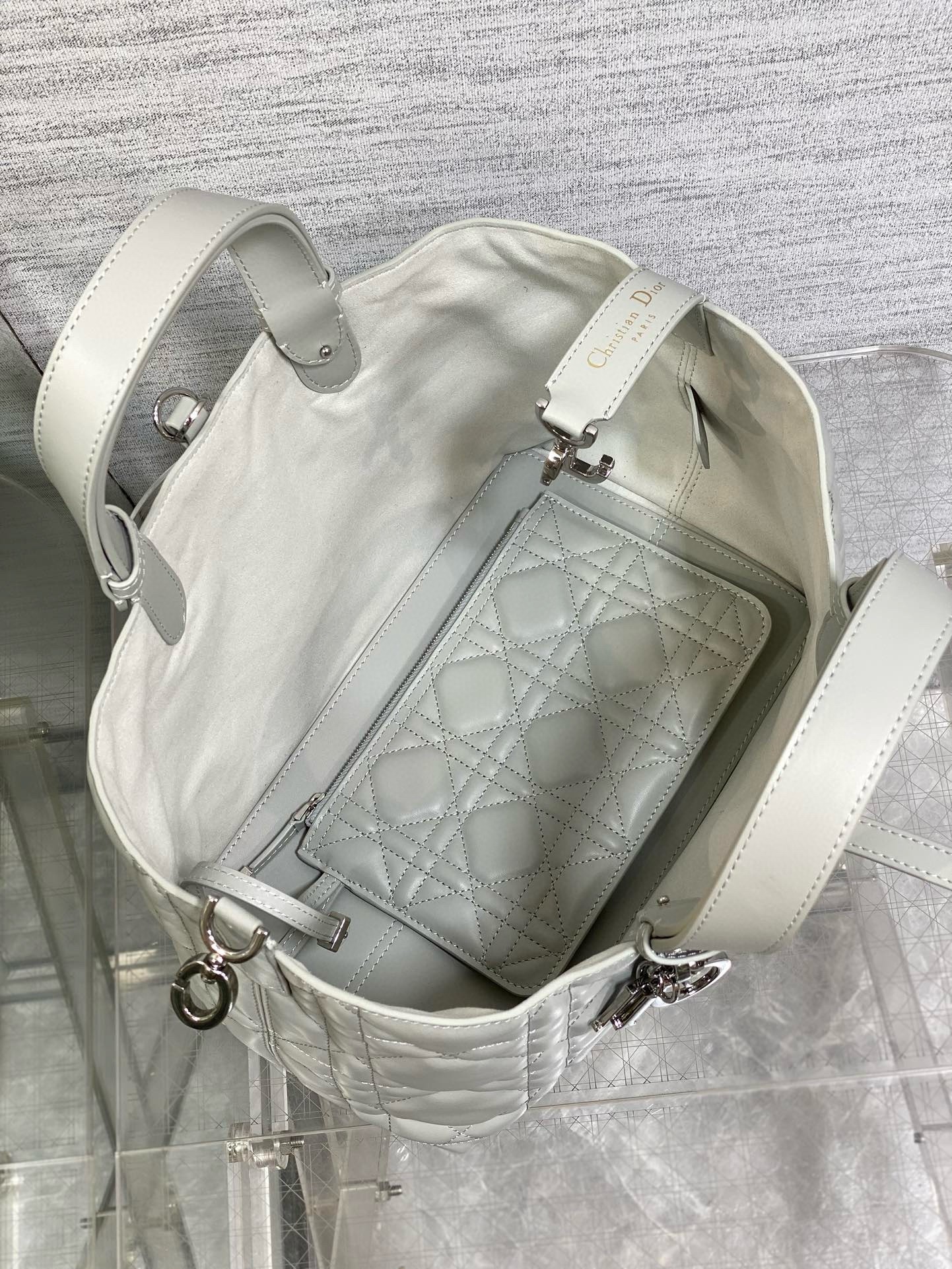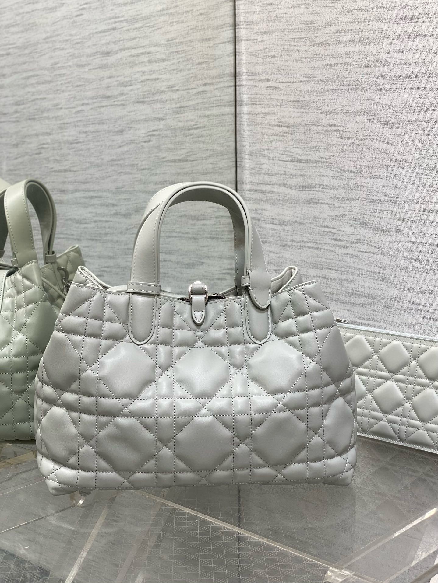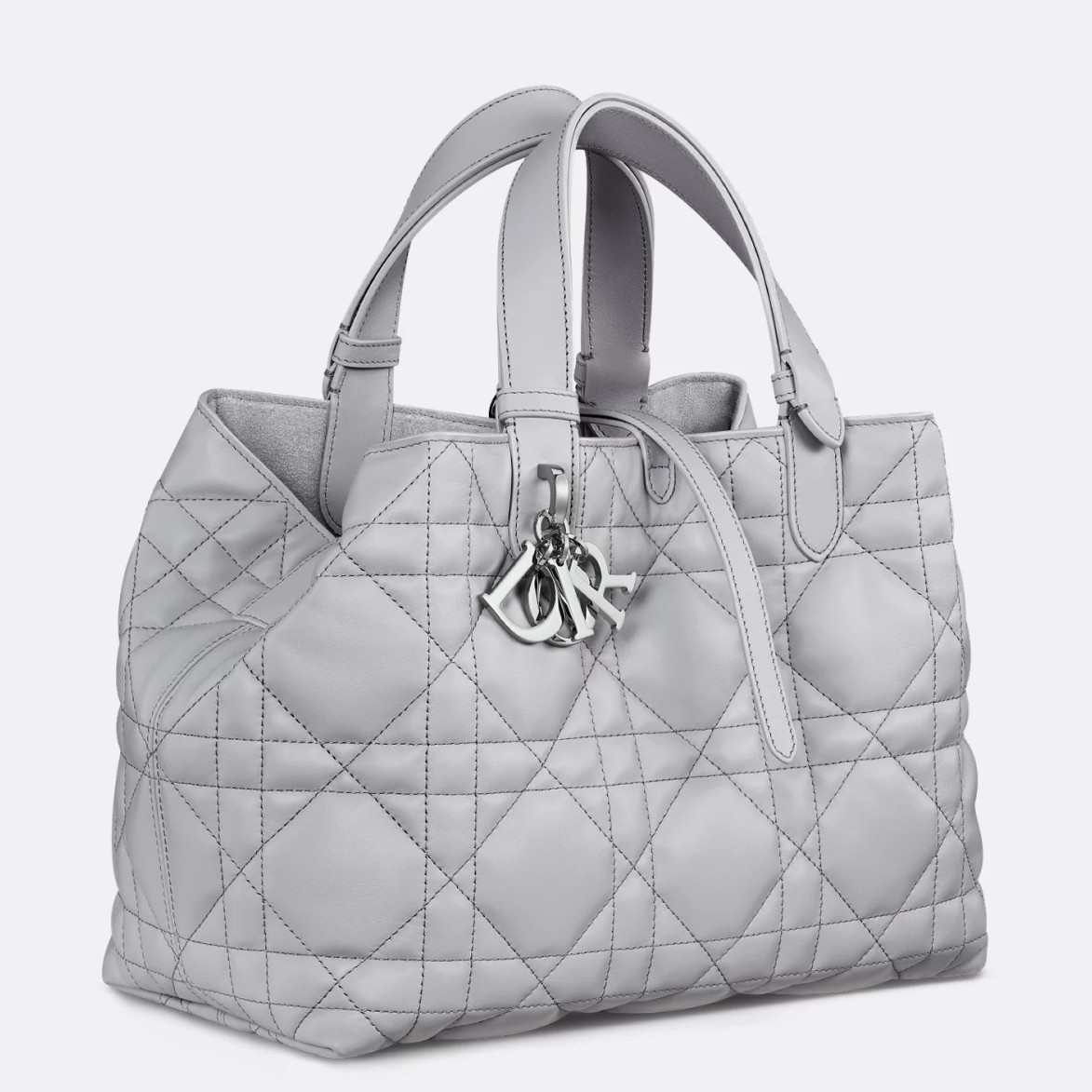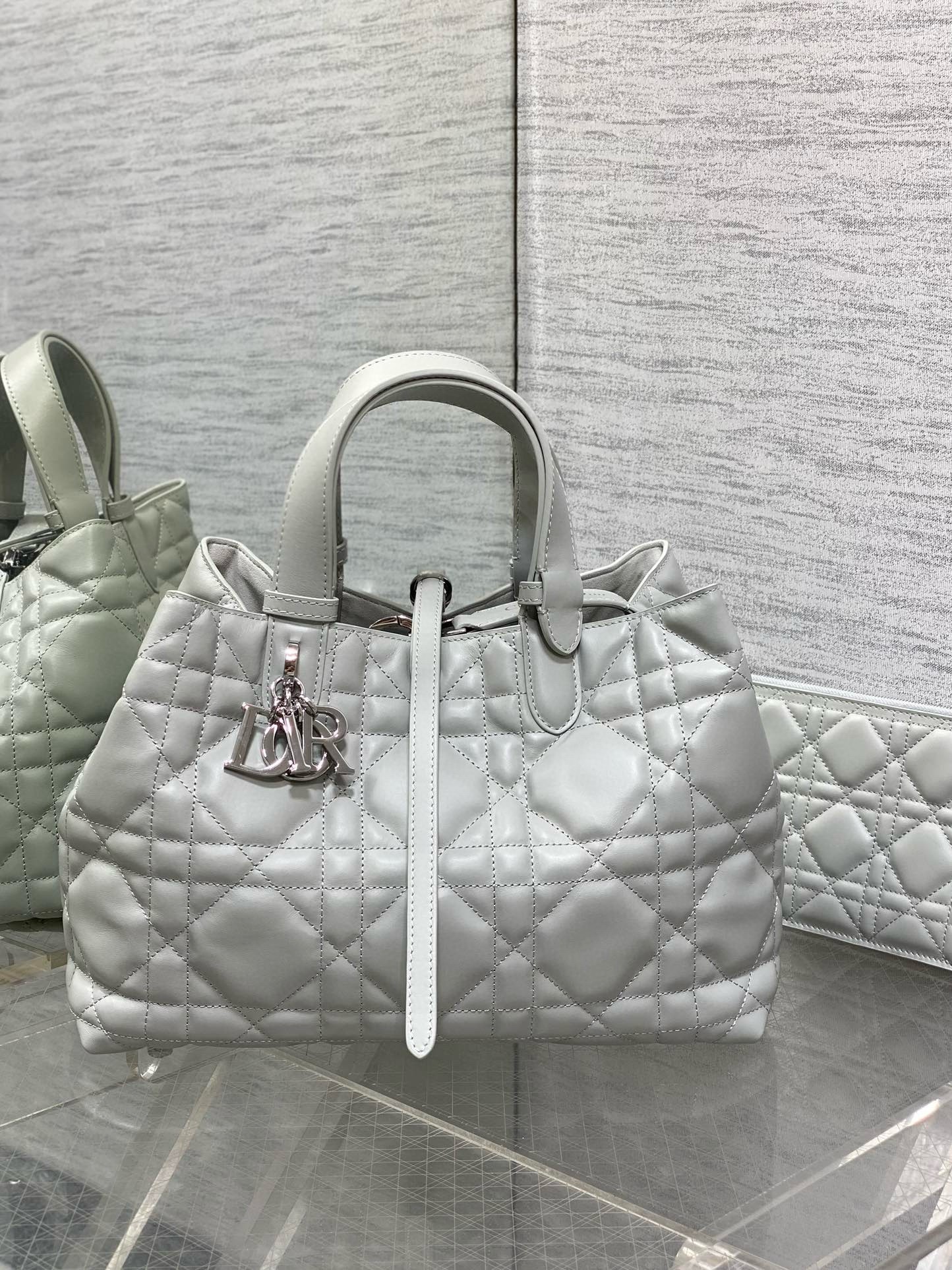 The Dior Toujours bag is distinguished by a casual and practical design. Crafted in calfskin with Macrocannage topstitching, it showcases a spacious interior compartment with a matching pouch to organize the essentials. Its thin leather strap closure keeps items secure while the D of the CD Lock clasp twists to adjust the sides and enhance the bag's silhouette. The leather handles can be adjusted using the small notches so the medium bag can be carried by hand or worn over the shoulder.