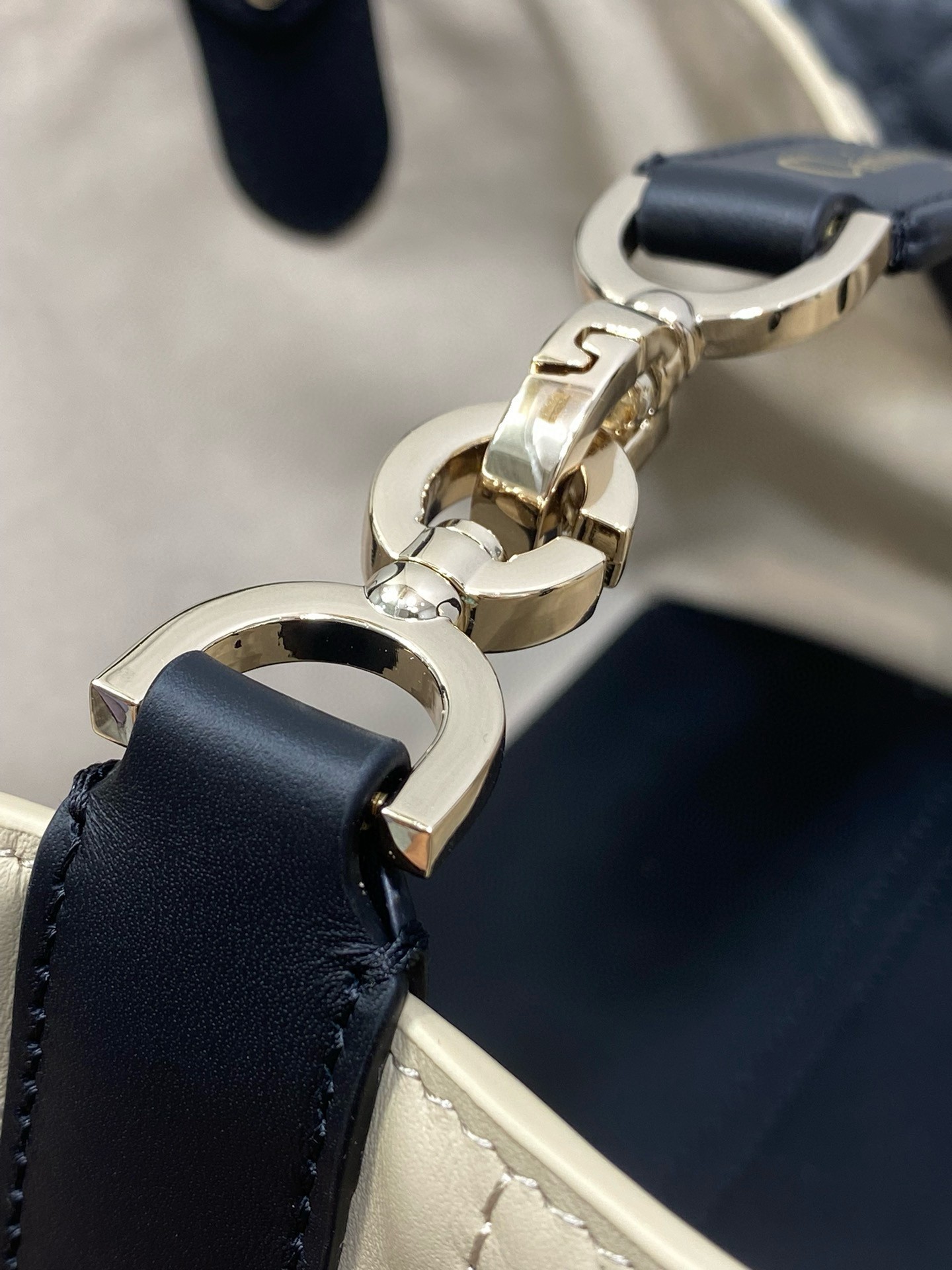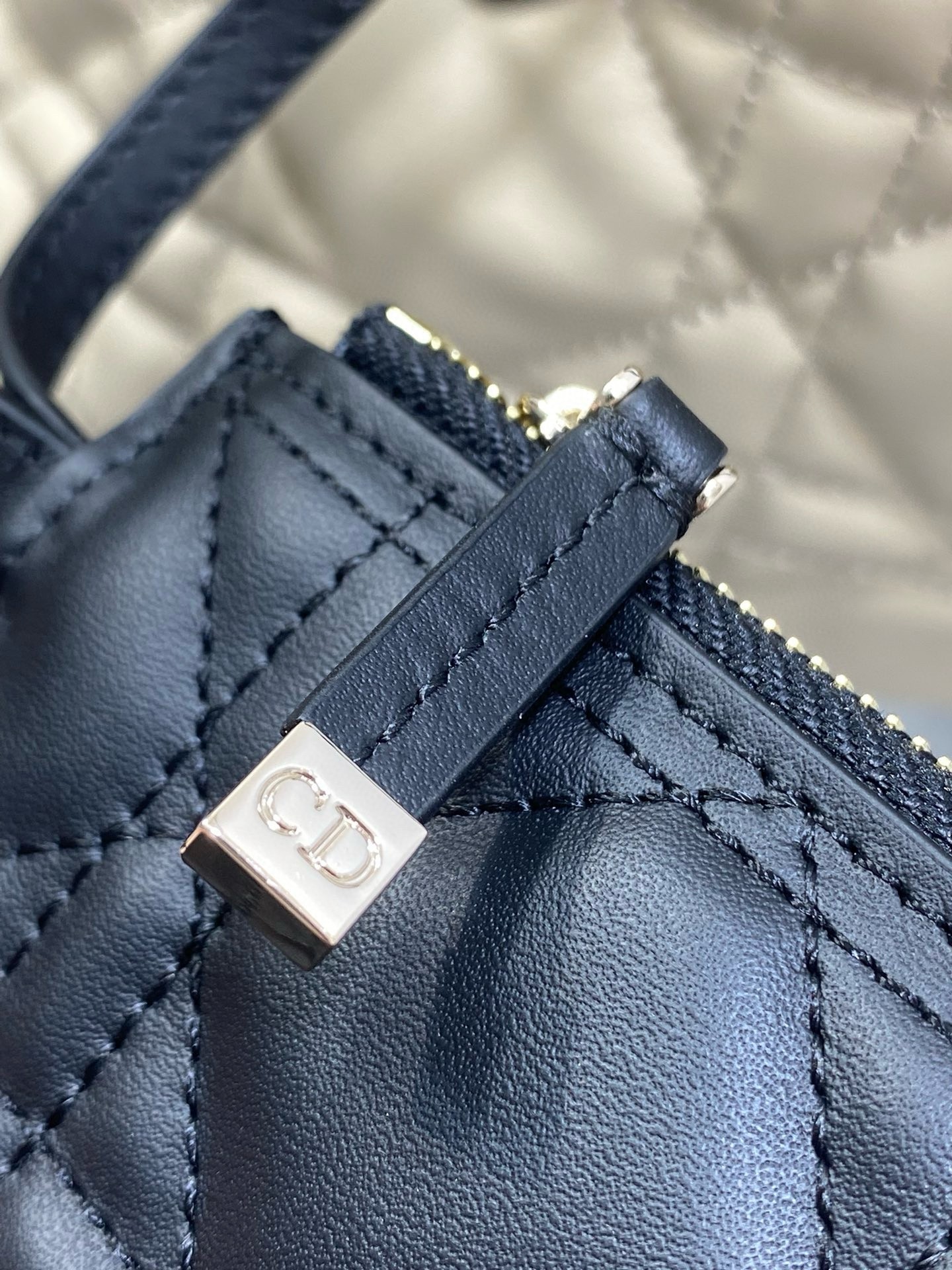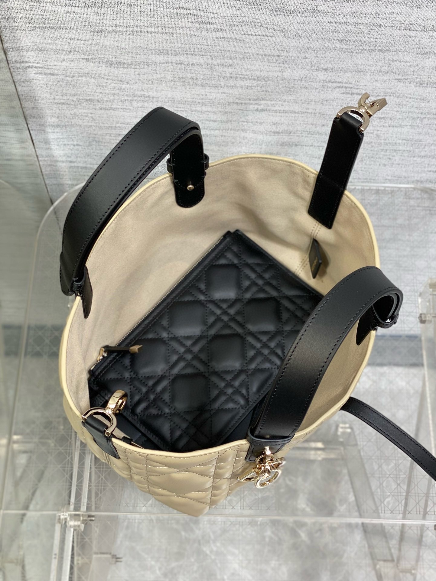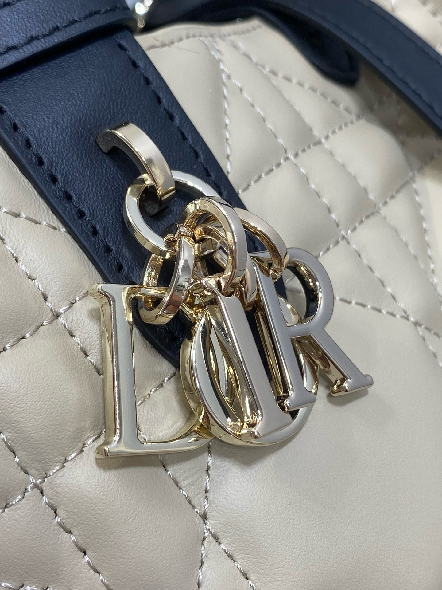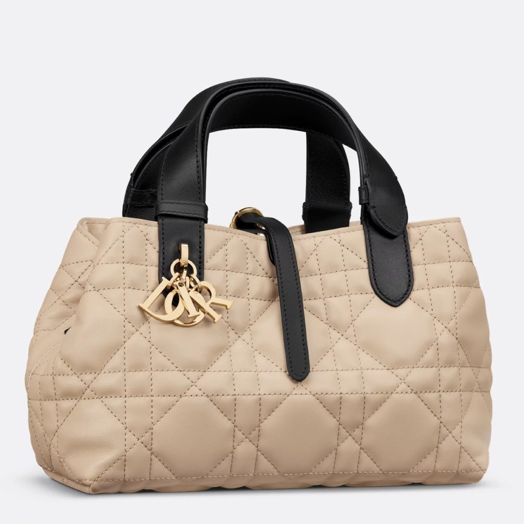 The Dior Toujours bag is distinguished by a casual and practical design. Crafted in rope beige calfskin with Macrocannage topstitching and black calfskin detailing, it showcases a spacious interior compartment with a matching pouch to organize the essentials. Its thin leather strap closure keeps items secure while the D of the CD Lock clasp twists to adjust the sides and enhance the bag's silhouette. Equipped with leather top handles that can be adjusted using the small notches, the small bag can be effortlessly carried by hand.