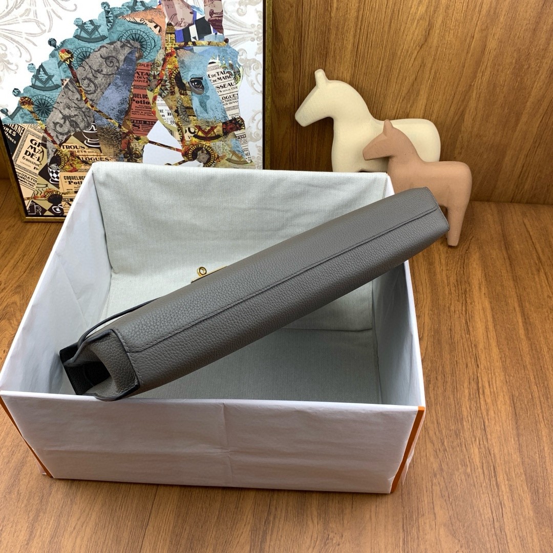 With its new clean lines, the Kelly DĂ©pĂȘches document holder combines Kelly's iconic clasp with beveled corners and the construction codes of the Hermes menswear universe. With its rounded bottom and the purity of its Taurillon Clemence leather surface, it asserts itself as a day-to-day essential to slide your laptop and documents in. A lightweight pouch and removable strap provides a more casual fit and completes the line with elegance.