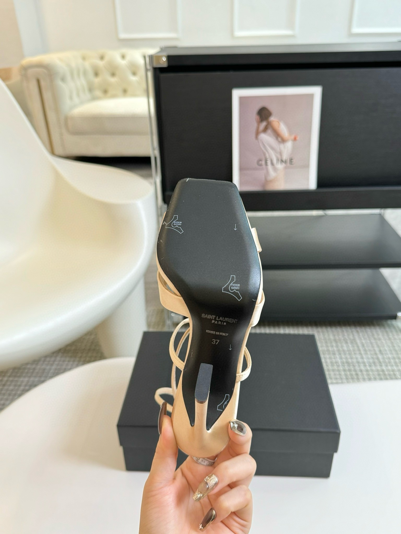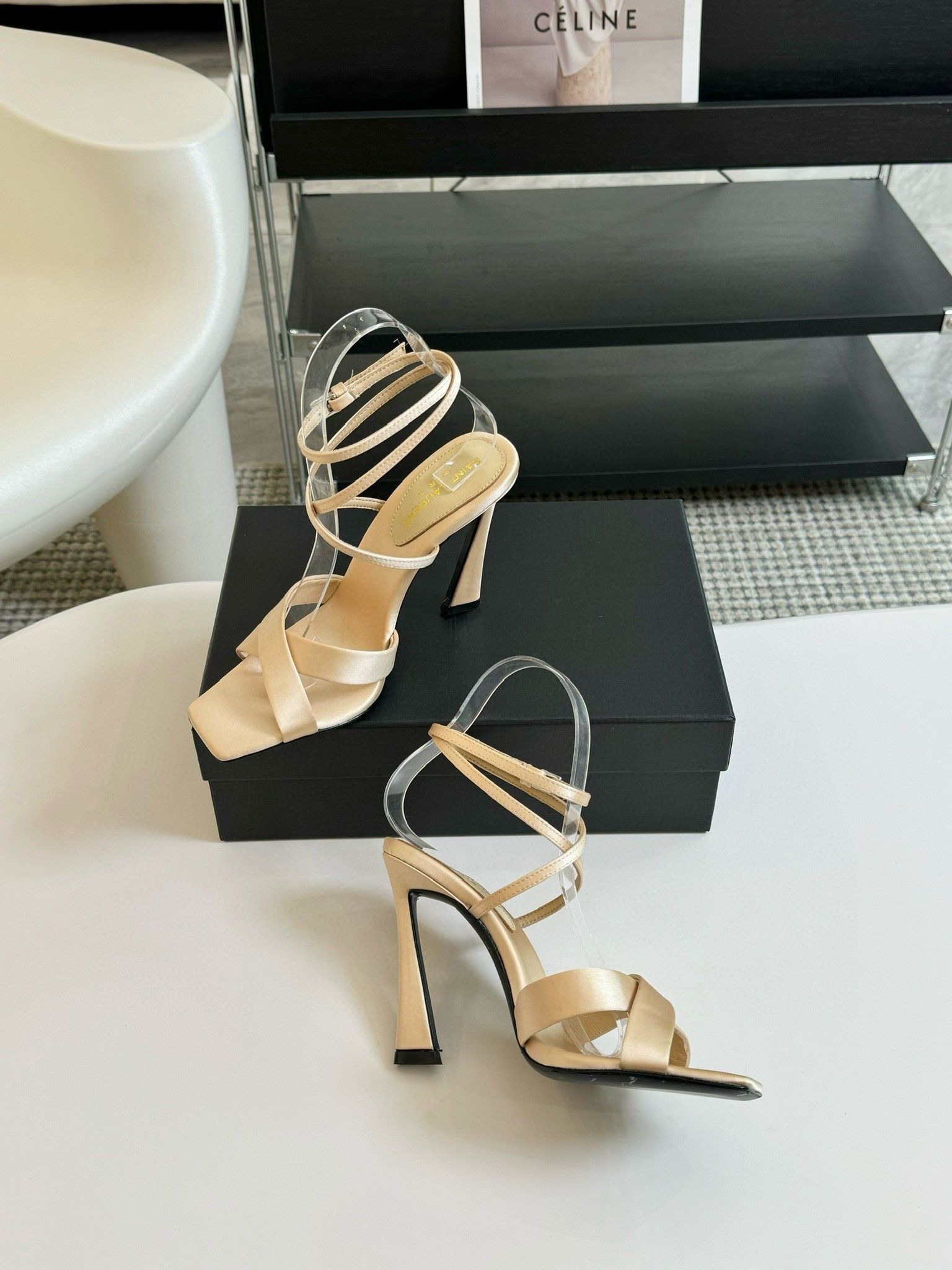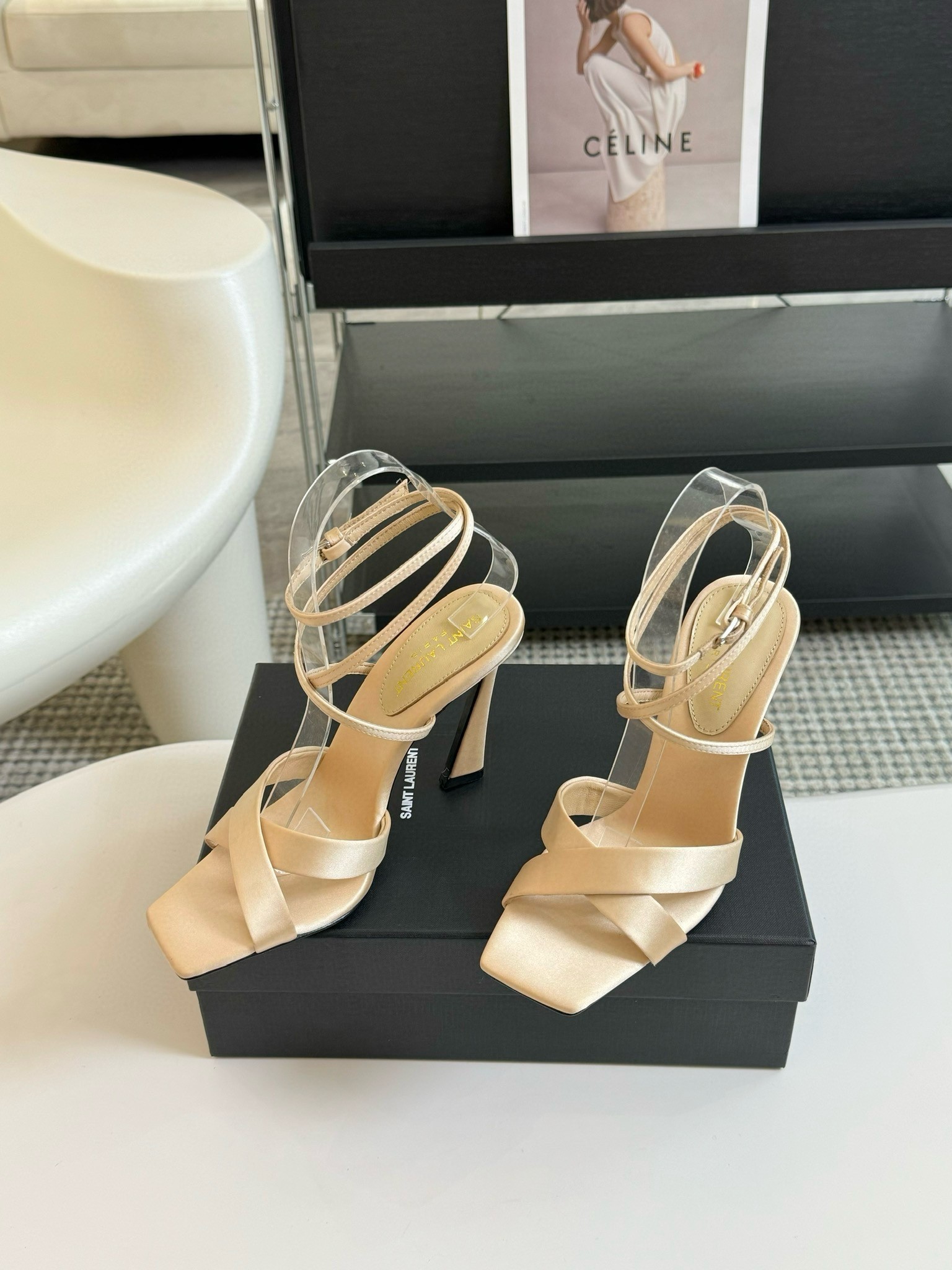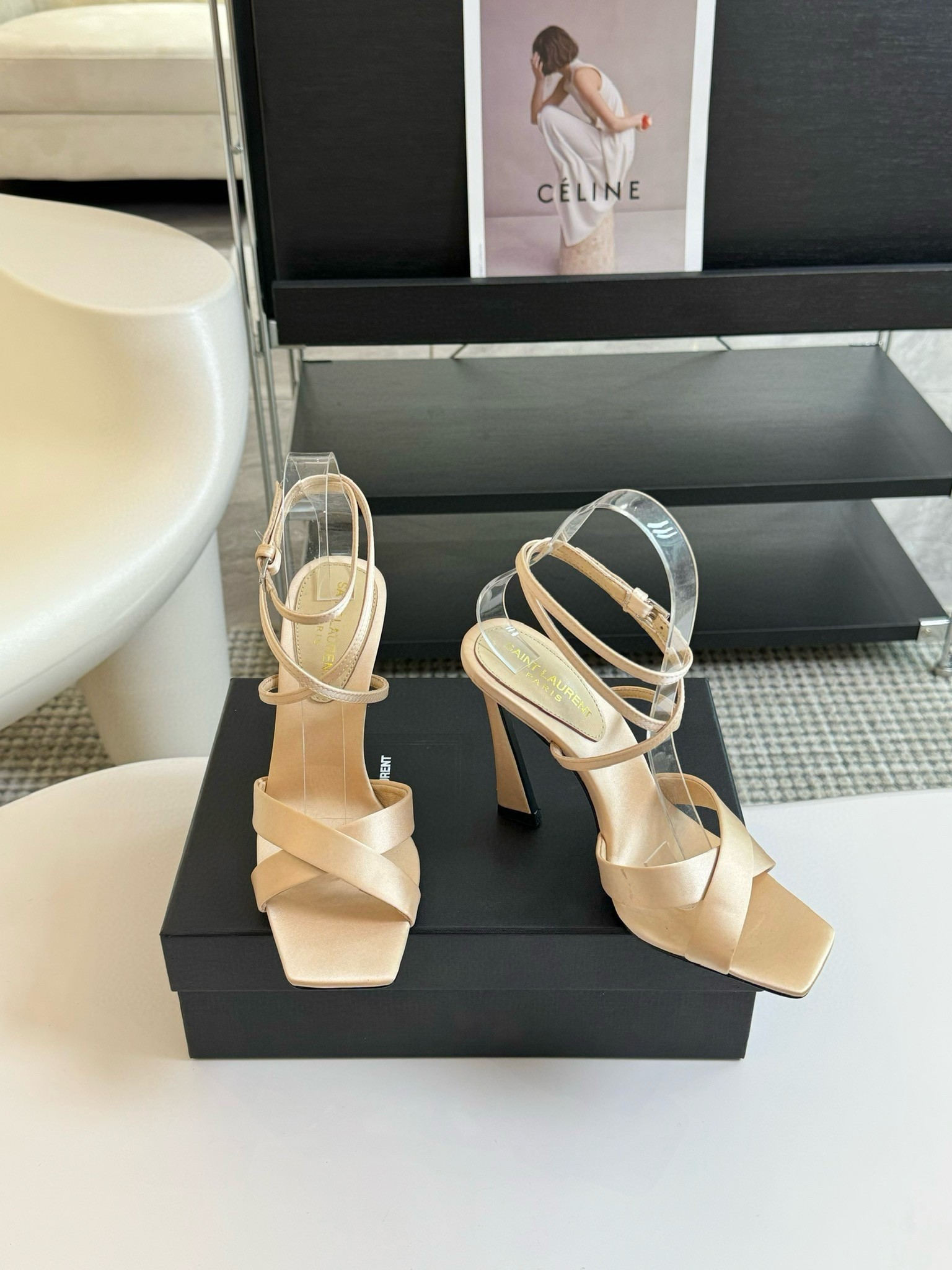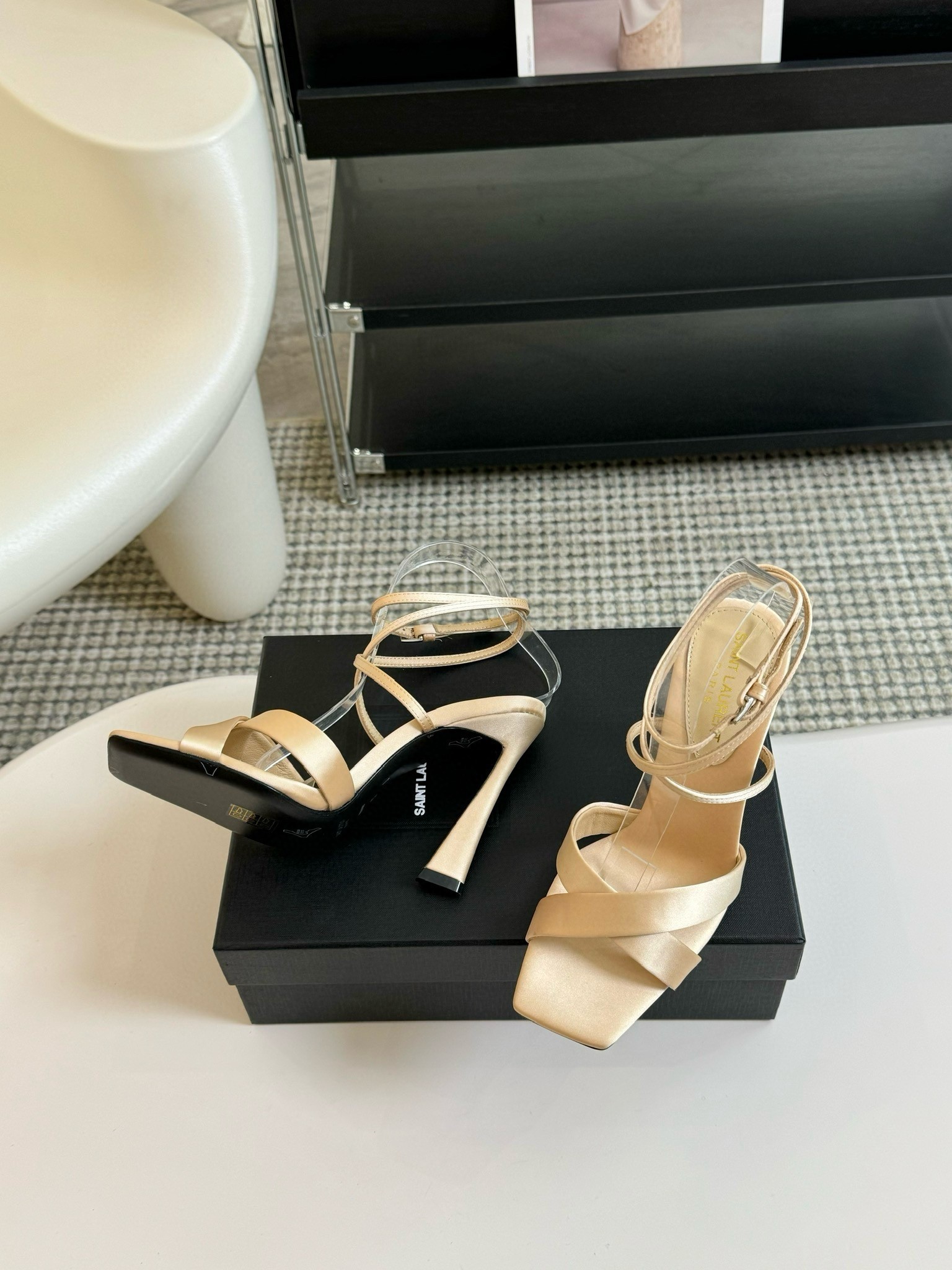 Saint Laurent's Corinne sandals are a chic step up from your everyday flats. They're crafted from satin with wrap-around ankle strap and rest on 110 mm L-shaped heel. The crossover straps will lend a nostalgic sensibility to modern midi dresses.