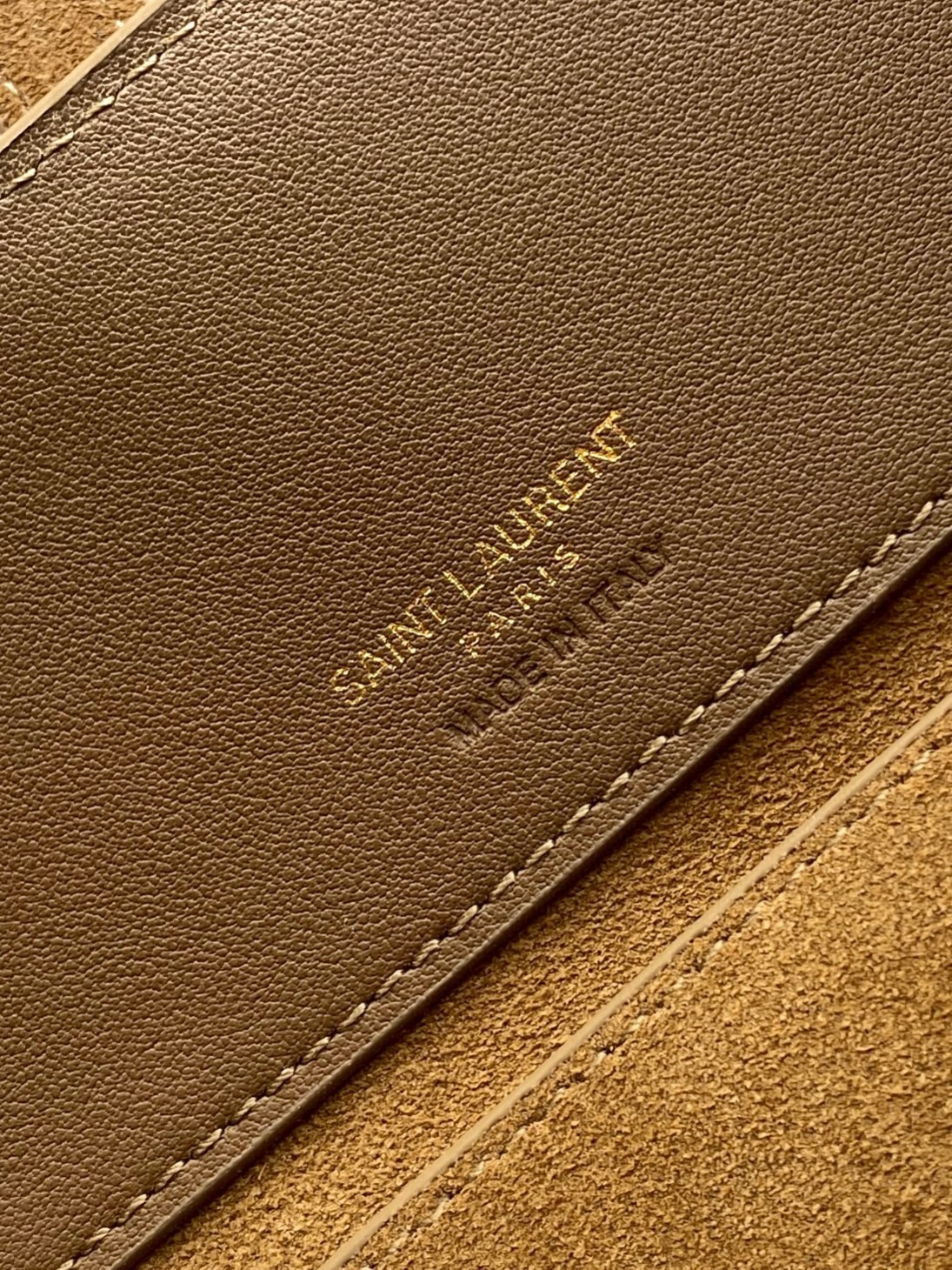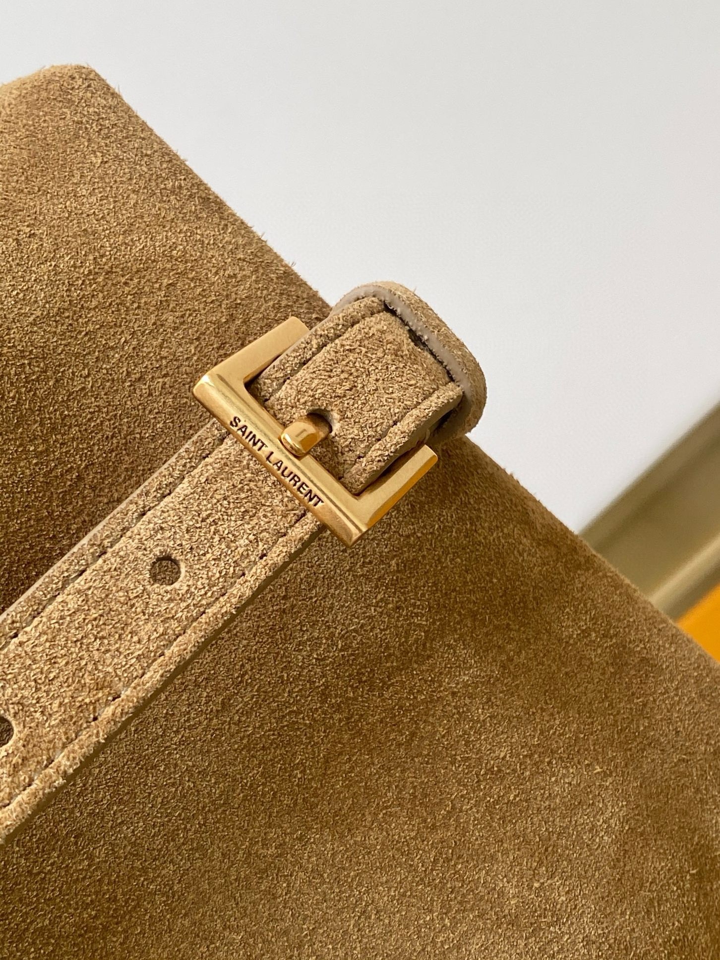 Saint Laurent's iconic 'YSL' hardware can even double as a clasp. A feature on this small Le 37 bucket bag, the brushed gold-tone metal stands out beautifully against the soft suede, while the coordinating feet deter wear and tear. Stash your phone, keys and cardholder inside, using the detachable strap to sling it over your shoulder.