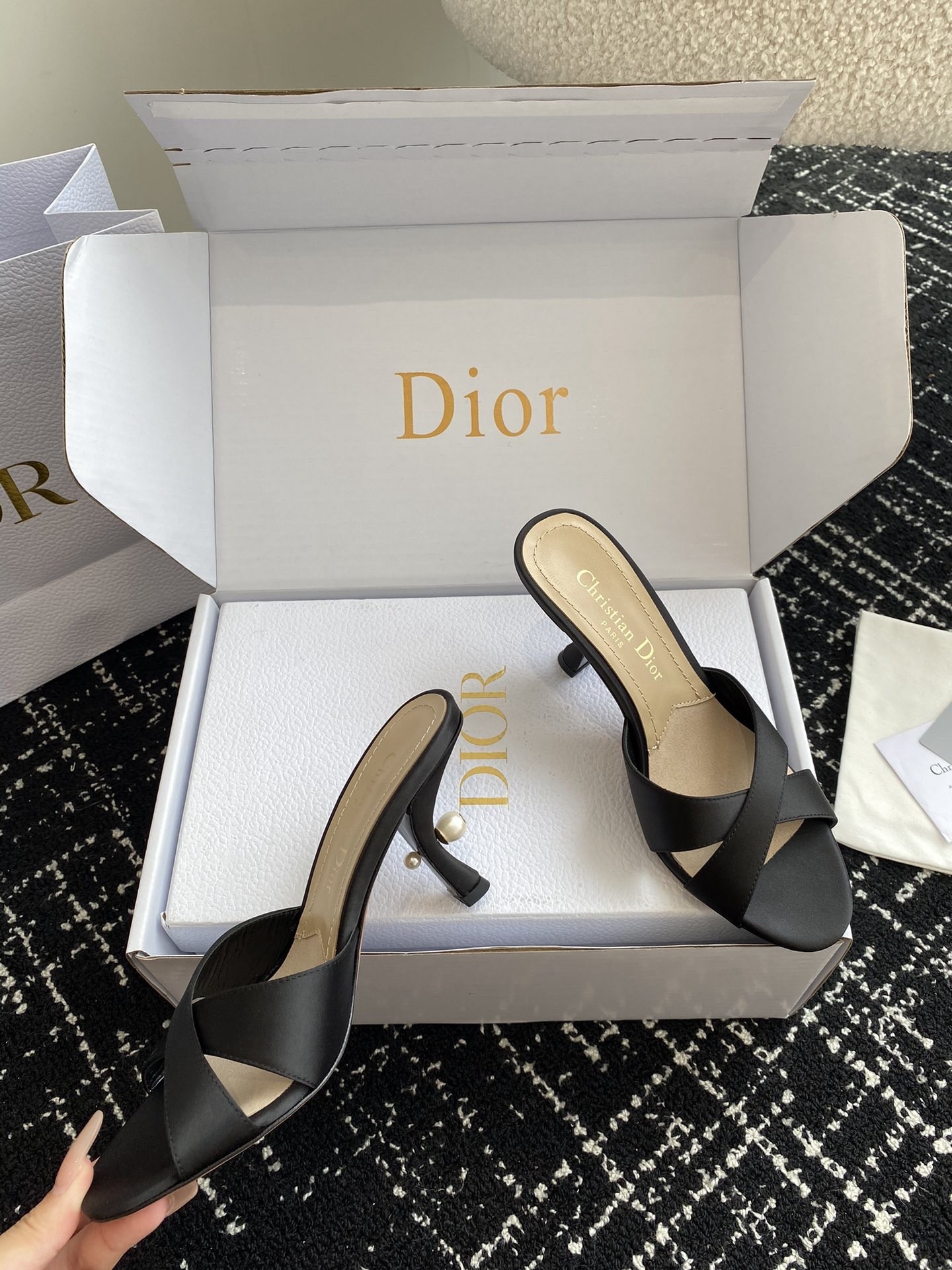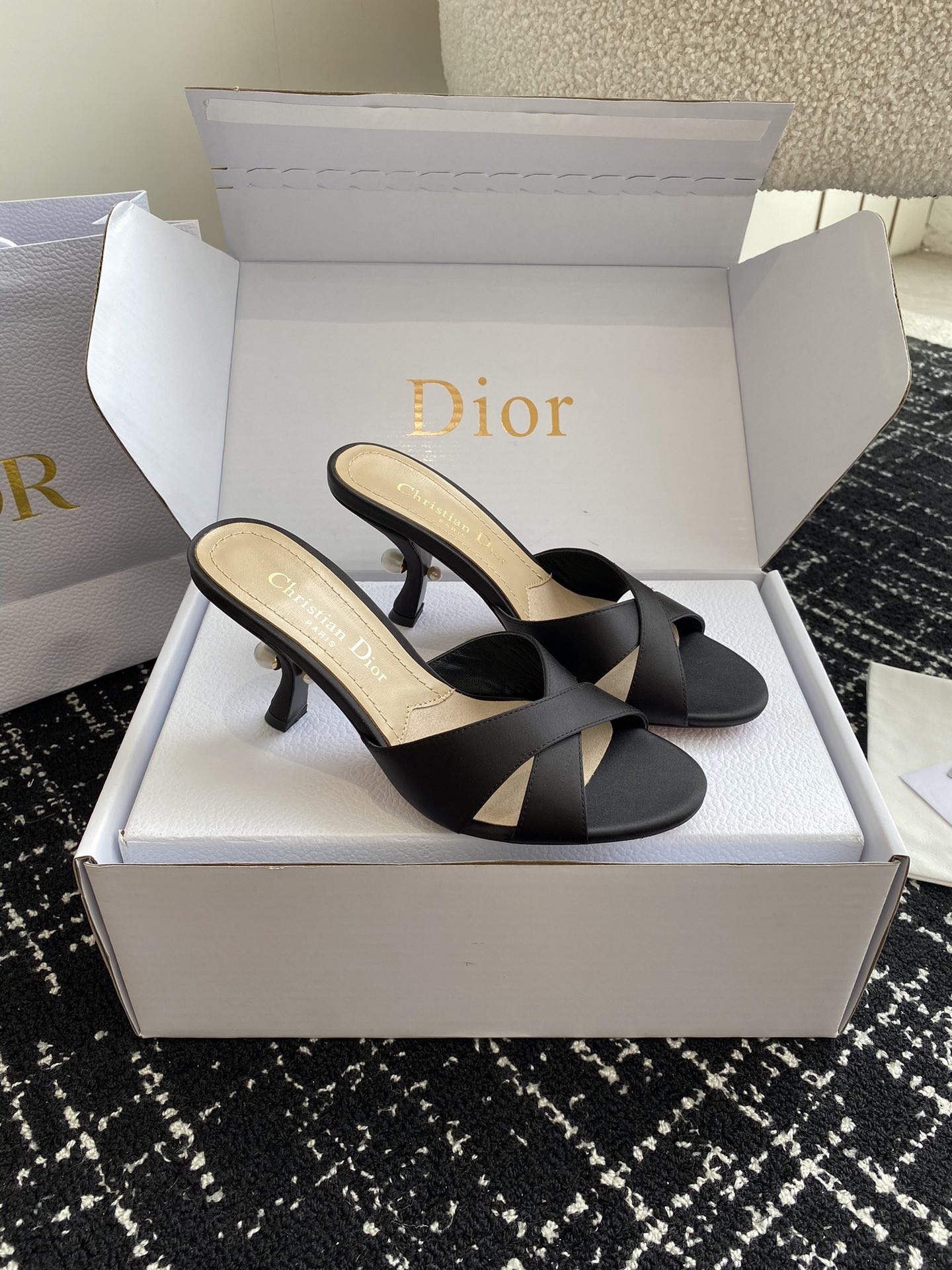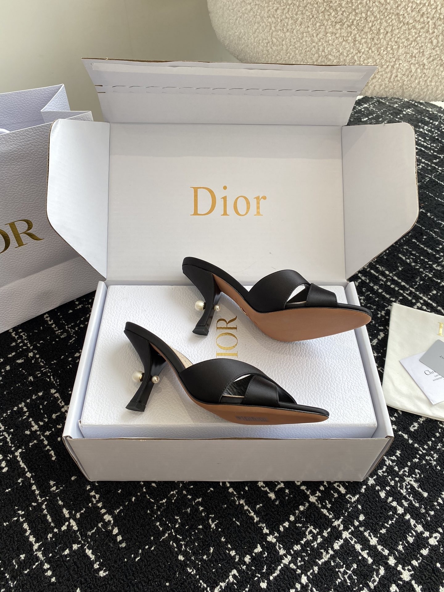 New for Fall 2024, the Dior Tribales heeled slide displays couture appeal. The satin upper is accented by an 8 cm comma heel embellished with white resin pearls. The rear pearl features a gold-tone CD signature inspired by the namesake earrings. The sophisticated slide has a round toe and can be paired easily with any evening wear.