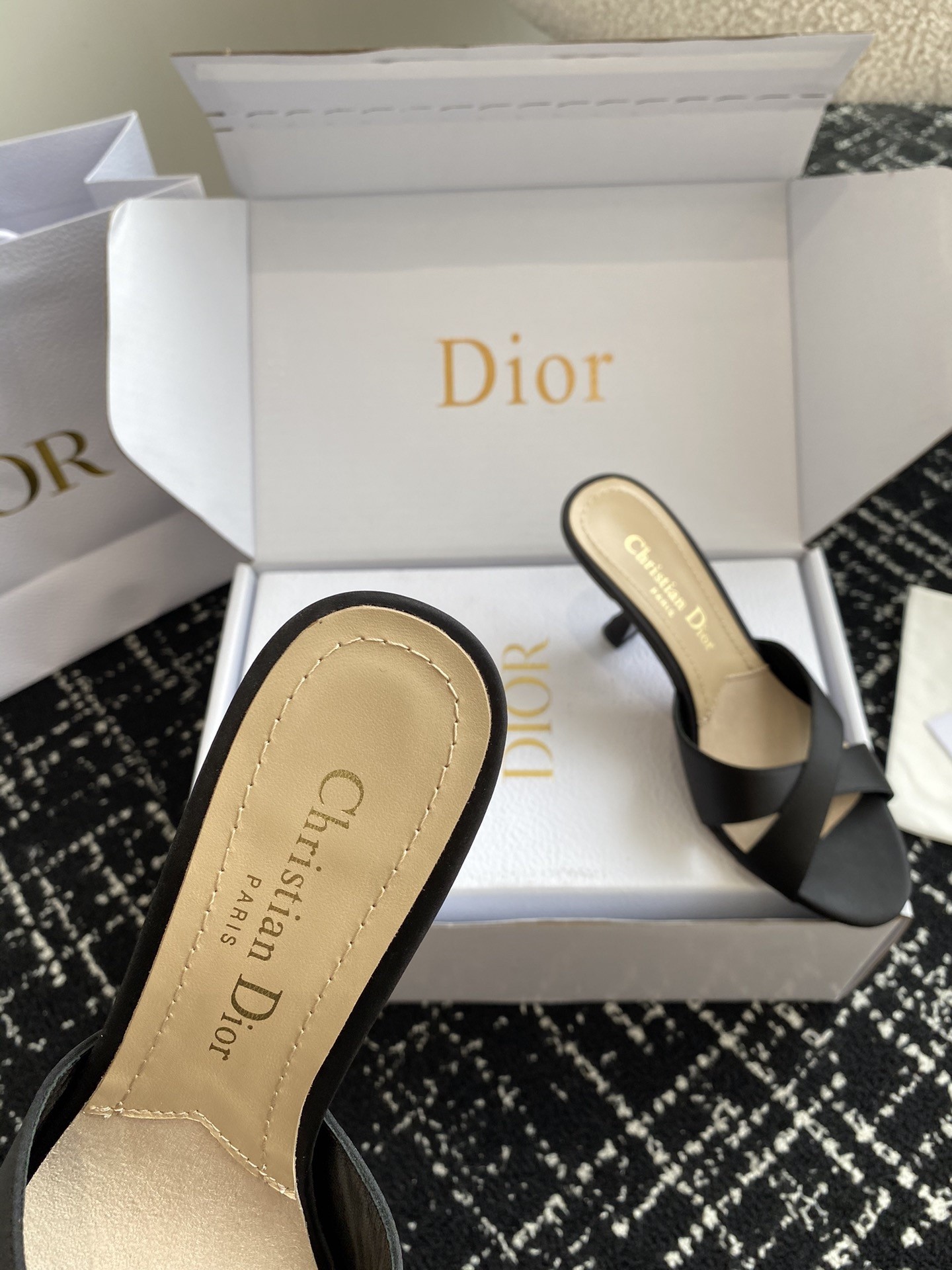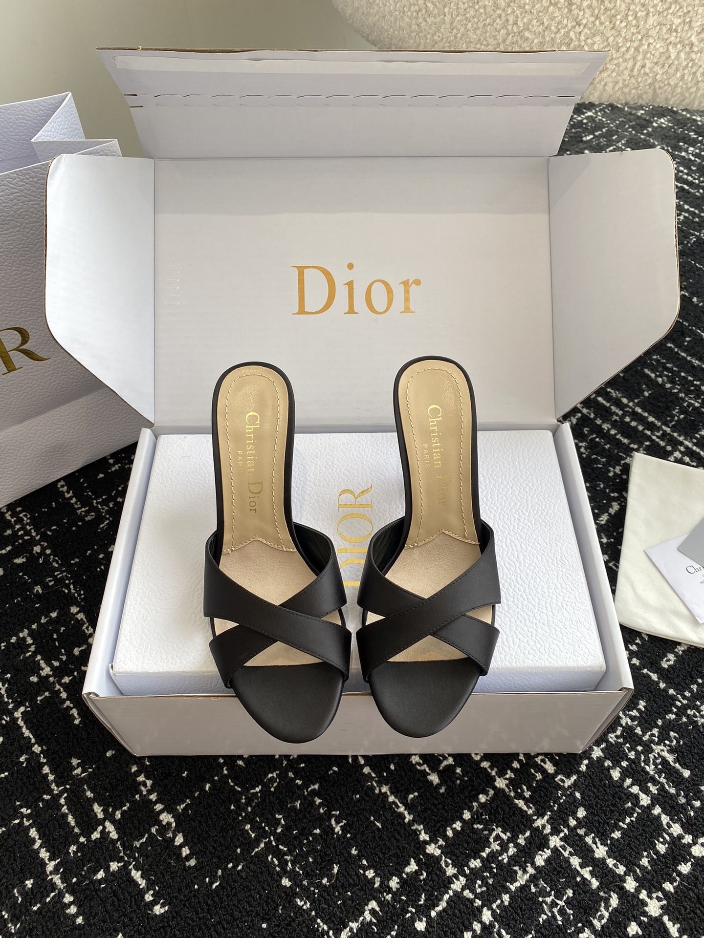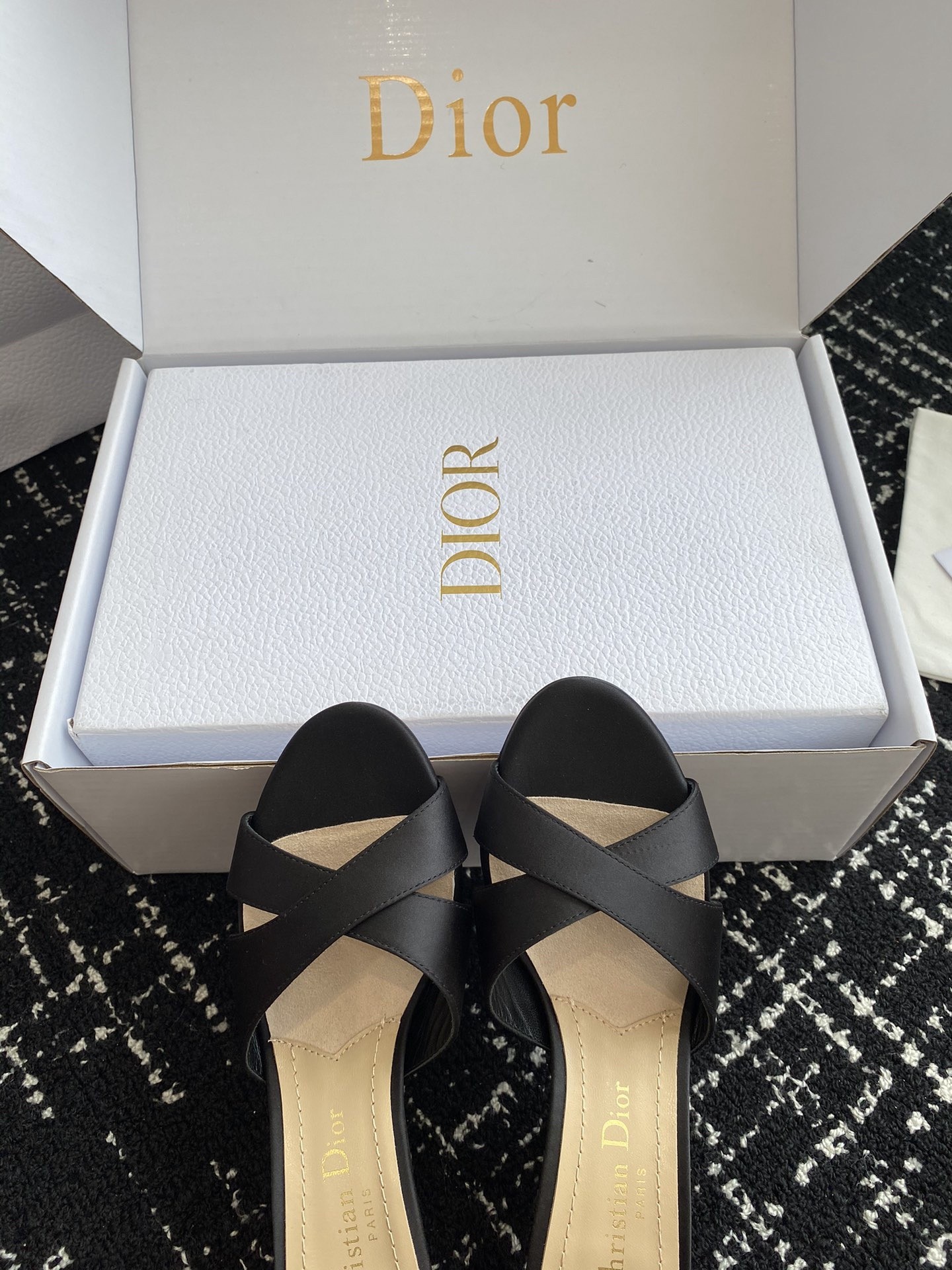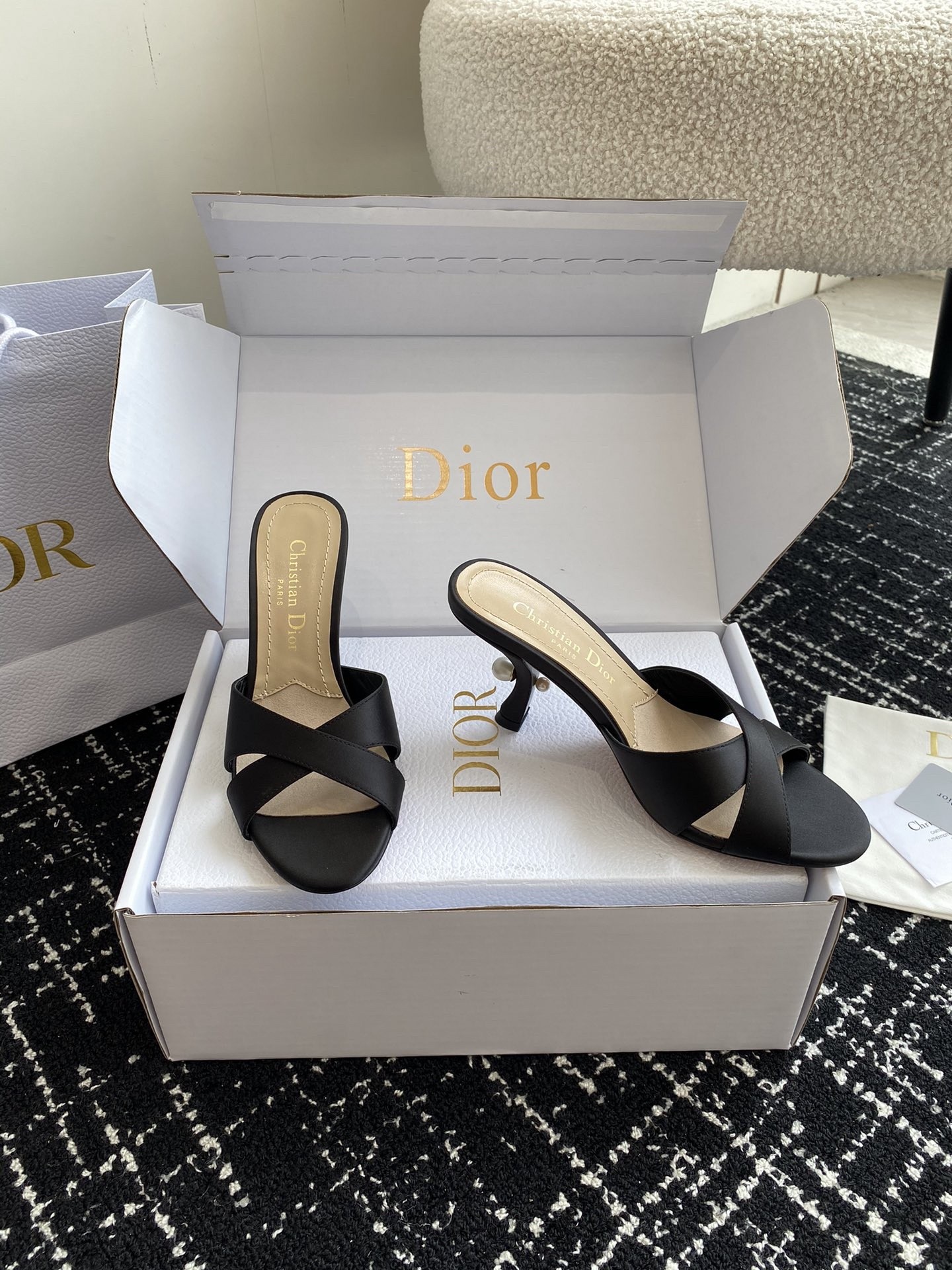 New for Fall 2024, the Dior Tribales heeled slide displays couture appeal. The satin upper is accented by an 8 cm comma heel embellished with white resin pearls. The rear pearl features a gold-tone CD signature inspired by the namesake earrings. The sophisticated slide has a round toe and can be paired easily with any evening wear.