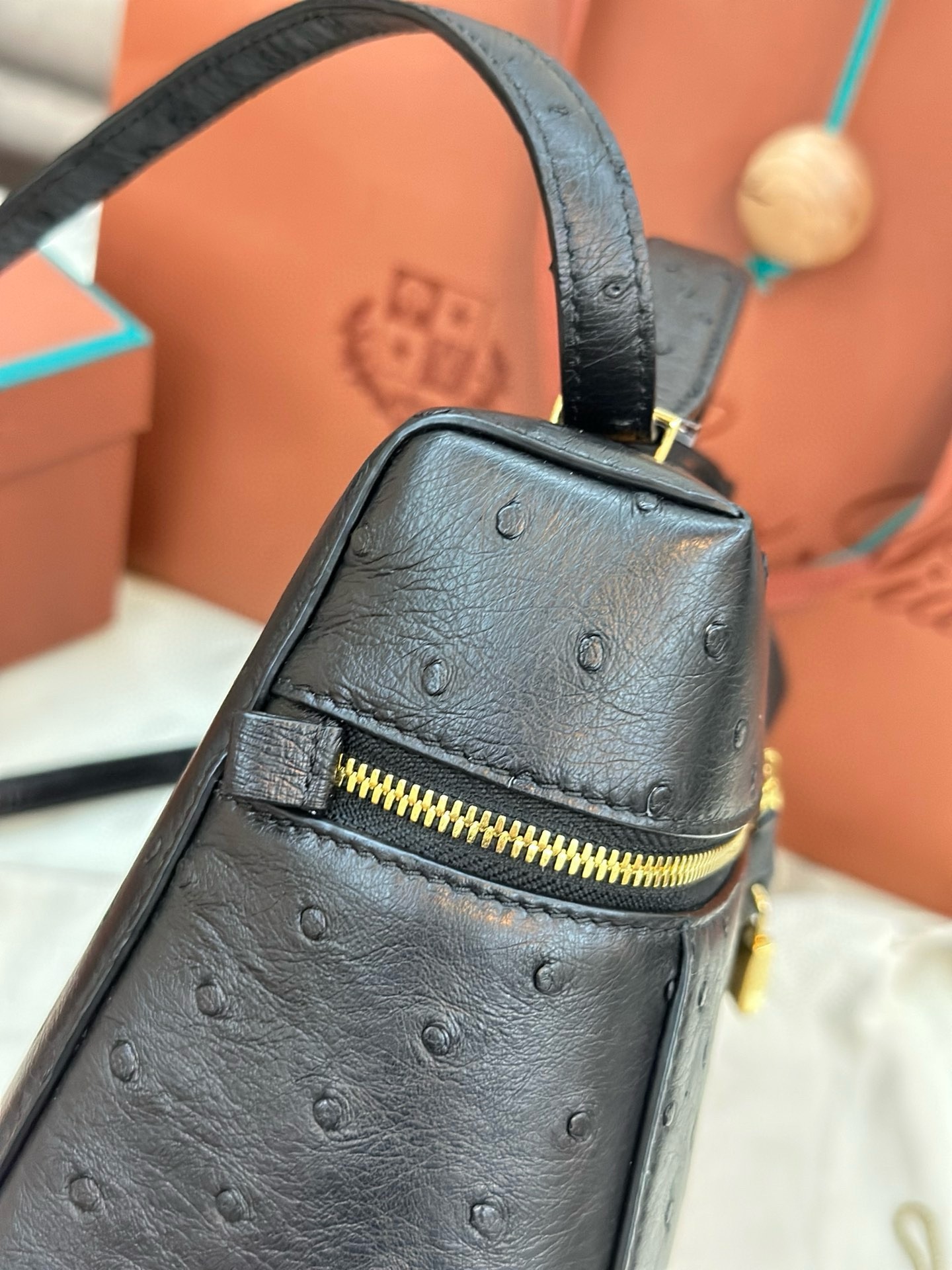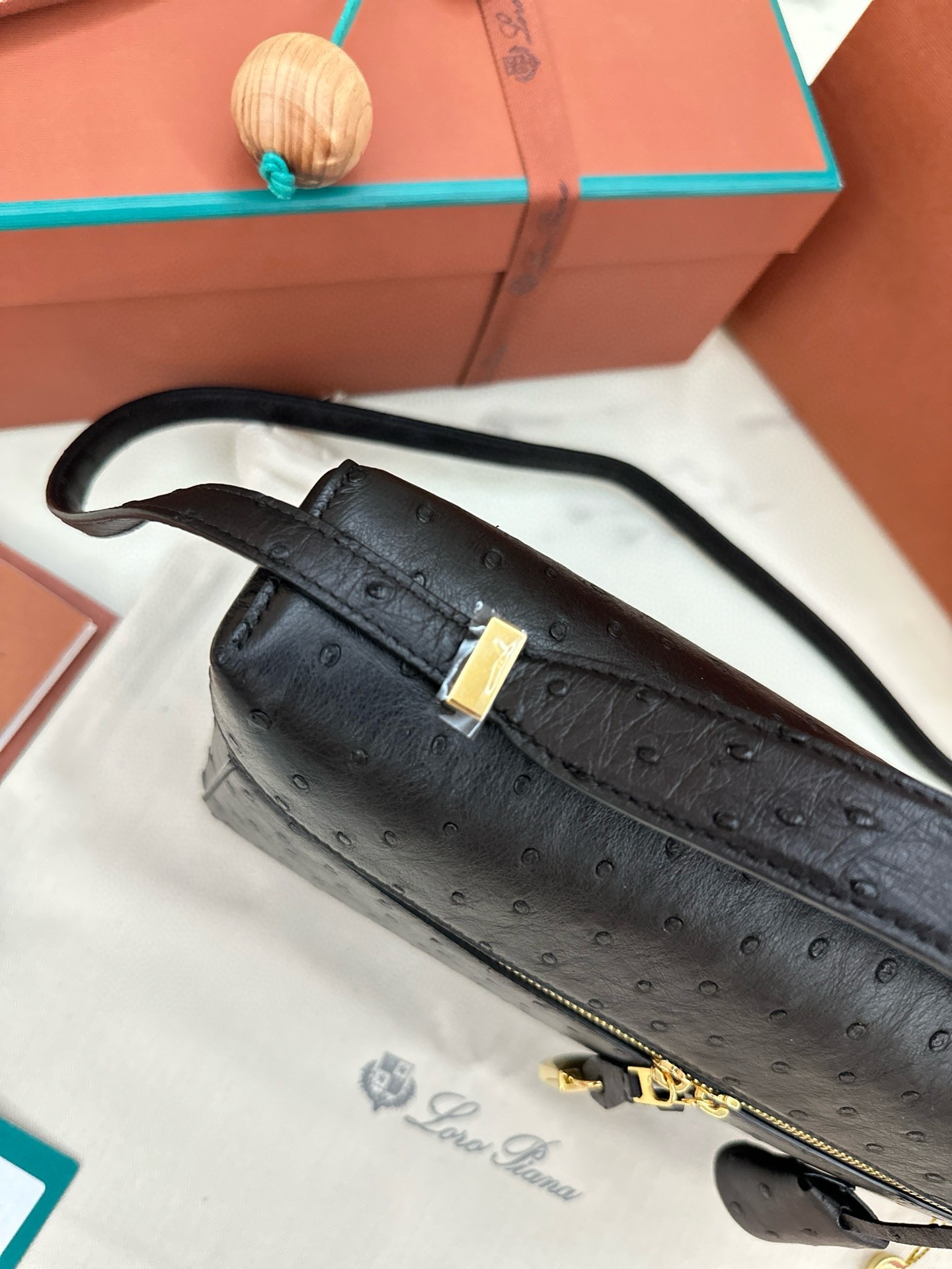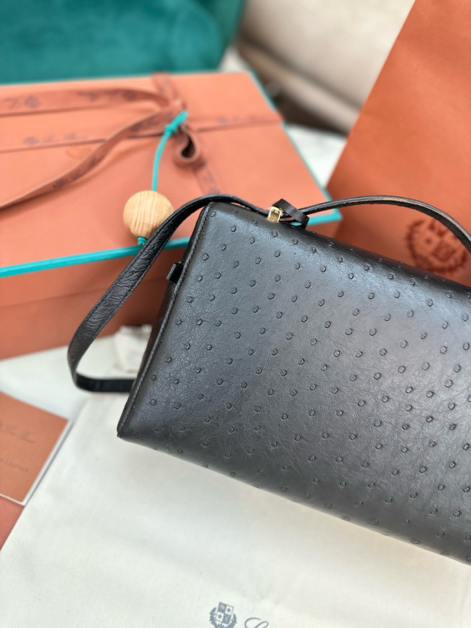 A sophisticated iteration of the Extra Pocket, crafted in ostrich embossed leather, this special treatment not only enhances its beauty but also makes it irresistibly soft to the touch. With a more modern and fresh look, it features the new, redesigned Loro Piana charms - now three-dimensional, removable, exquisite and feminine. The versatile two-way strap allows the bag to be carried over the shoulder, across the body or elegantly in the hand.