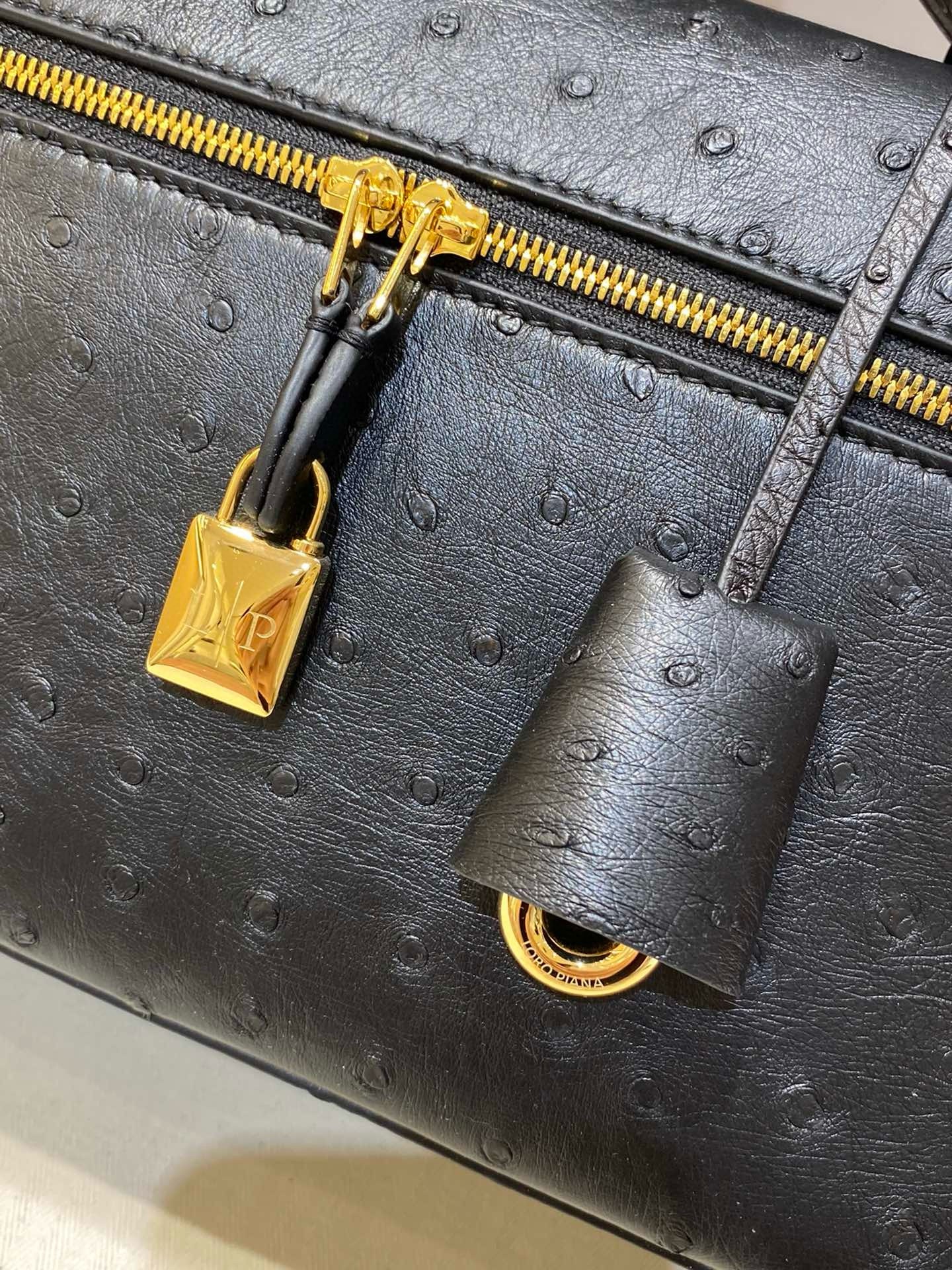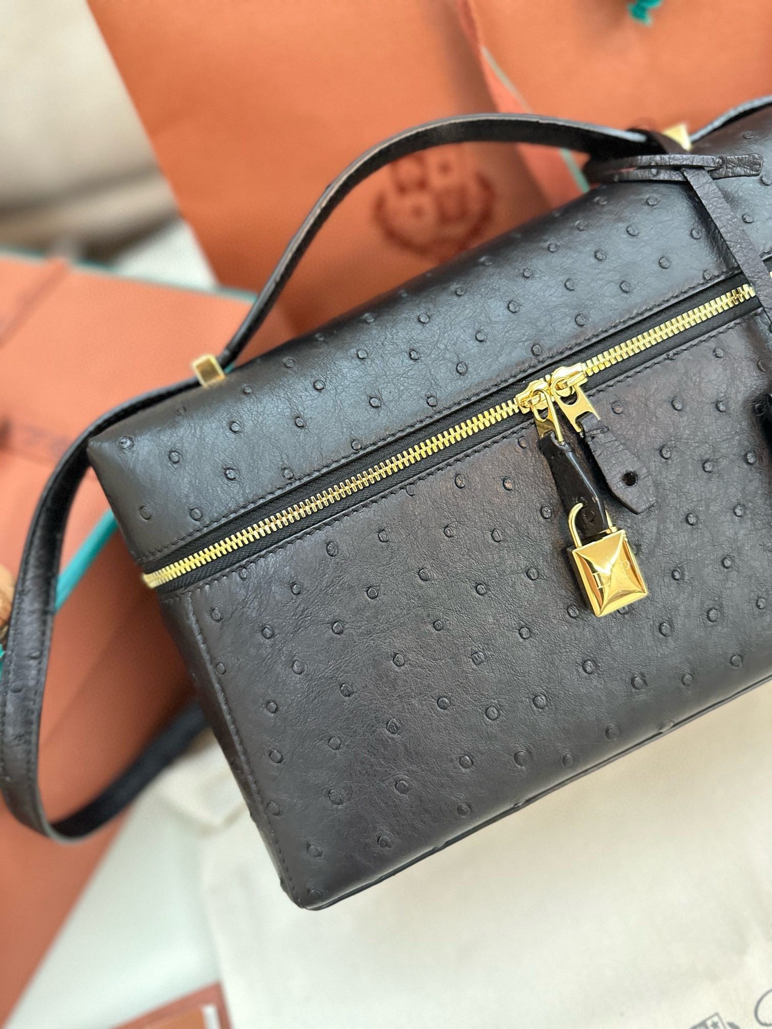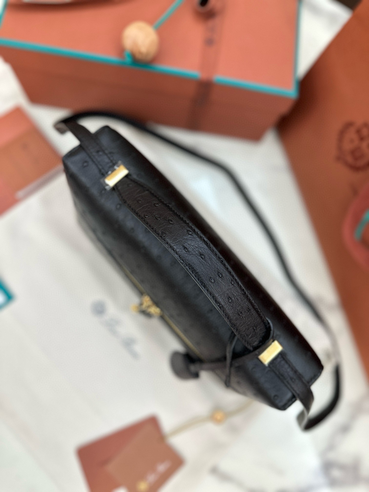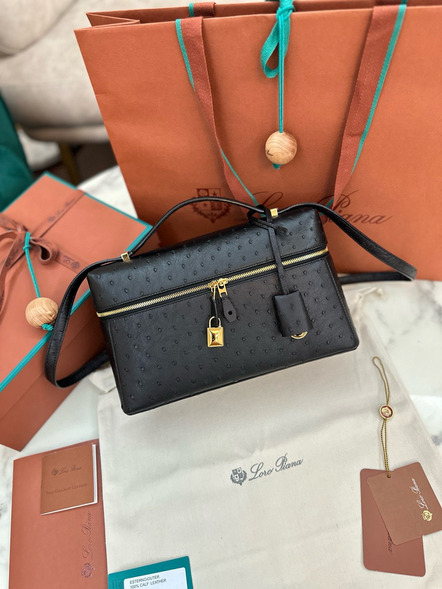 A sophisticated iteration of the Extra Pocket, crafted in ostrich embossed leather, this special treatment not only enhances its beauty but also makes it irresistibly soft to the touch. With a more modern and fresh look, it features the new, redesigned Loro Piana charms - now three-dimensional, removable, exquisite and feminine. The versatile two-way strap allows the bag to be carried over the shoulder, across the body or elegantly in the hand.