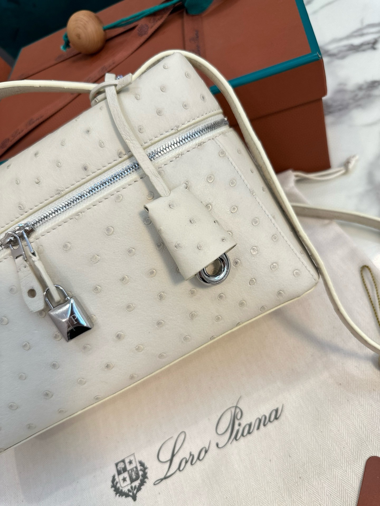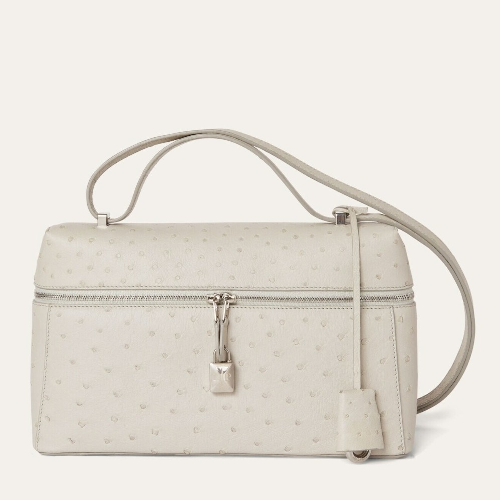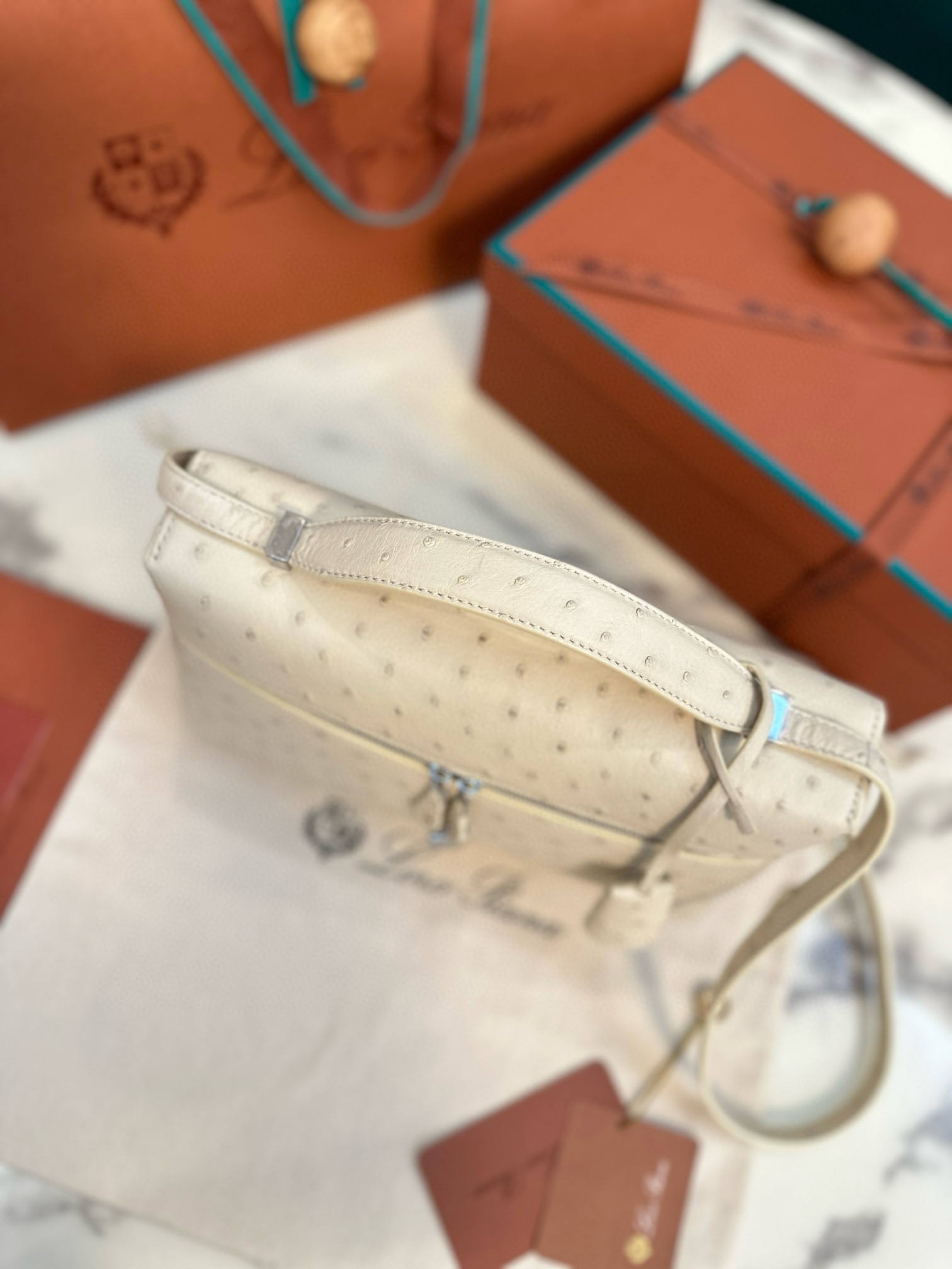 A sophisticated iteration of the Extra Pocket, crafted in ostrich embossed leather, this special treatment not only enhances its beauty but also makes it irresistibly soft to the touch. With a more modern and fresh look, it features the new, redesigned Loro Piana charms - now three-dimensional, removable, exquisite and feminine. The versatile two-way strap allows the bag to be carried over the shoulder, across the body or elegantly in the hand.