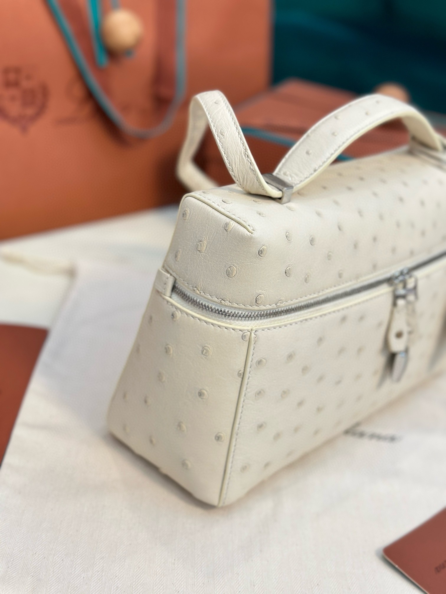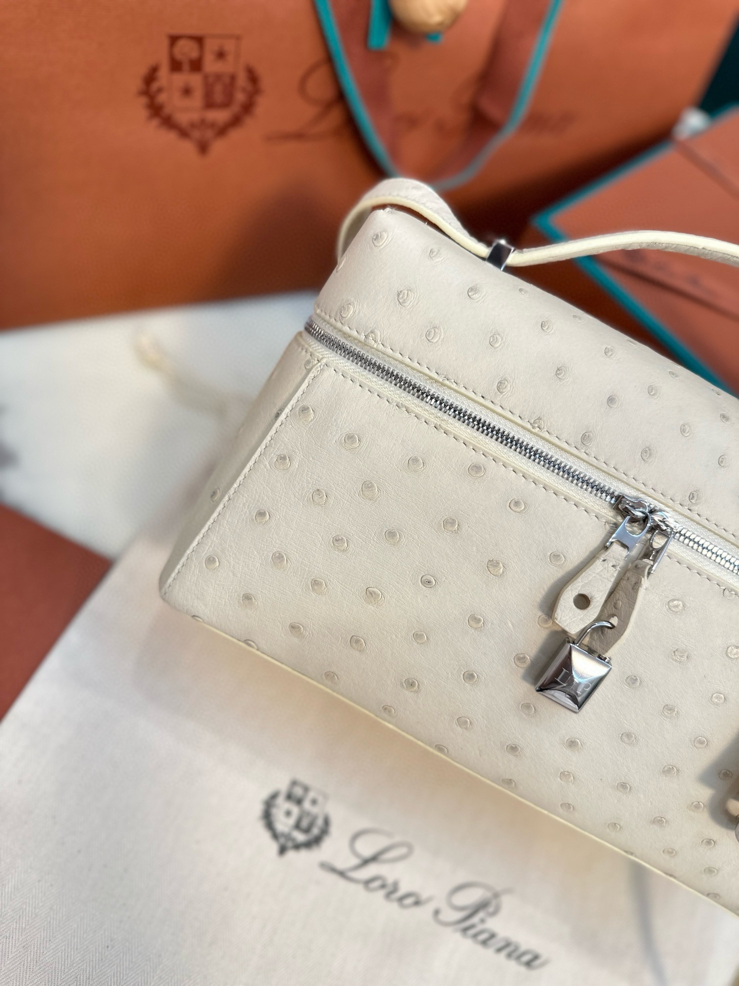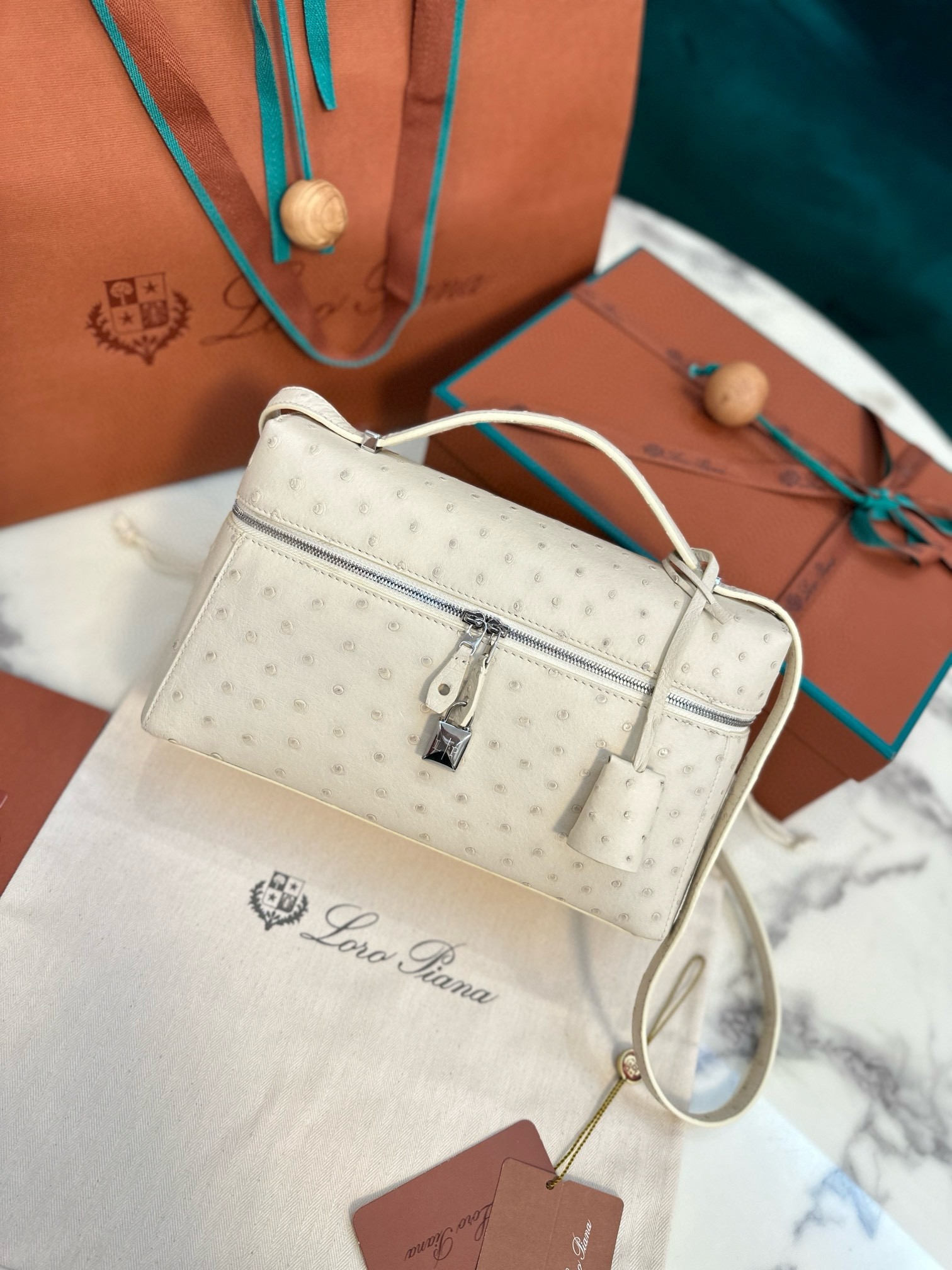 A sophisticated iteration of the Extra Pocket, crafted in ostrich embossed leather, this special treatment not only enhances its beauty but also makes it irresistibly soft to the touch. With a more modern and fresh look, it features the new, redesigned Loro Piana charms - now three-dimensional, removable, exquisite and feminine. The versatile two-way strap allows the bag to be carried over the shoulder, across the body or elegantly in the hand.