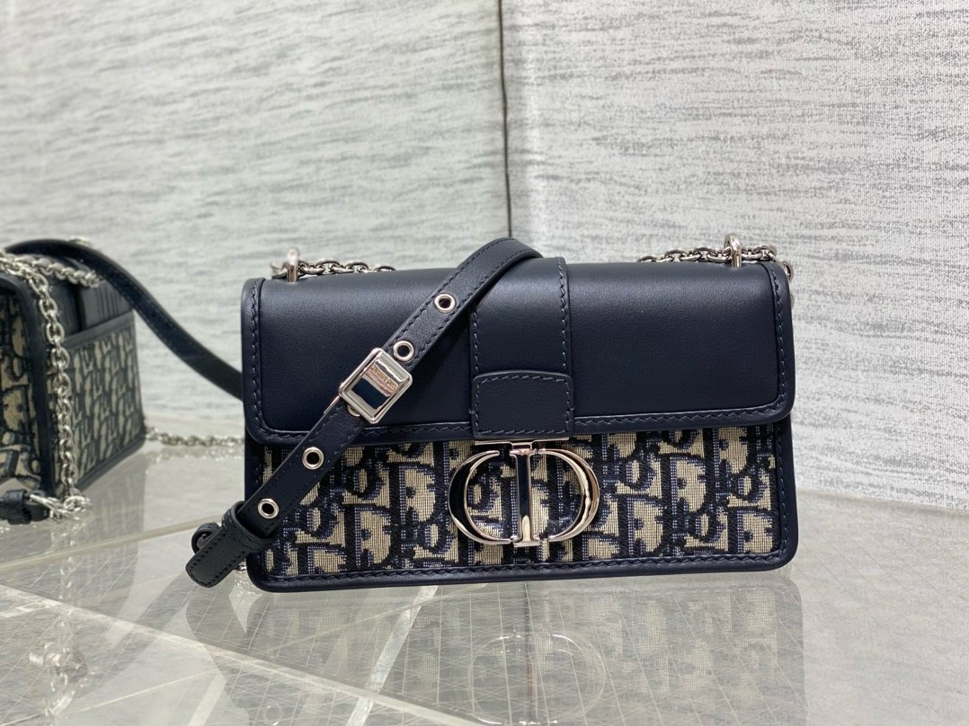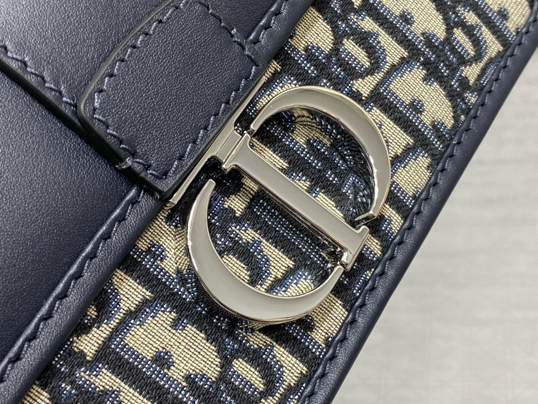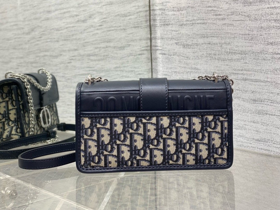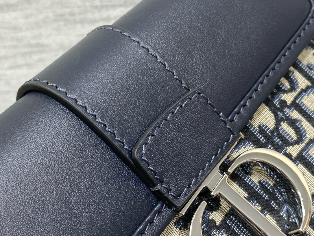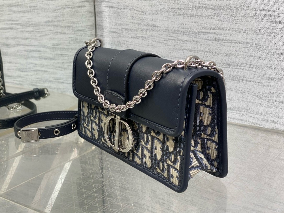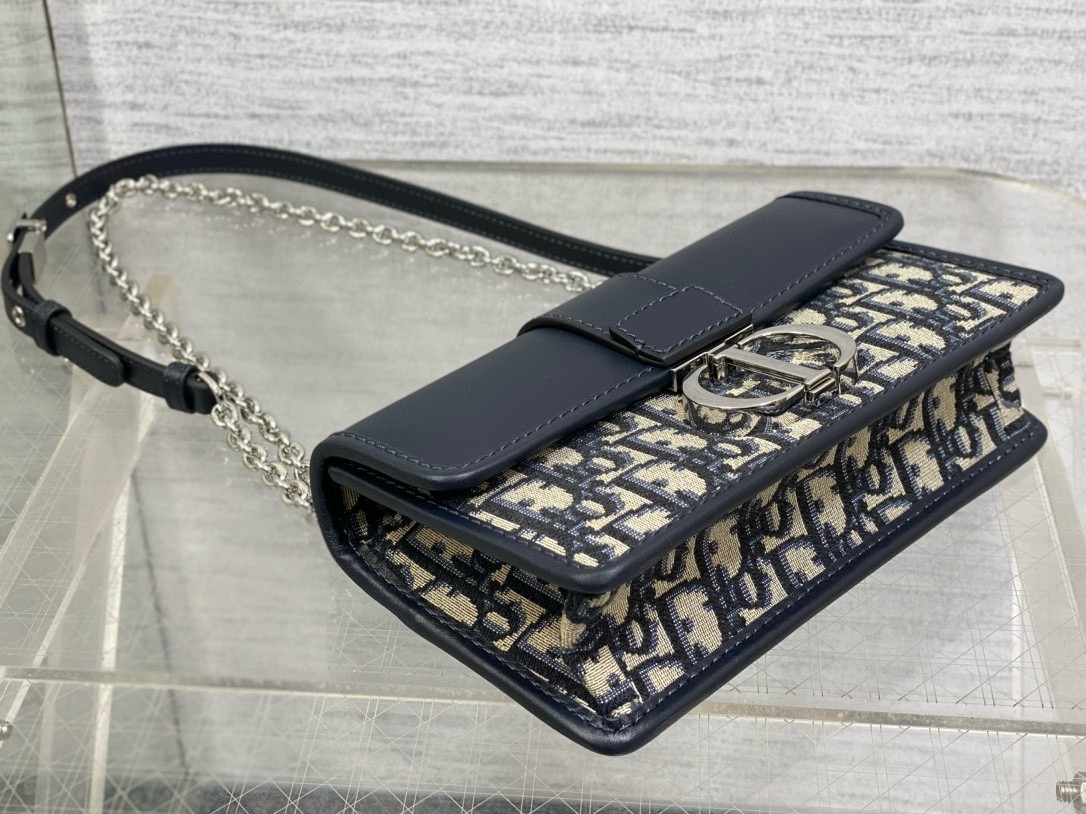 The East-West bag with chain enhances the 30 Montaigne line with a timeless and elegant design crafted in blue Dior Oblique jacquard. The tonal smooth calfskin flap features a silver-finish metal CD clasp, inspired by the seal of a Christian Dior perfume bottle. Other details, like the embossed 30 Montaigne signature on the back, highlight the streamlined style. The removable chain strap has a leather insert that allows the bag to be comfortably carried by hand, worn over the shoulder or crossbody.