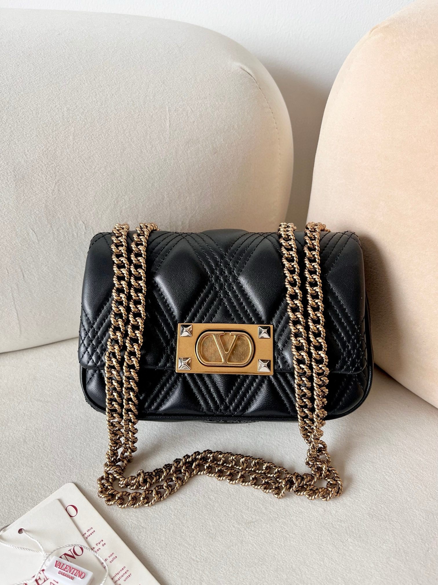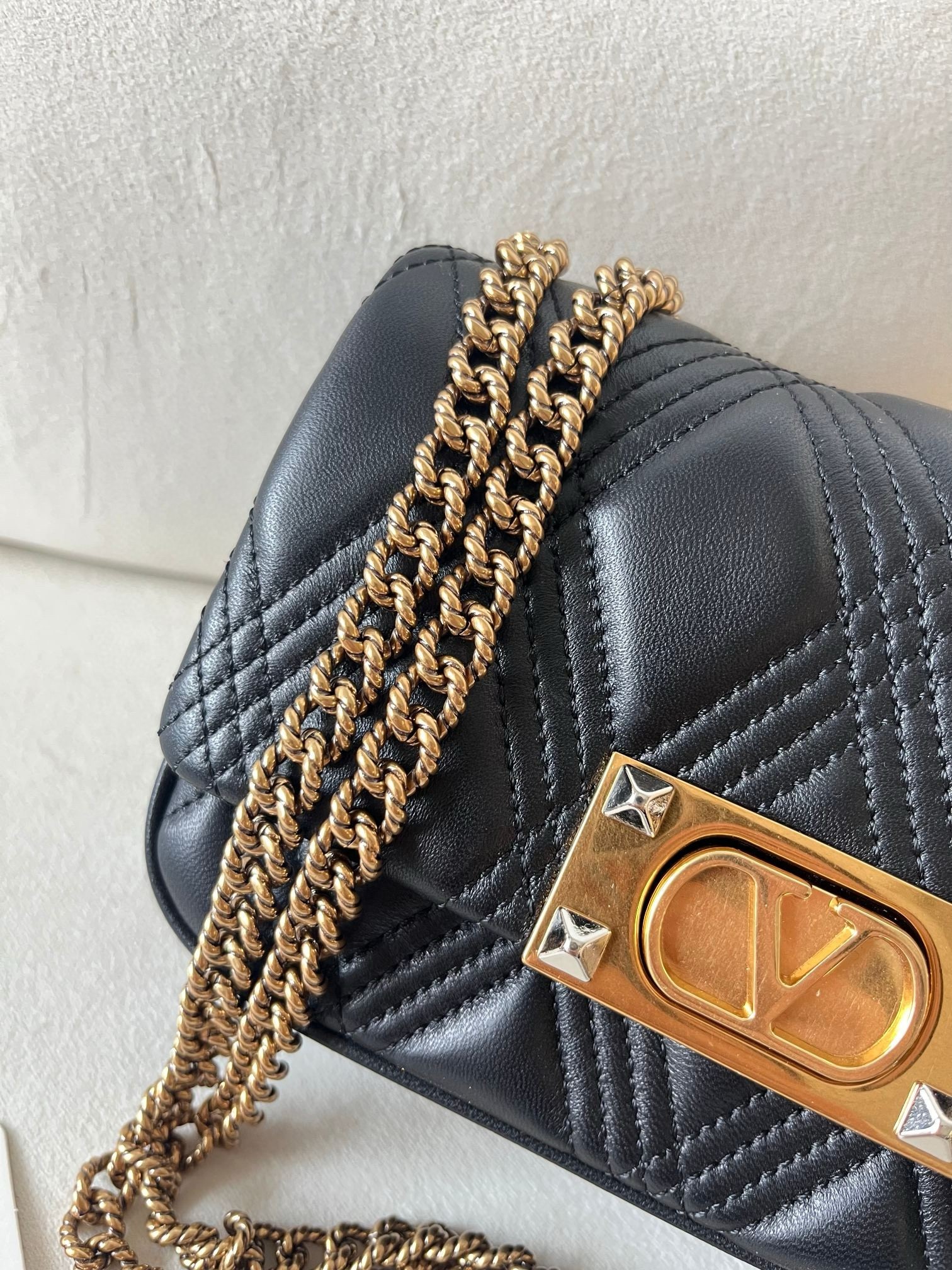 Valentino Garavani's Quiltie 67 small shoulder bag is here to carry your look with a chic touch thanks to the quilted construction showcasing a diamond pattern outlined by tone-on-tone stitching. This bag is a perfect blend of elegance and Italian luxury. Made from nappa leather and featuring a gold chain, it is a masterpiece of Made in Italy design. Whether for a special occasion or everyday use, this bag offers both style and sophistication.